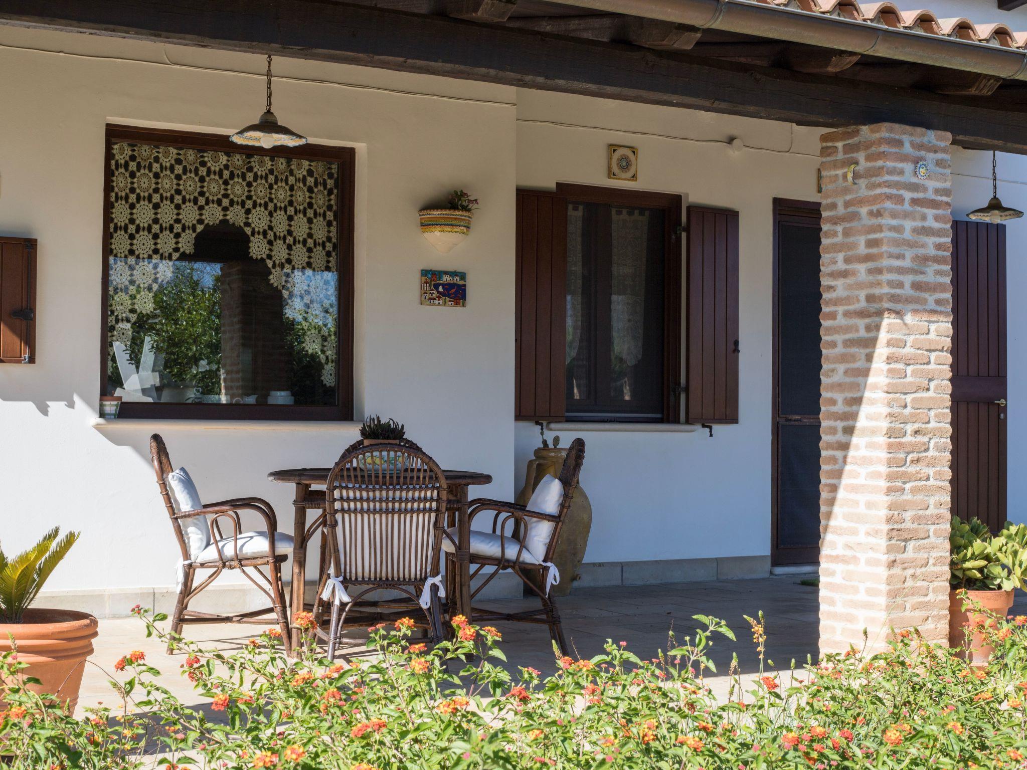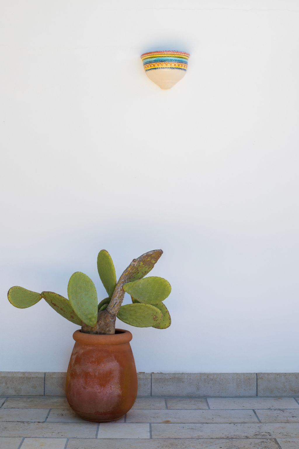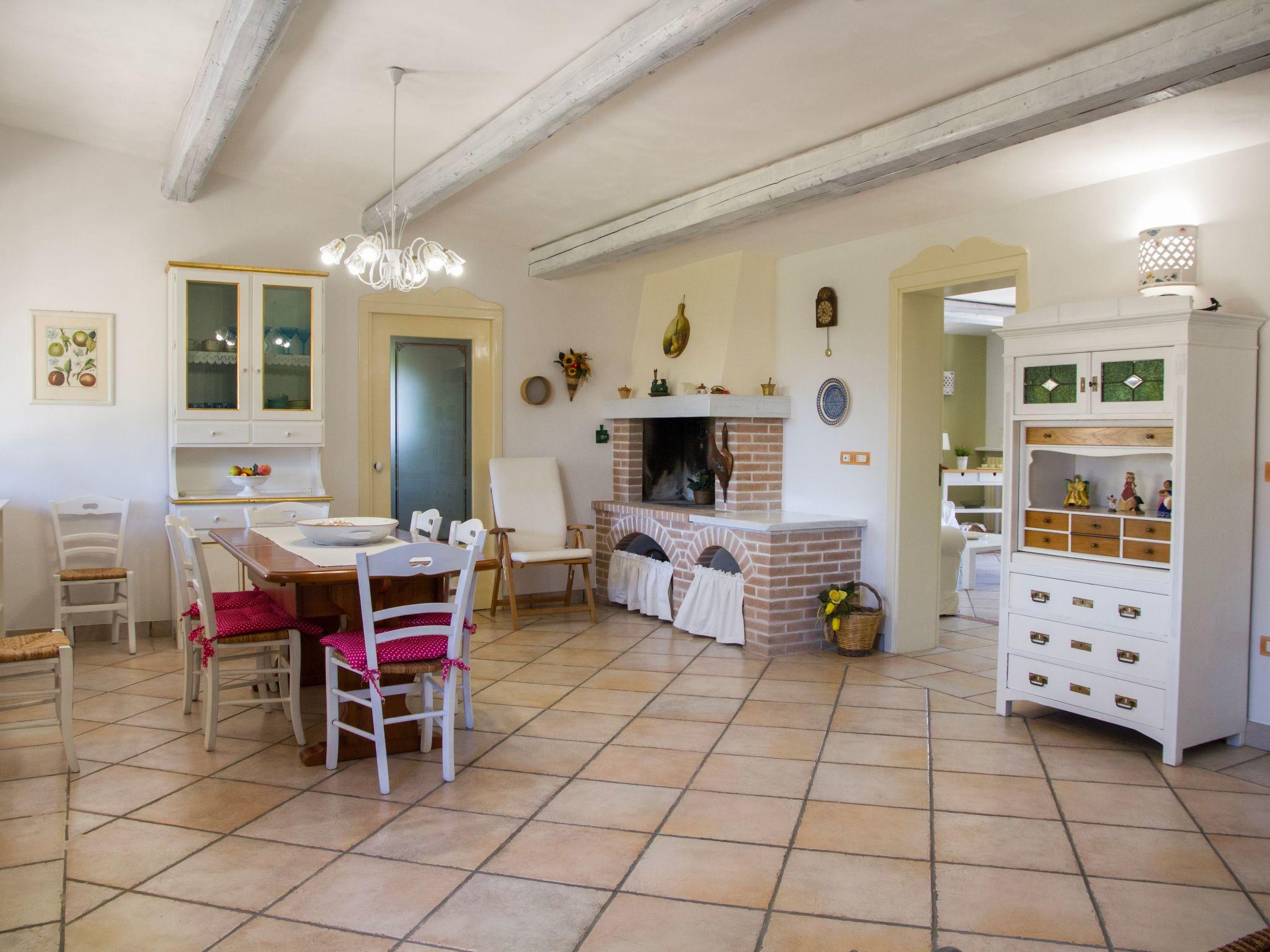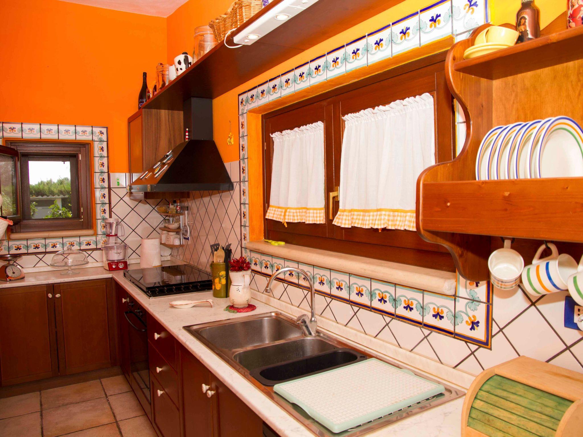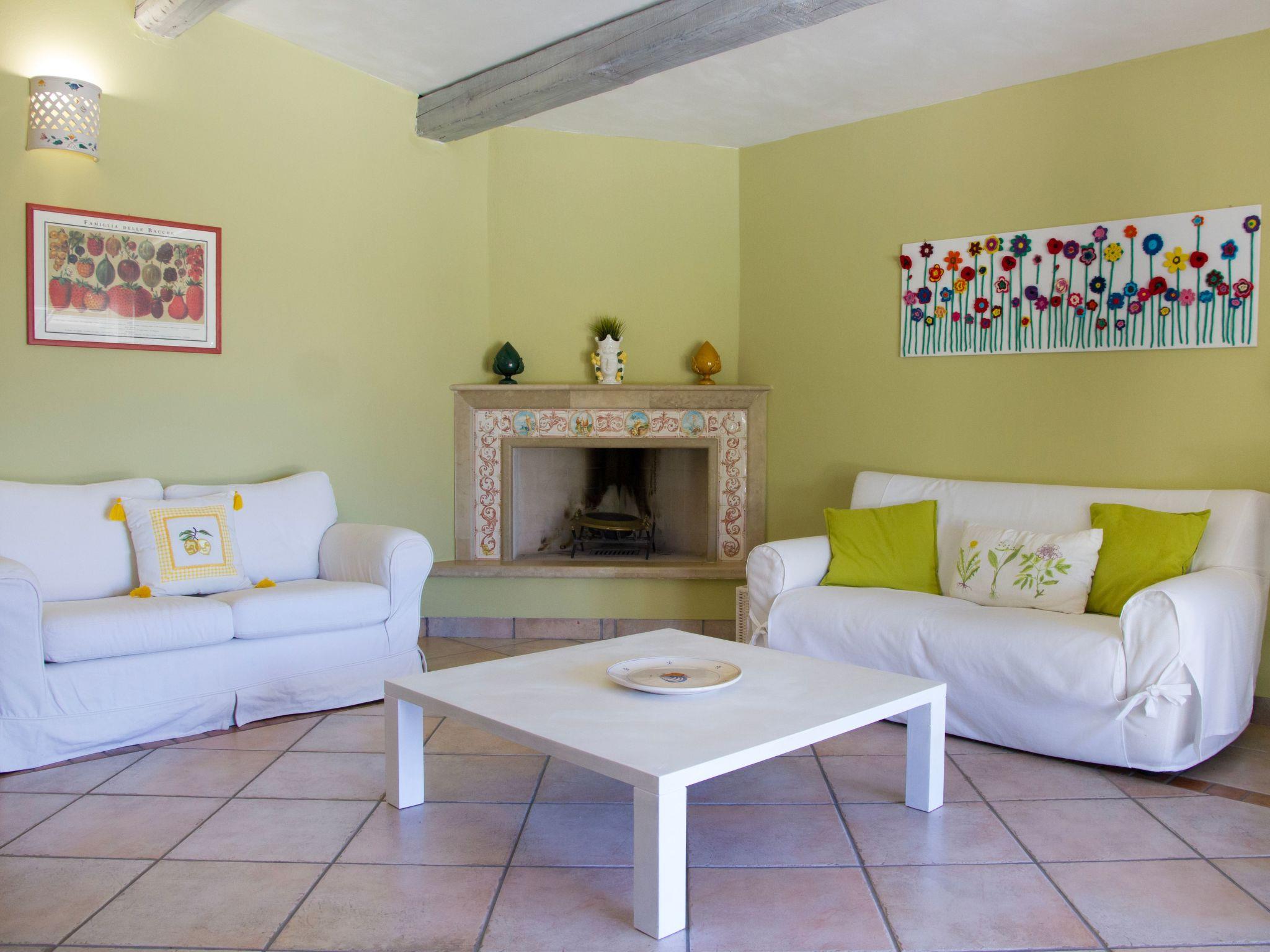 The house is on the ground floor and covers an area of about 140 square metres and is characterised by Mediterranean furnishings, where white dominates and offers its guests a feeling of complete relaxation and above all privacy. Large living room entrance with fireplace, dining table that can seat up to 16 people, relaxation area with stereo system for listening to music, digital terrestrial TV, bookcase with reading texts and a collection of comics for the little ones. The kitchenette is equipped with a gas hob, electric oven, dishwasher, refrigerator, microwave oven and other kitchen utensils, cutlery and pans. The master bedroom with a double bed has its own bathroom. There is also a bedroom with two beds (can be made into a double bed on request) and a bedroom with two bunk beds. The second bathroom is shared between the latter two rooms. All windows are fitted with mosquito nets. Only on request (separate cost to be requested on site) is it possible to book the cook for the preparation of tasty and delicate dishes of Salento/Mediterranean cuisine.