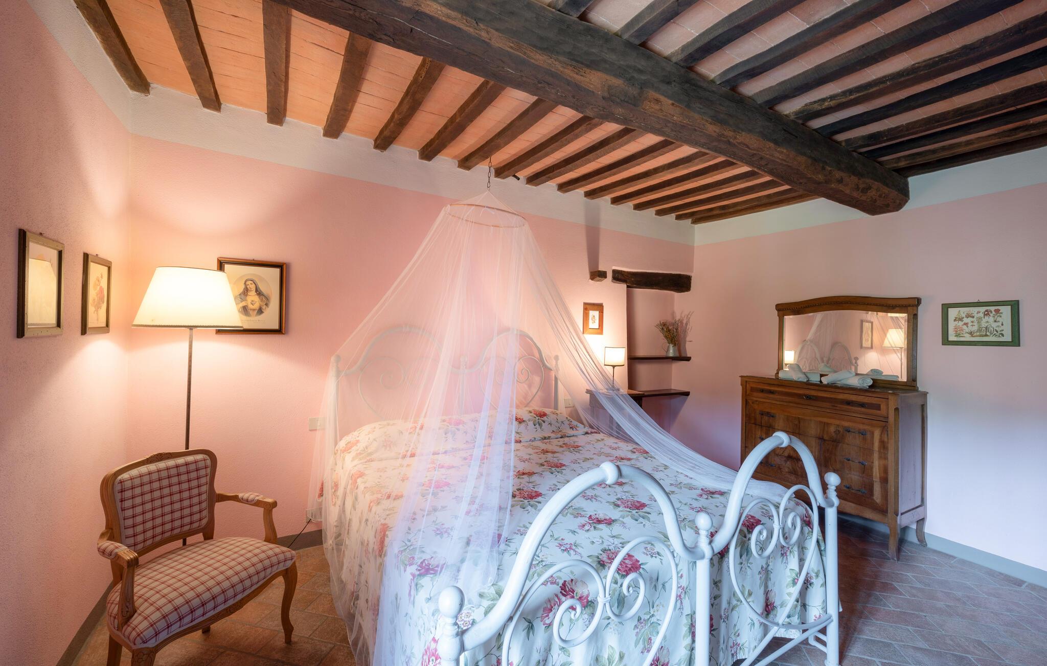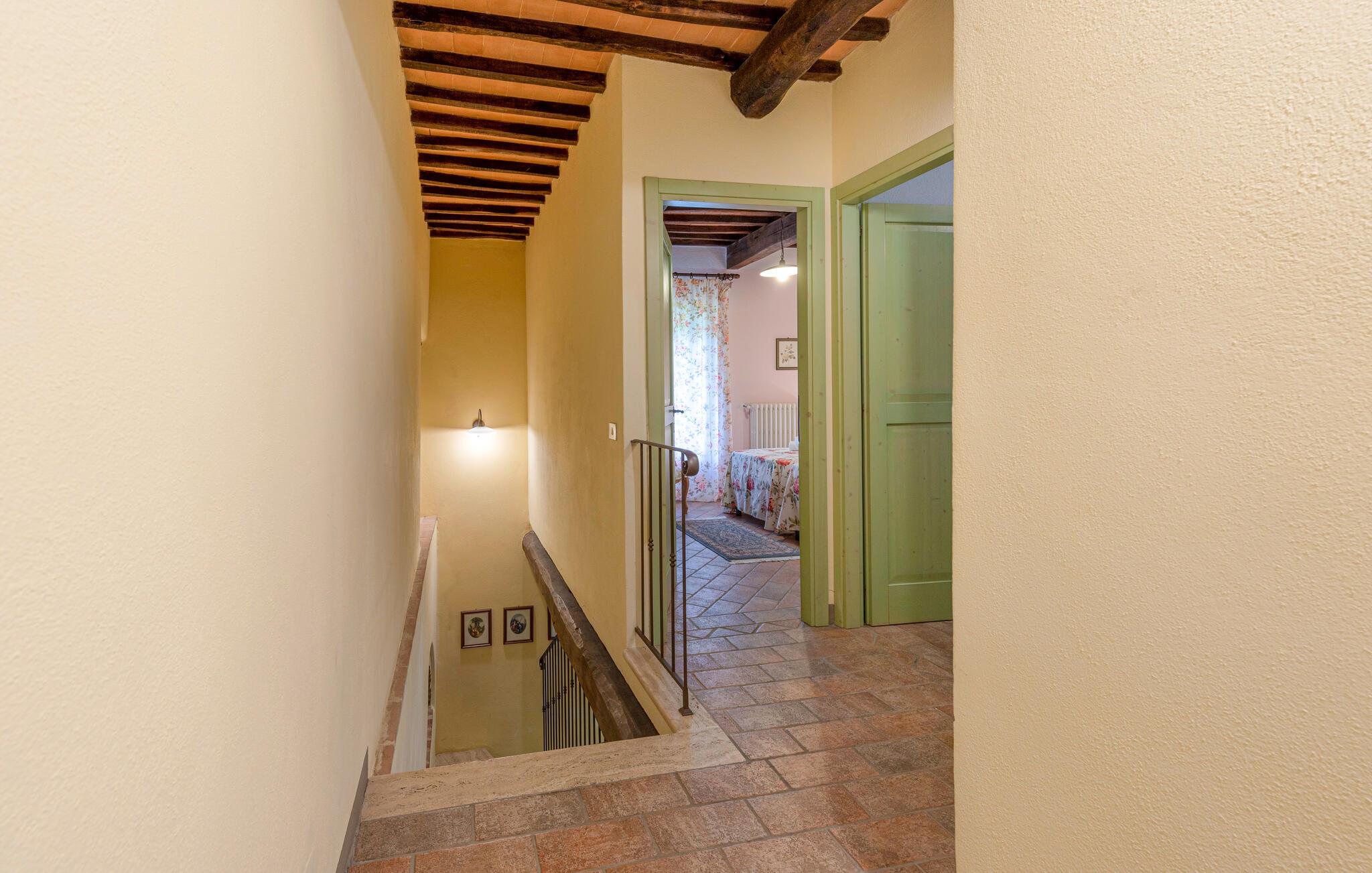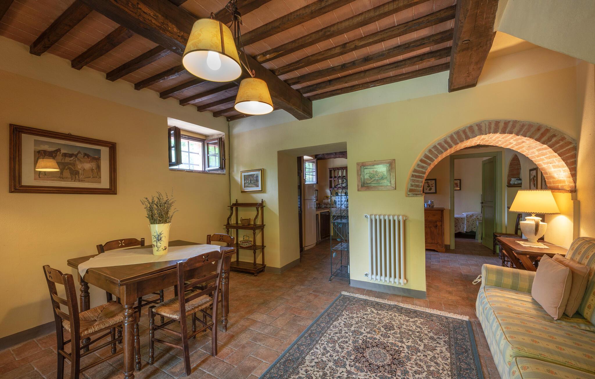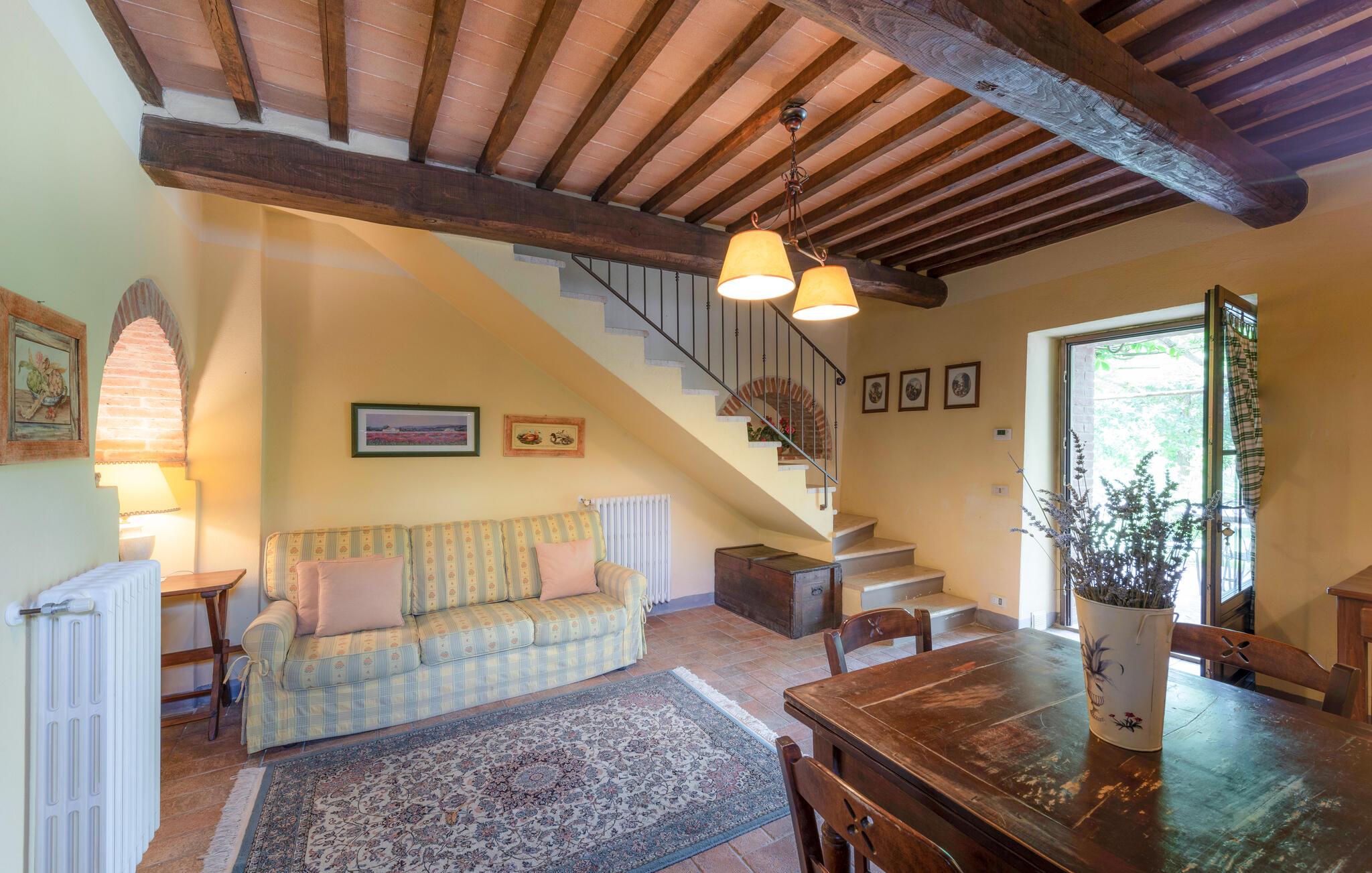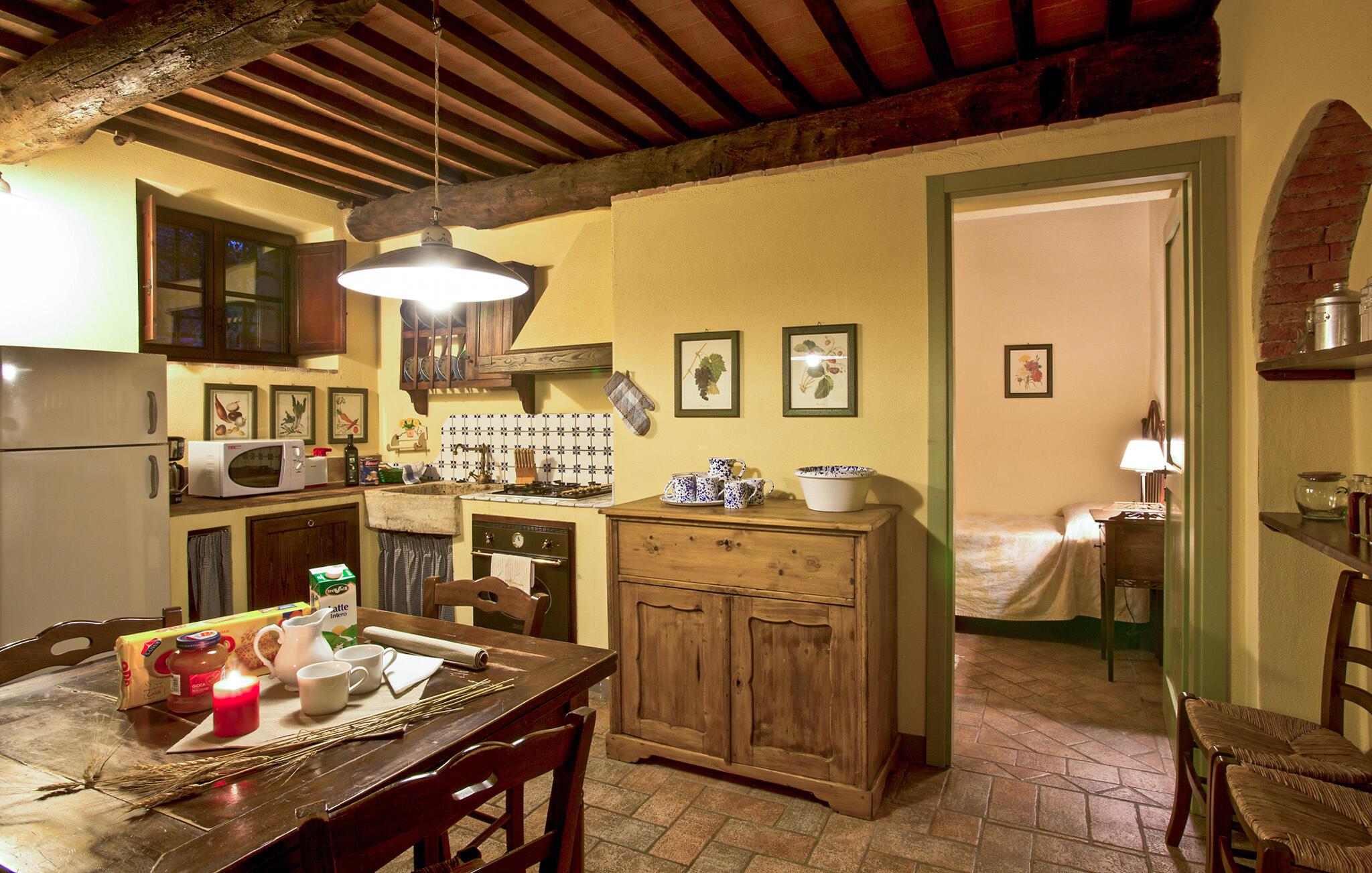 Denne hyggelige lejlighed er placeret på et karakterfuldt toscansk landsted og har fine autentiske detaljer. Synlige træbjælker i loftet og rustikke møbler skaber en historisk atmosfære, der hurtigt vil få jer til at føle jer hjemme. Slap af med god musik, nyd en sjov spilleaften eller lav lækre måltider i det moderne køkken.