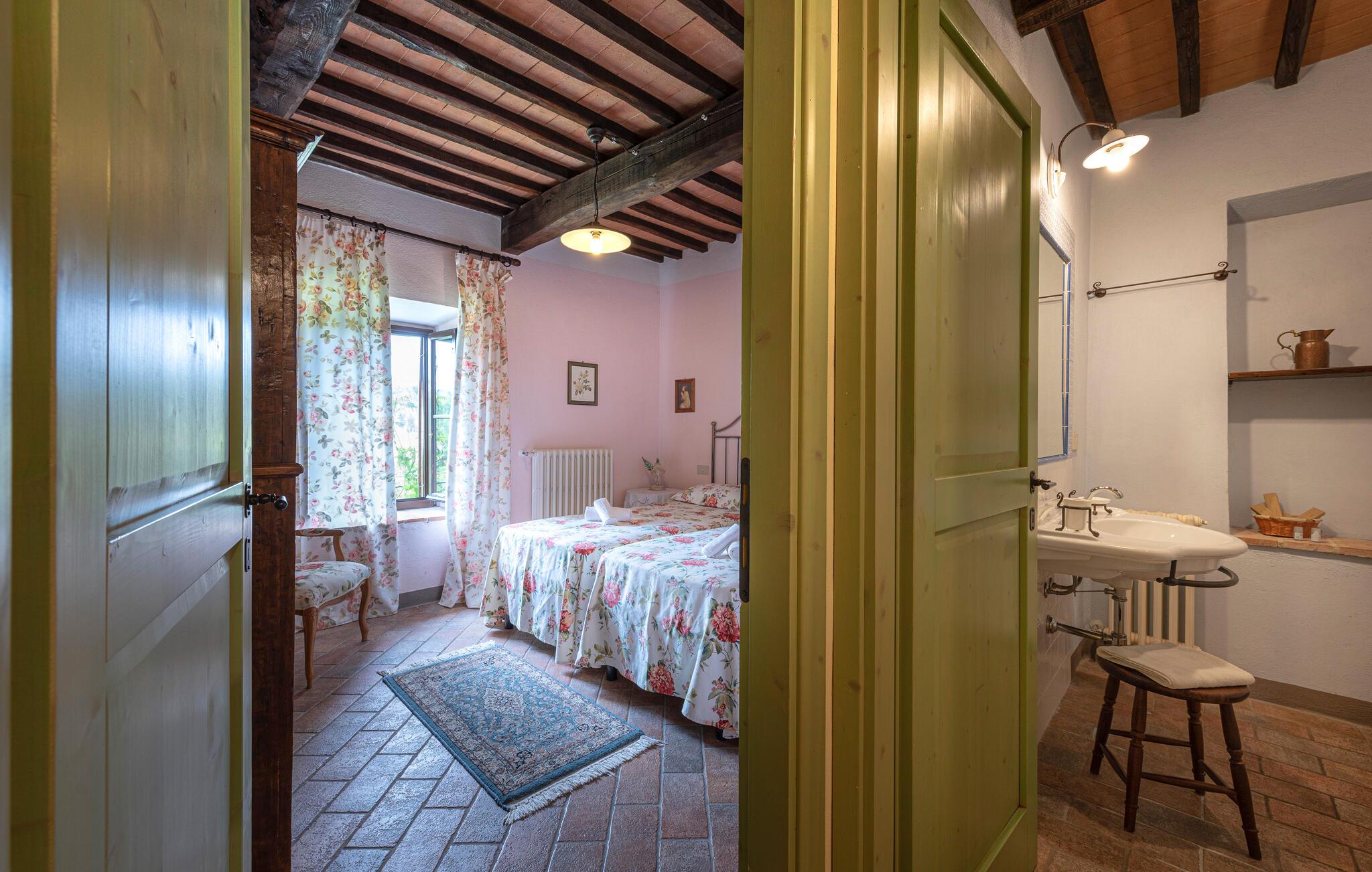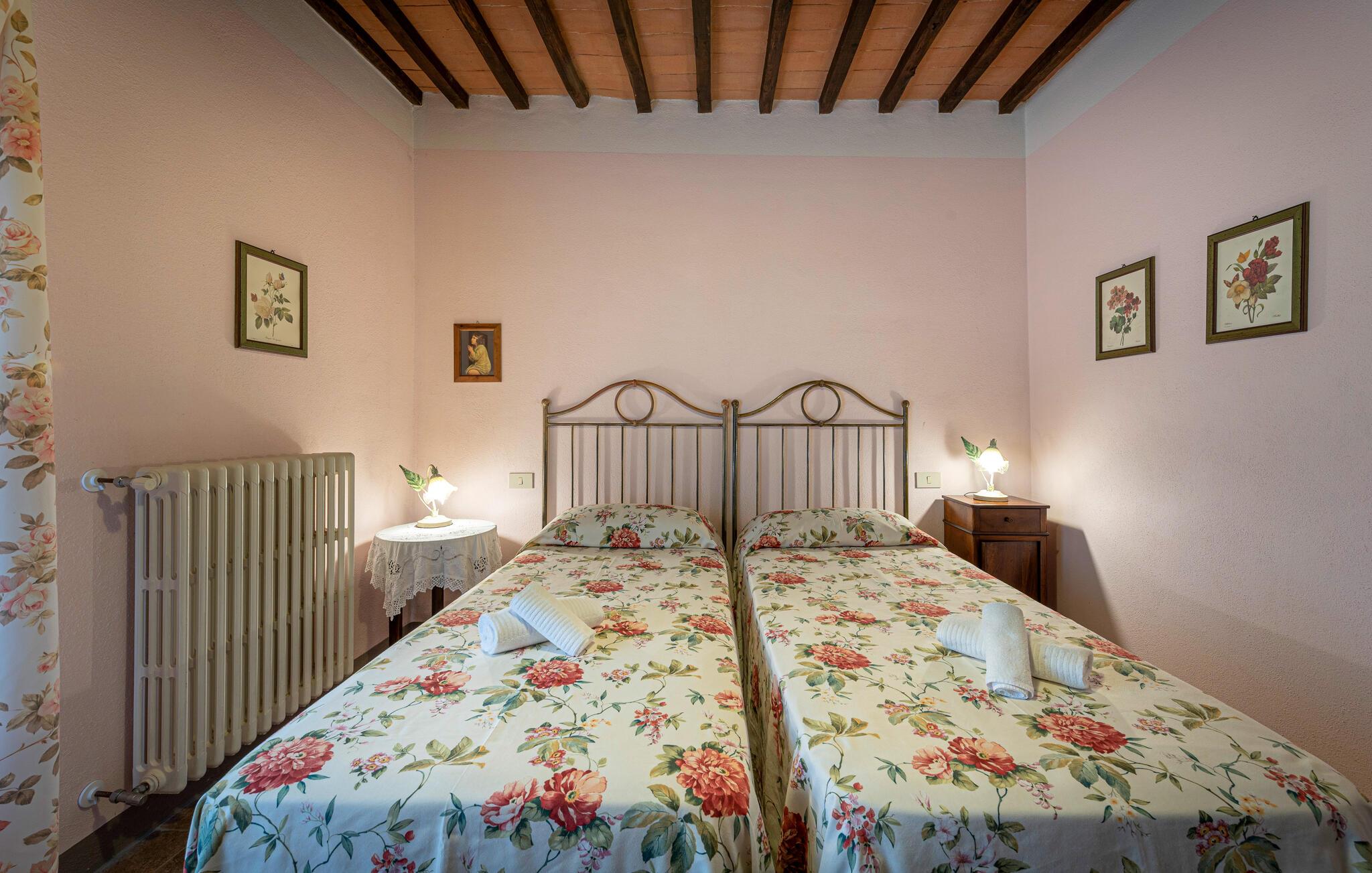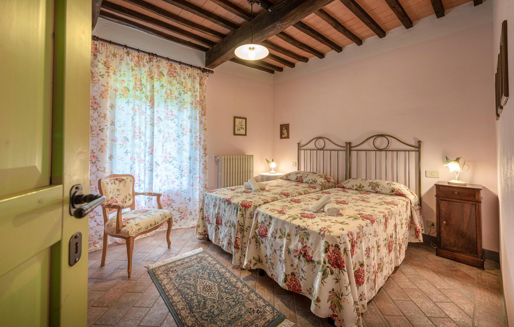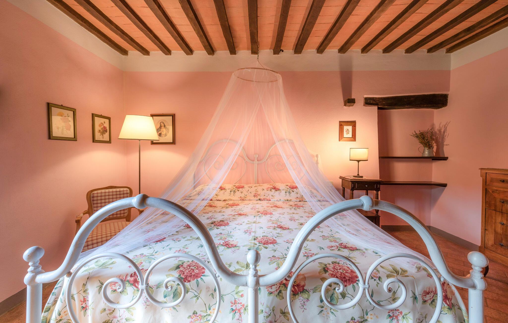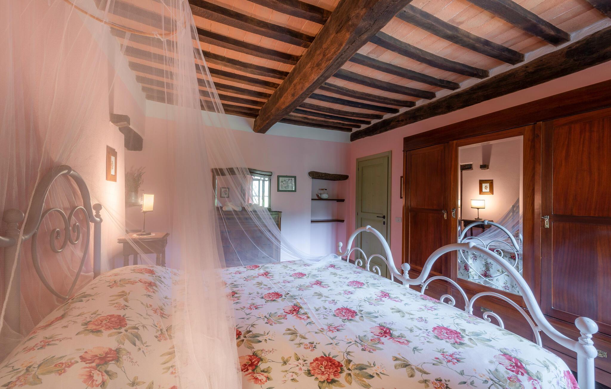 Denne hyggelige lejlighed er placeret på et karakterfuldt toscansk landsted og har fine autentiske detaljer. Synlige træbjælker i loftet og rustikke møbler skaber en historisk atmosfære, der hurtigt vil få jer til at føle jer hjemme. Slap af med god musik, nyd en sjov spilleaften eller lav lækre måltider i det moderne køkken.