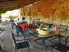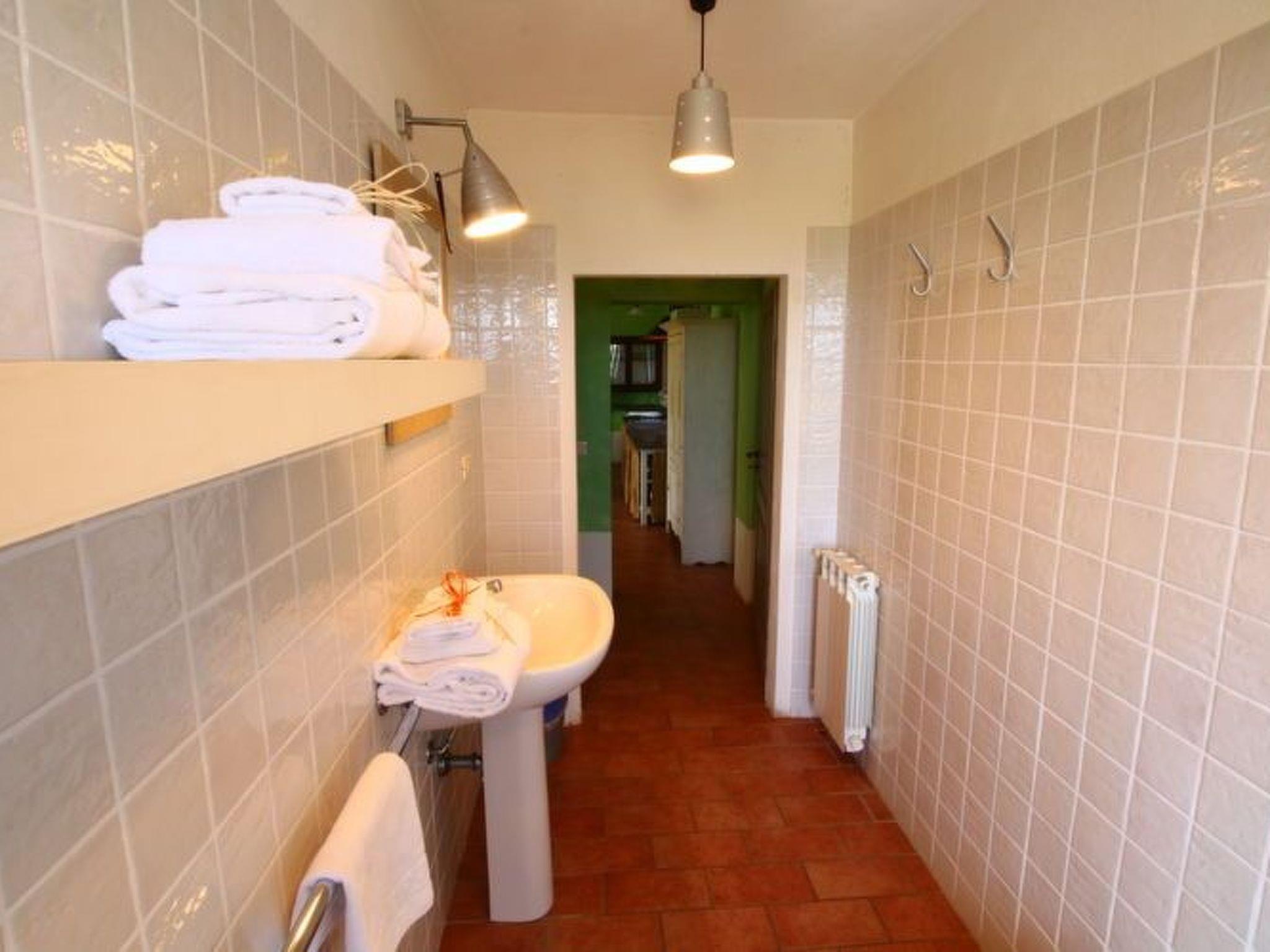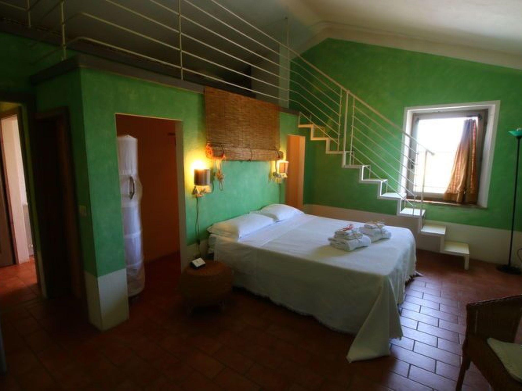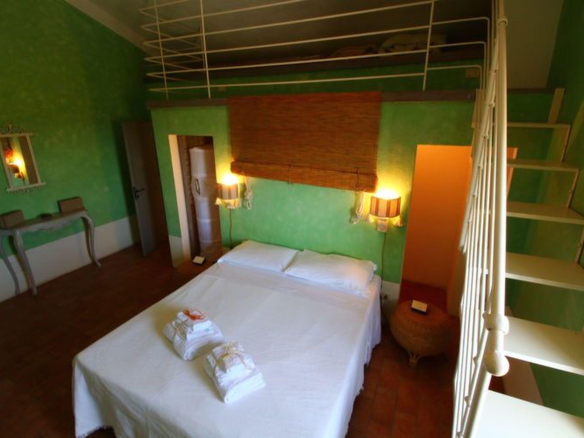 The holiday apartment is on the first floor of the second house. It comprises a bedroom with a double bed, to which a cot can be added, a living room with a kitchen space, and a bathroom with a shower and bidet. The living room has a sofa bed for two people. The kitchen with a dining corner is equipped with a hob with four rings, a coffee machine and Italian coffee maker, a toaster and a fridge.
