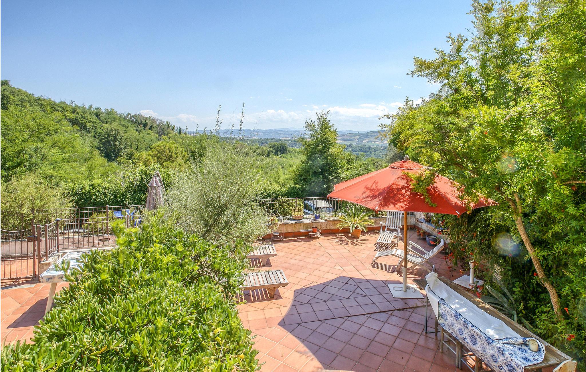 Den store tagterrasse er smukt tilgroet og udstyret med liggestole og parasoller, så I kan beundre den flotte udsigt dagen lang.