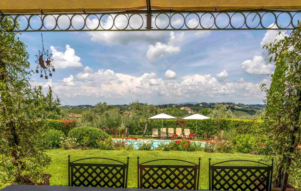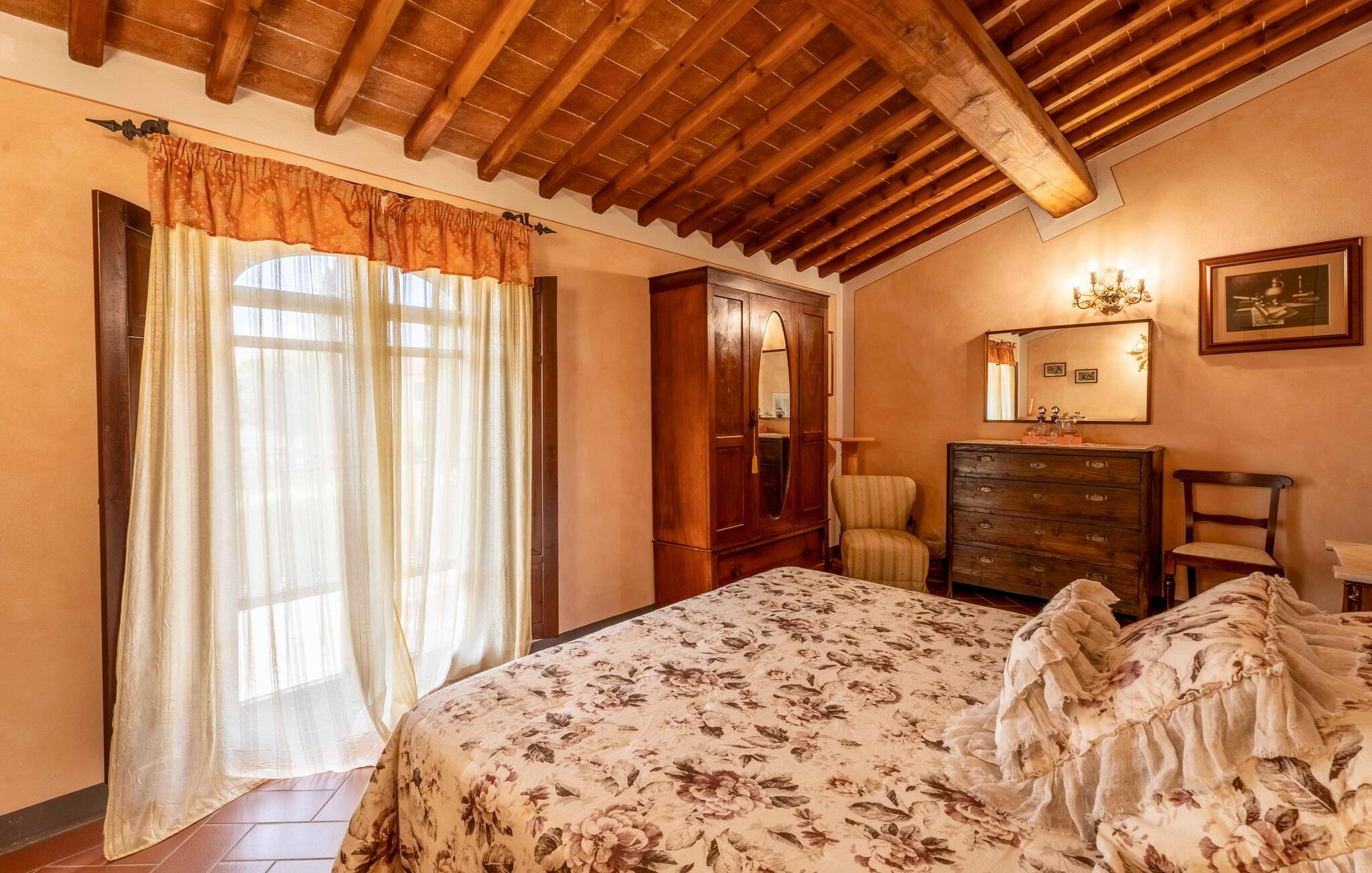 Oplev en afslappende ferie i dette stilfulde landsted, der kombinerer komfort, tradition og toscansk livsstil. Tilbring jeres tid omgivet af maleriske bakker med udsigt over de grønne områder og i en absolut rolig beliggenhed. Føl jer hjemme i den rummelige opholdsstue med pejs, komfortable lænestole og klassiske møbler. Nyd dagens måltider ved det store spisebord eller slap af med et glas vin. Køkkenet er indrettet i rustik stil, tilbyder moderne udstyr og direkte adgang til haven.