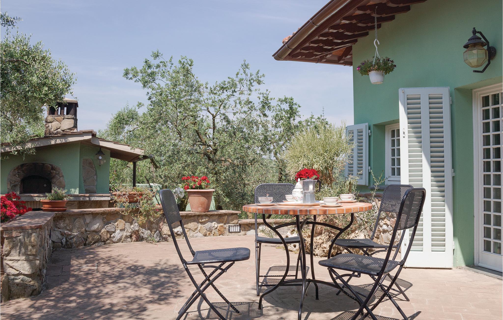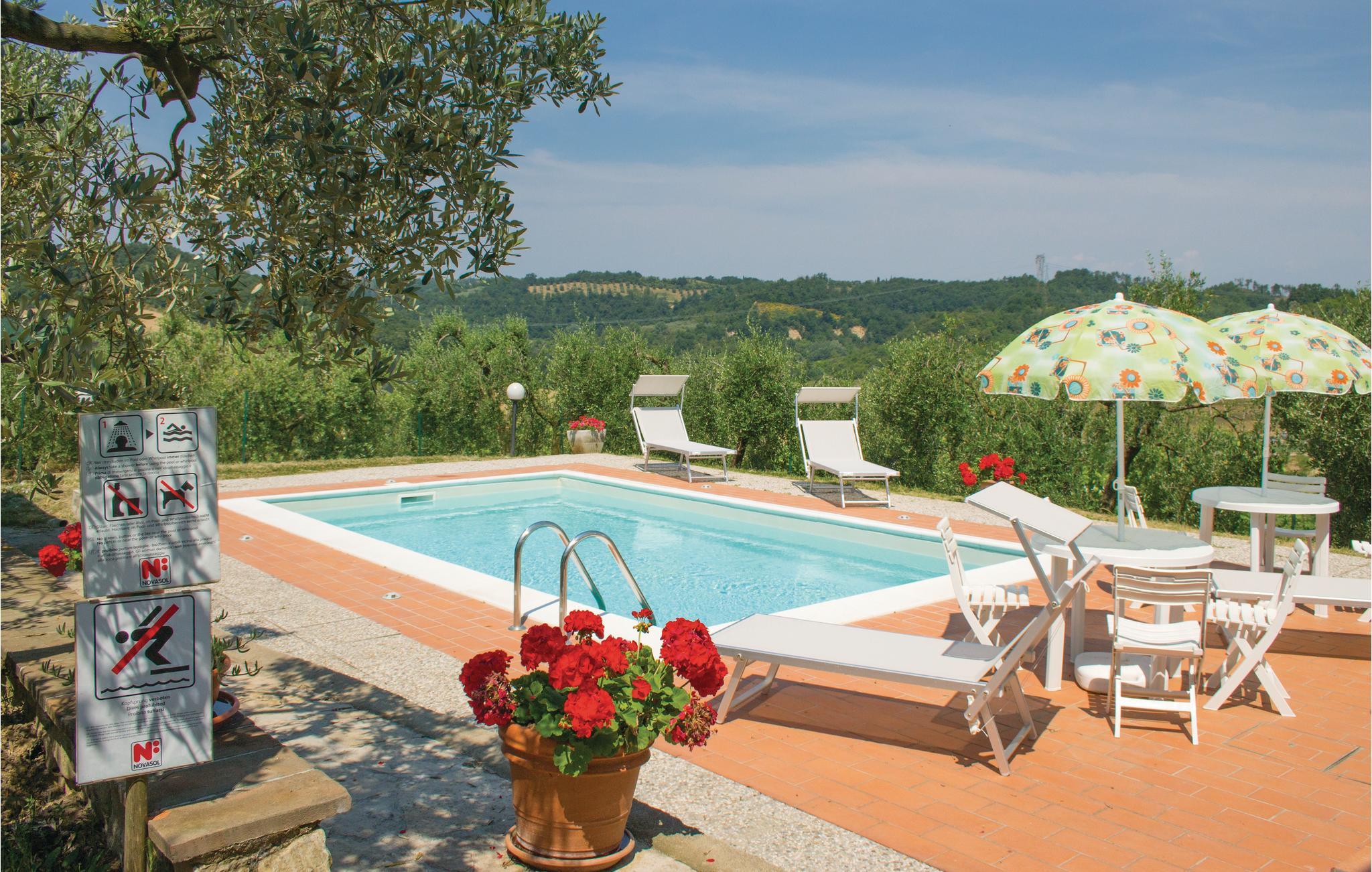 Afslapning, privatsfære og komfort? Så er dette feriehus det rette valg. Huset, er moderne og meget lyst, har egen pool, en charmerende atmosfære og ligger i landlige omgivelser i Toscana. Huset er delt op i et opholdsområde med køkken og spisehjørne og to trin ned, en natafdeling med to soveværelser og et badeværelse. Haven er i to niveauer og rummer to udendørs opholdsområder (bord, stole og muret grill). Huset er romantisk omgivet af olivetræer. Poolen der ligger omgivet af skyggefulde oliventræer er dejlig at hoppe I efter en dag fuld af oplevelser i kunstbyerne Firenze (40 km), Siena (60 km) og San Gimignano (24 km). Ejer bor i den lave stueafdeling, med ugenert indgang bagfra.