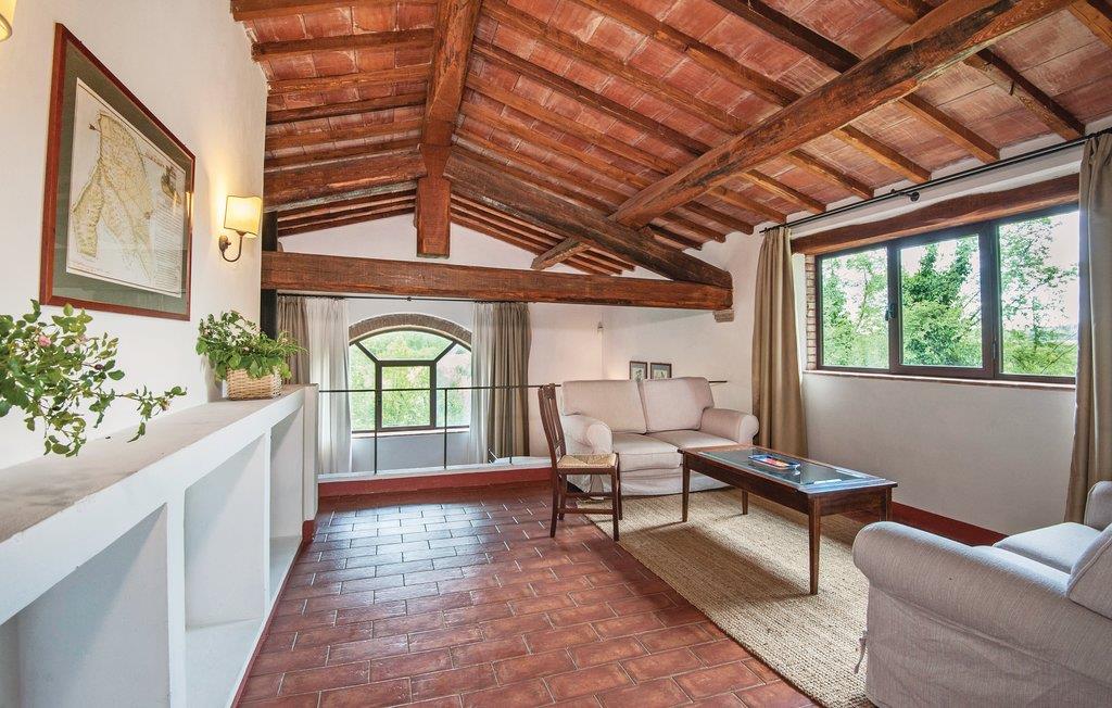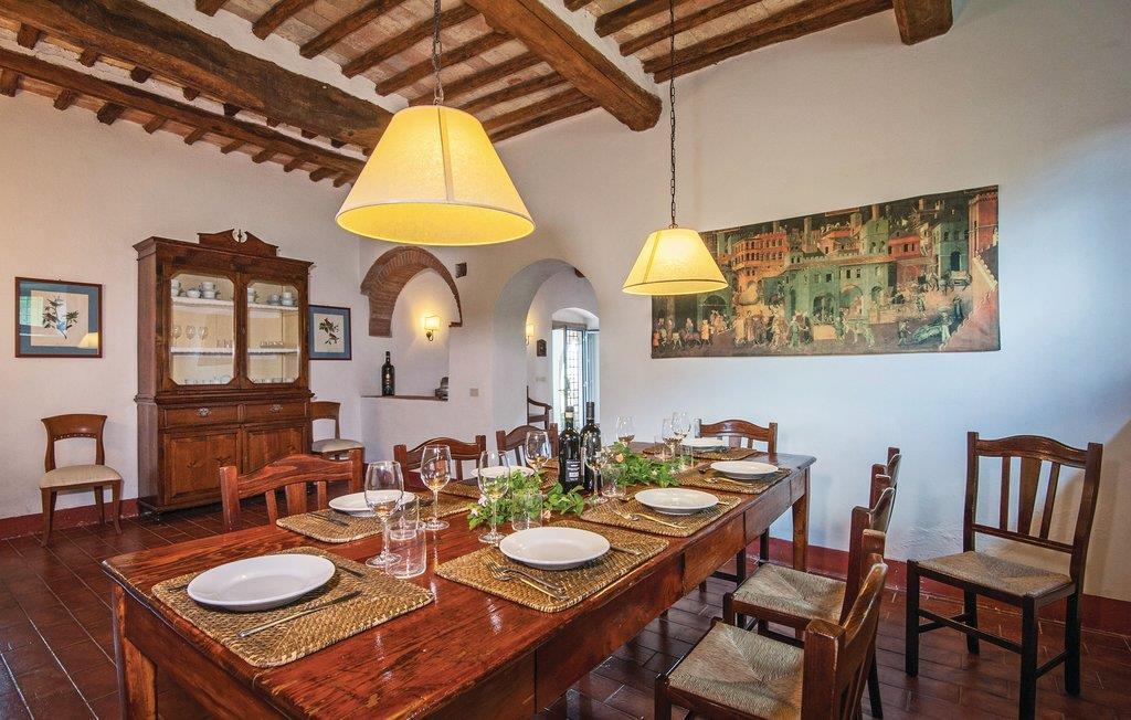 Denne vidunderlige ejendom er bygget som et gammelt bedehus i det 15. århundrede, i 1876 blev det forandret til et bondehus. I dag har det, takket være en vellykket restaurering, fået sin oprindelige pragt igen, men i form af et gods. Huset hører til de vigtigste virksomheder, der producerer olivenolie og vin. Det ligger i nærheden af Castellina i Chianti, på en bakke med vidunderlig panoramaudsigt til Chianti-distriktet ved Siena lige til Monteriggionis tårne. Have og udendørs områder, pool (uregelmæssig form), toilet/omklædningsrum. Tilkørsel ad 200 m grusvej. To timers daglig rengøring mandag til lørdag er inklusive. Hvis I spørger, og ikke inkluderet i prisen: Husholdningshjælp (ekstra timer, hvis I spørger), kok, udskiftning af sengetøj og håndklæder midt på ugen, smagsprøver af olivenolie og vin (egen fremstilling) i kælderen fra middelalderen. I kan deltage i et typisk aftensmåltid (buffet) med vinsmagning, der organiseres hver uge af virksomheden (betales på stedet). I en sidebygning (60 m²) ca. 60 meter fra hovedhuset er det femte soveværelse med bad og en dagligstue med køkkenniche.