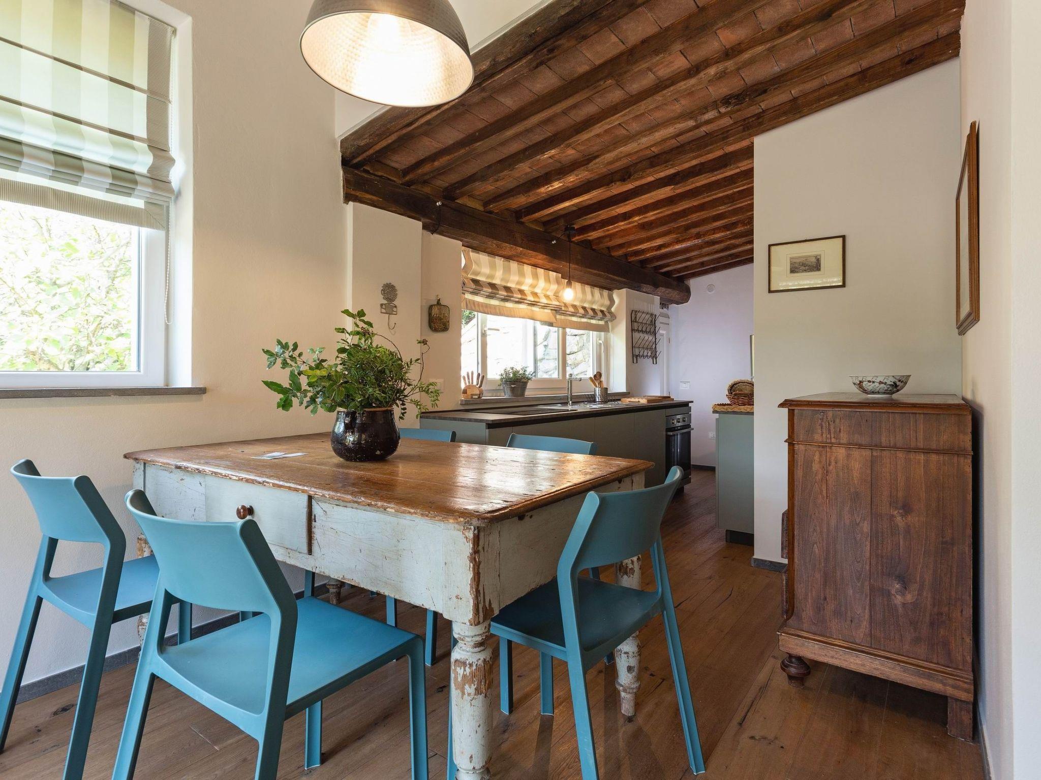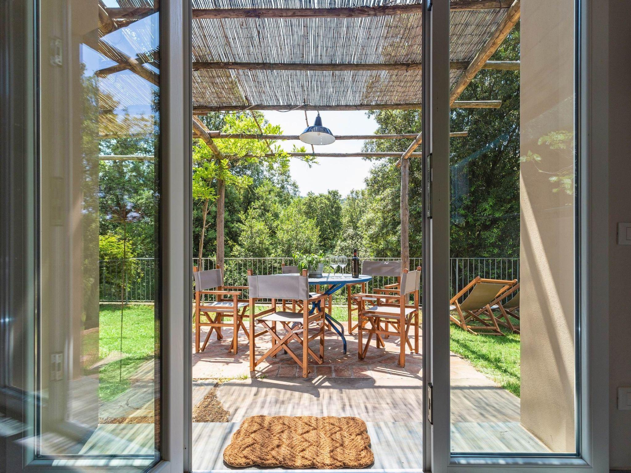 Two-bedroom cottage: a beautiful and cosy 60 m² cottage, located slightly uphill from the main house, with a large furnished private terrace, barbecue and garden view. The one-storey cottage can accommodate up to 5 persons: a double bedroom, a triple bedroom, a living room with kitchenette (5-burner gas cooker, refrigerator, oven, toaster, kettle, coffee maker and American coffee maker) and a bathroom with shower. Facilities: air conditioning in the bedrooms only, mosquito nets, Wi-Fi and hairdryer. This beautiful holiday home, a former mill converted into three cosy flats, is located just 600 metres from Pomaia, where you will find the nearest shops and restaurants. It is a beautiful property nestled in an idyllic landscape, surrounded by olive trees, small woods and a small stream with a small lake (swimmable when the water does not dry out). From time to time, some local wild animals (hedgehogs, hares, foxes, pheasants) can be seen living undisturbed along the stream or in the garden. The communal garden also has several fruit trees, a hot tub (open from mid-May to the end of September) and a veranda where guests can relax. Along the stream and in the garden are gazebos and reading corners where you can relax and enjoy the lush nature. The coast and the sea at Castiglioncello are 13 km away. Cecina is 20 km away, Pisa 40 km, Volterra 45 km, San Gimignano 55 km, Florence 95 km. The house can be reached from Pomaia via a 400 m dirt road.