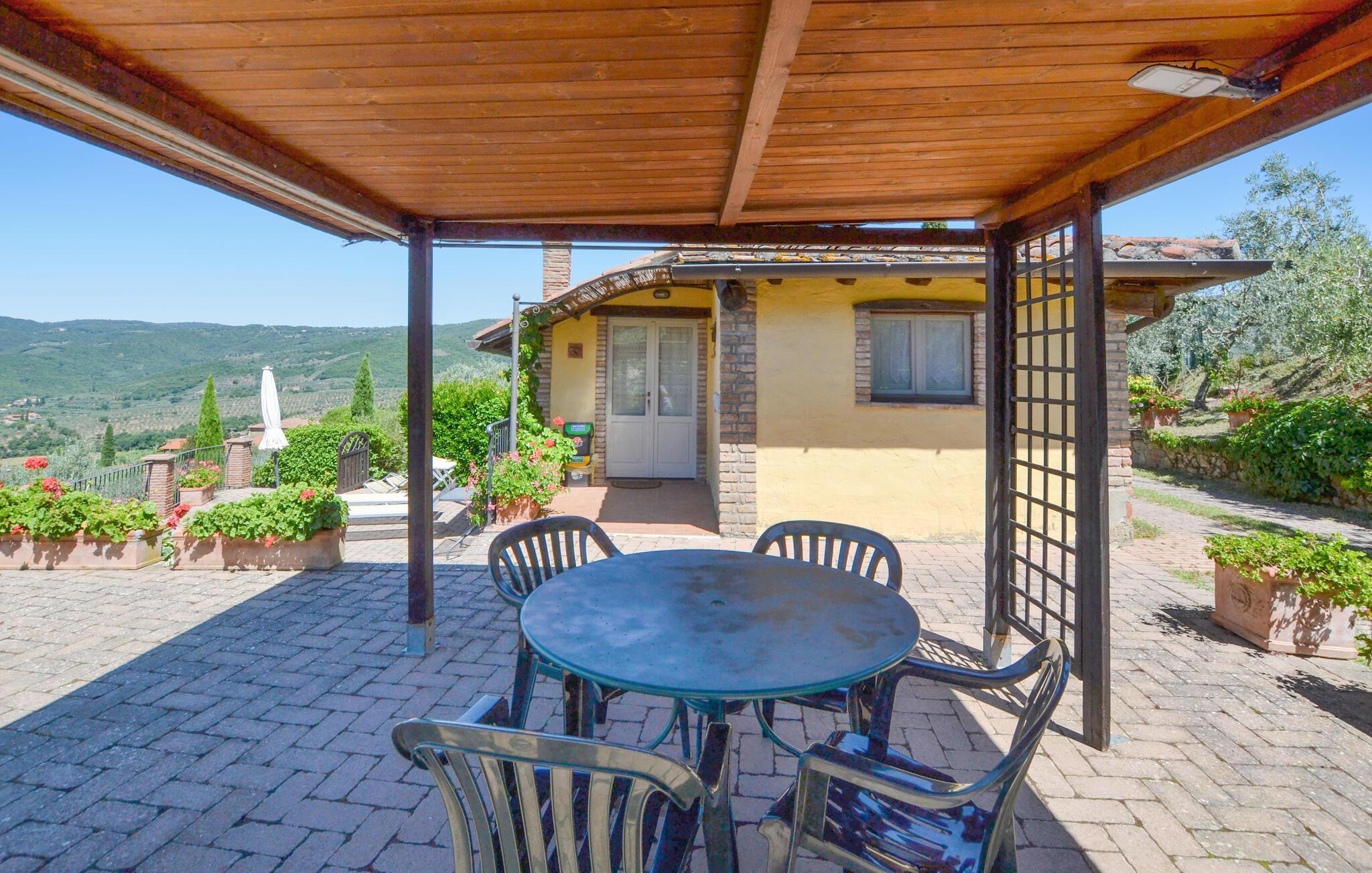Der er lagt op til vidunderlig ferie i disse idylliske omgivelser som et par eller med den lille familie i dette lækre hus. Indretningen fremstår autentisk og varm og krydres med mange gode faciliteter, der får jer til at komme helt ned i tempo og bare nyde jeres feriedage. Glæd jer til mange solrige stunder på verandaen eller den store terrasse. Når solen bliver lige det varmeste, kan I tage en dukkert i den fælles pool. Fra både haven, terrassen og poolen får I en storslået udsigt over landskabet.