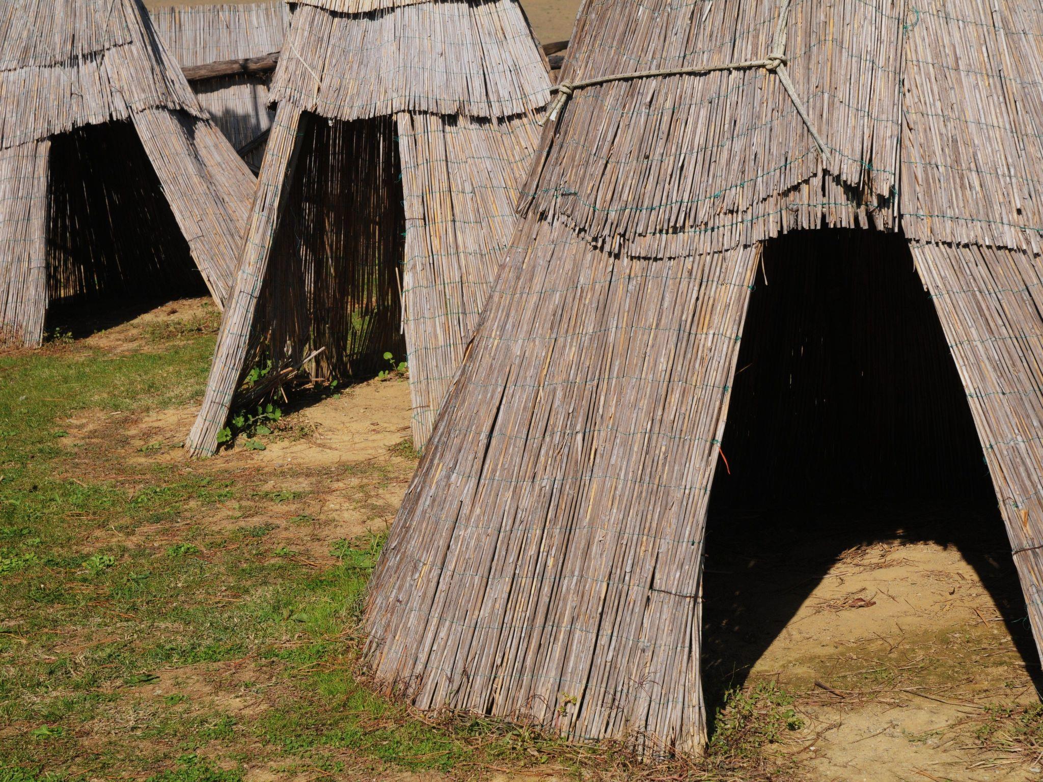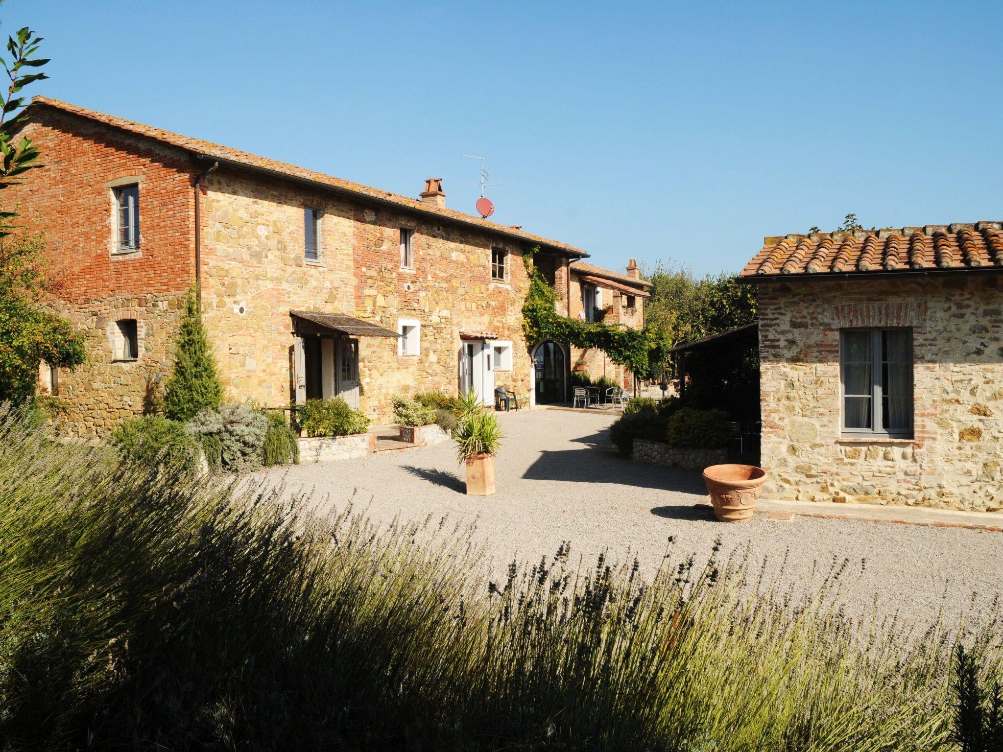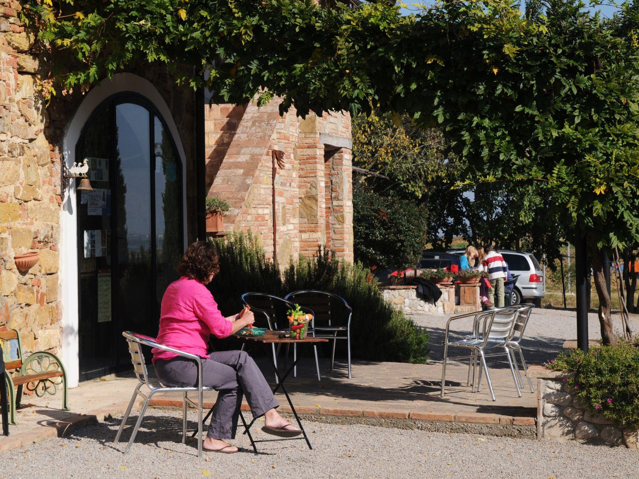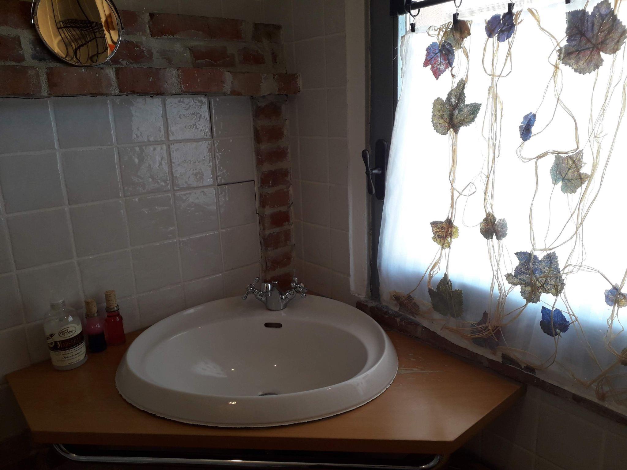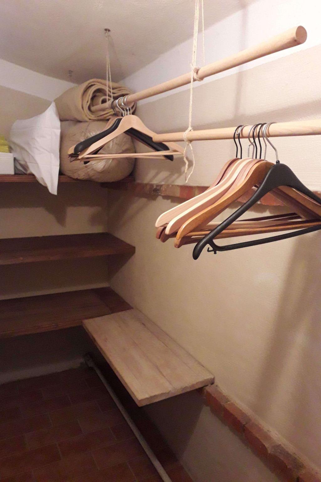 The holiday apartment is in the first house and is spread over two floors, connected by open stairs. The lower floor has a living room with a kitchen space and dining corner, equipped with a four-ring hob, a coffee machine and an Italian coffee maker, a toaster and a fridge. The upper floor has a bedroom and a sleeping area, each with double beds, and a bathroom with a shower and bidet.