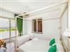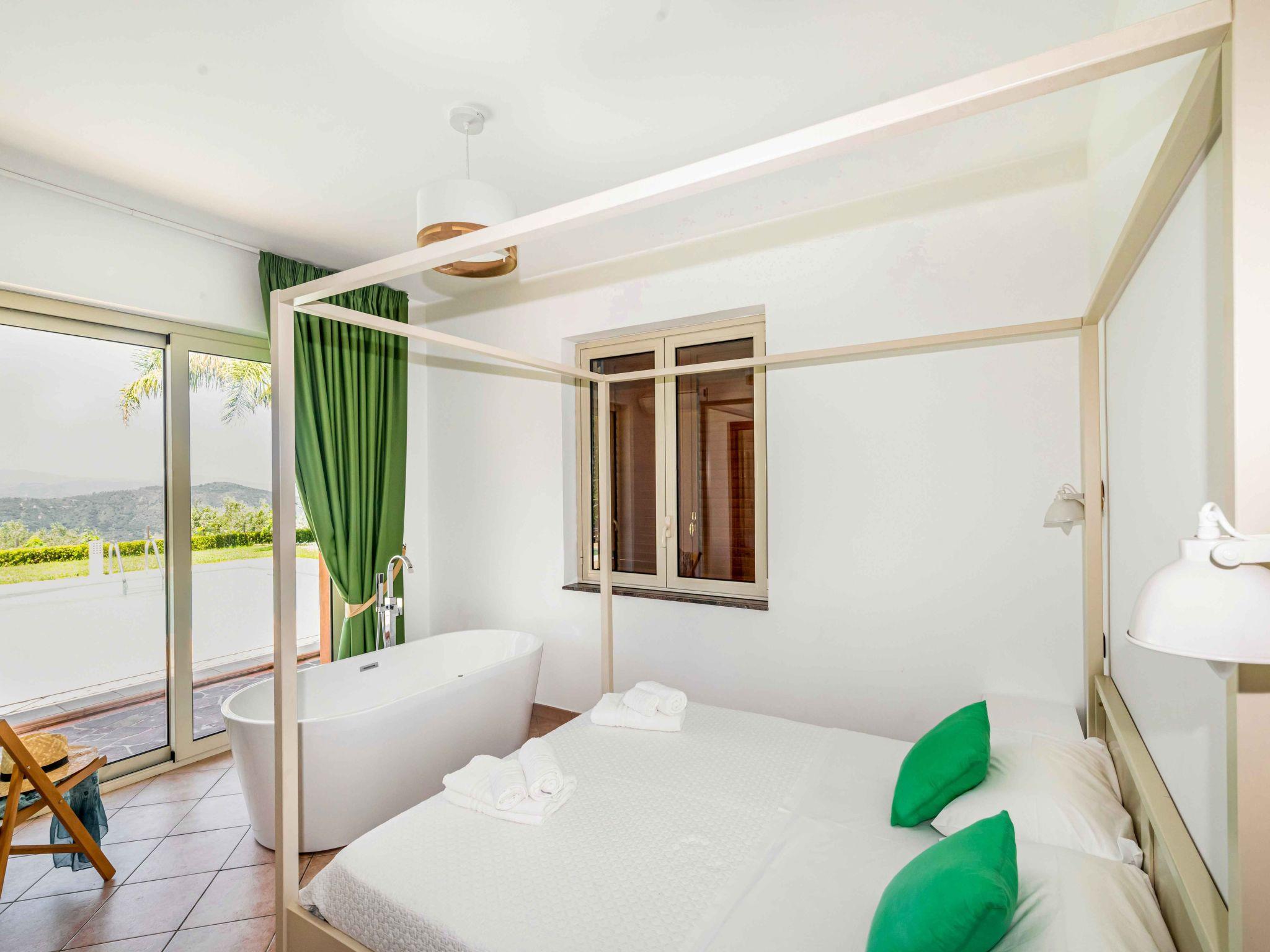 A door to one side of the living room leads into the romantic king-size bedroom that has an open plan whirlpool bathtub and an ensuite shower room. A door separates the living space from the other three bedrooms. The master bedroom features a super king-sized bed, a sleek ensuite with a tub, and direct access to the pool and the remaining two good size bedrooms, a double and a double-twin bedrooms that share a common bathroom with a shower.