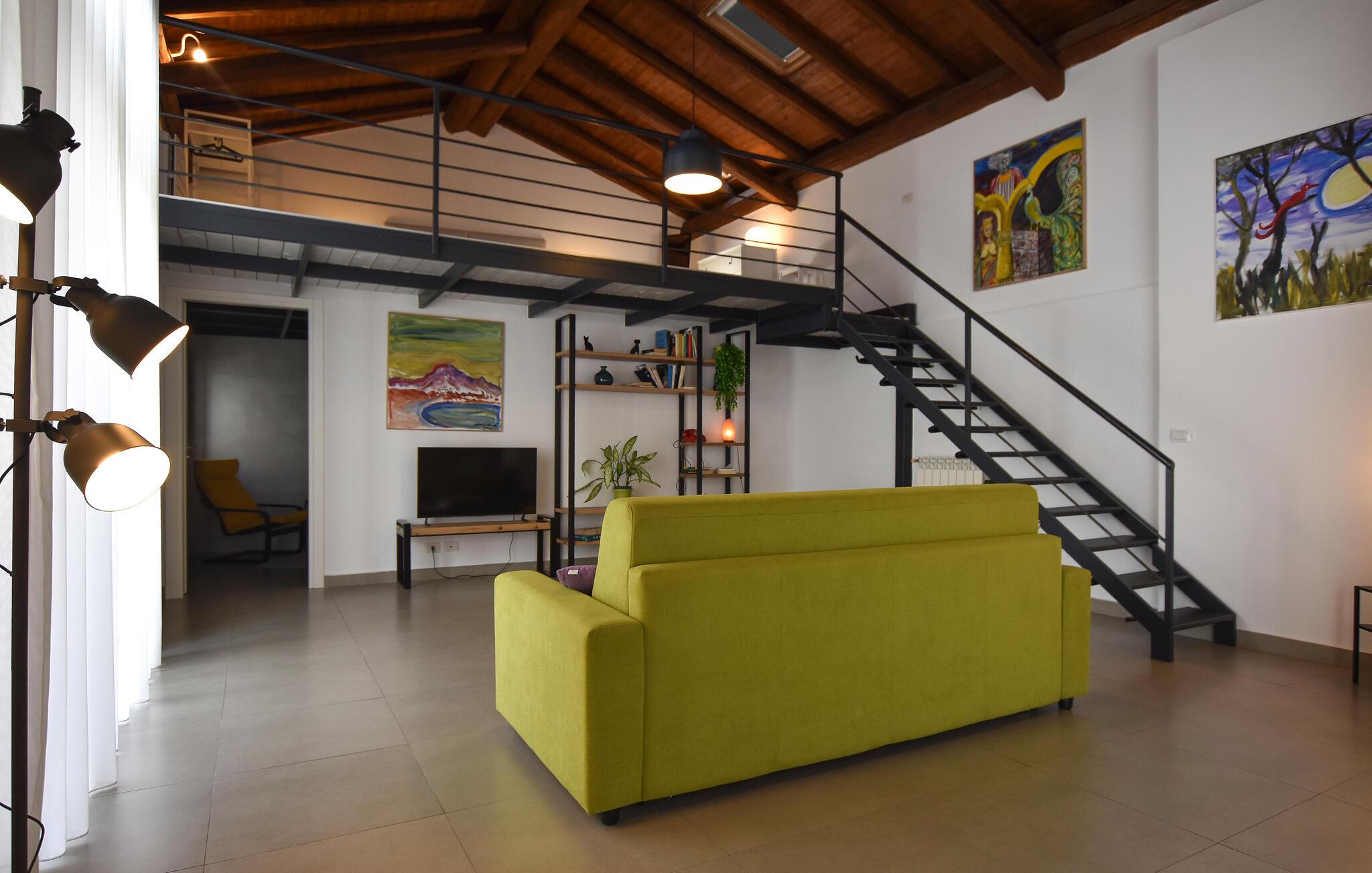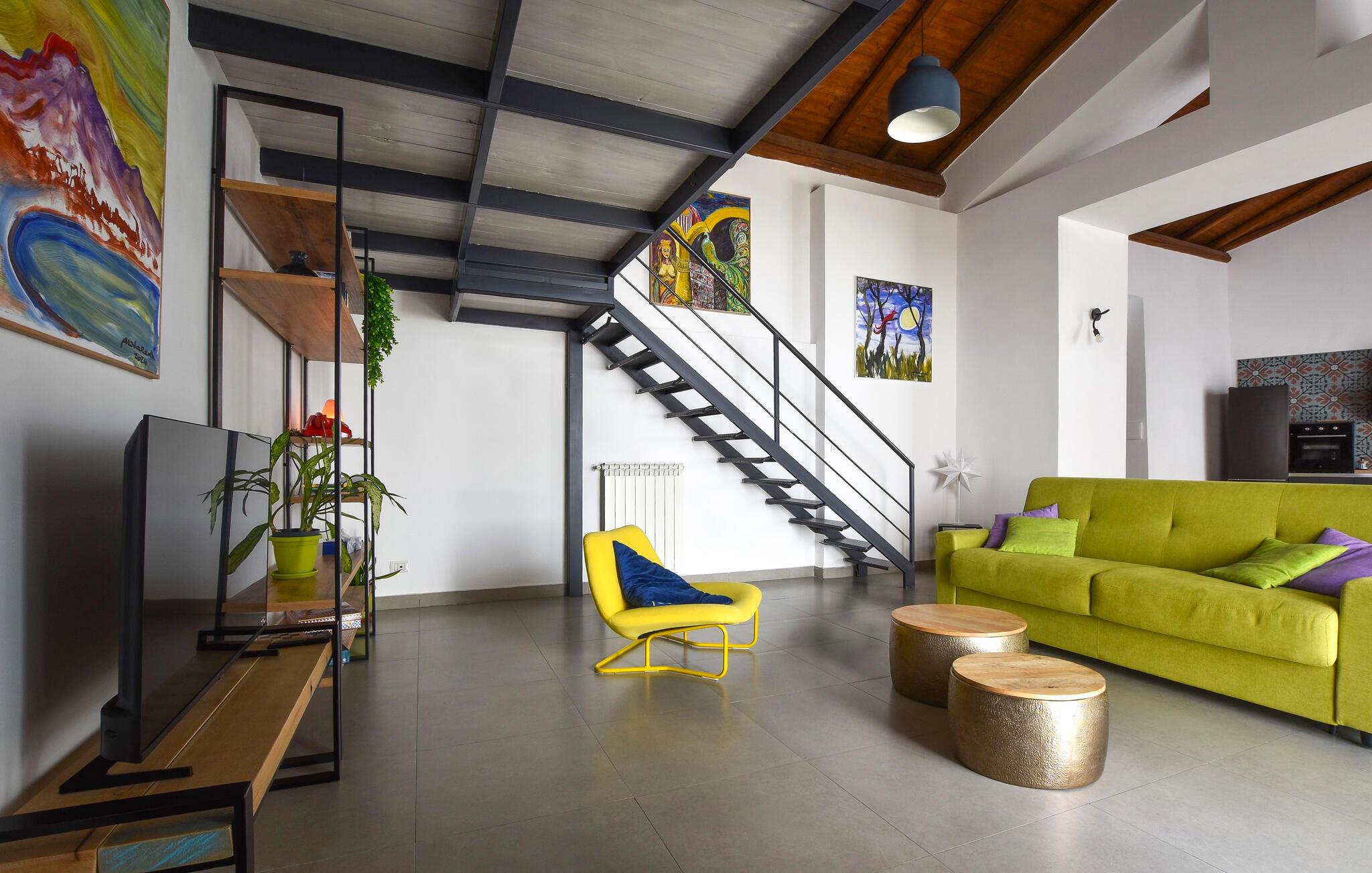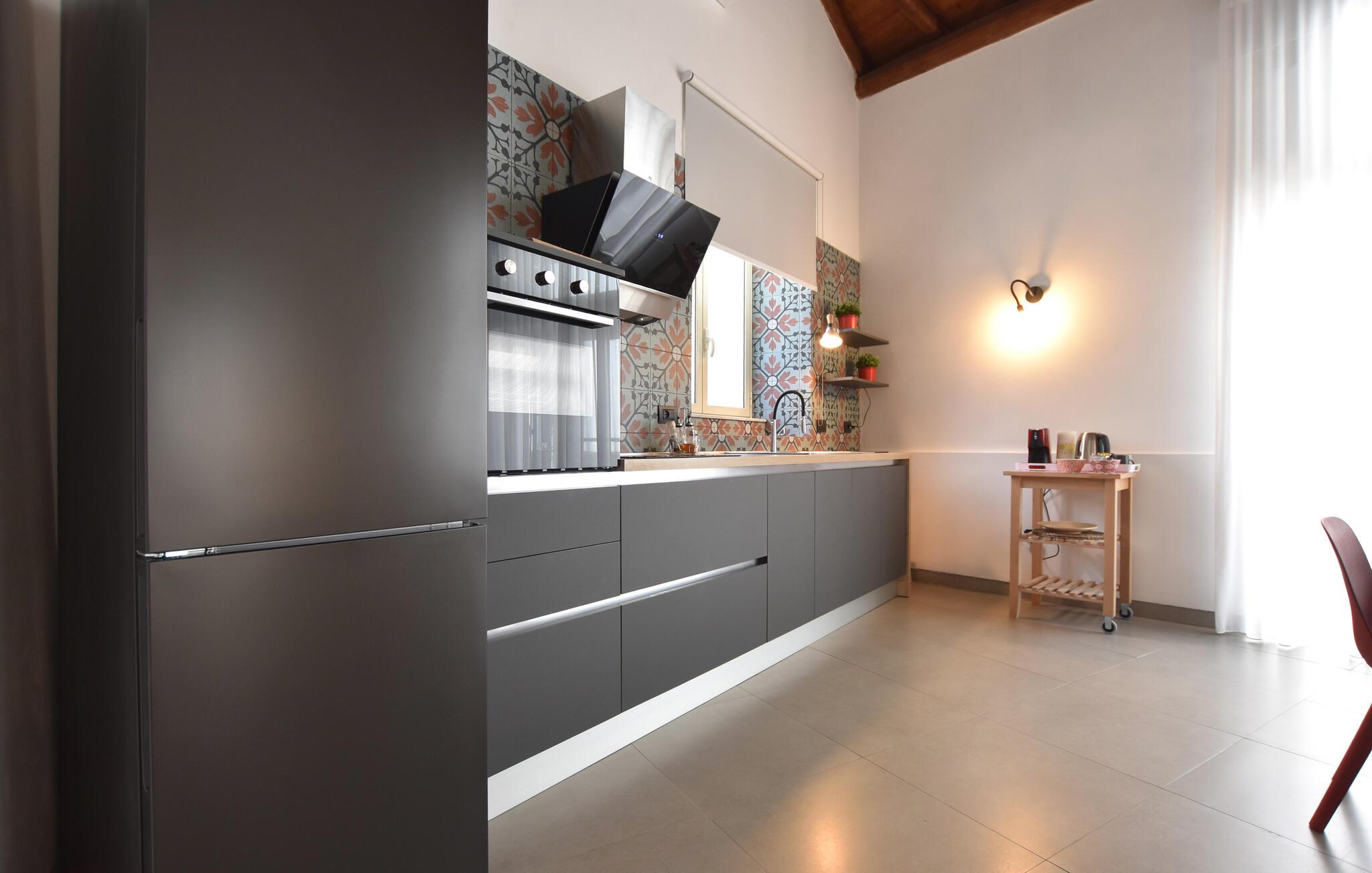 Oplev regionens mange attraktioner under en varieret ferie i dette komfortable feriehus. Dette rummelige og stilfuldt møblerede rækkehus byder jer velkommen til hjertet af Catania og vil begejstre jer med sin moderne og elegante atmosfære. Fremkald kulinariske lækkerier i det smukke køkken, og planlæg jeres aktiviteter over afslappede måltider i den åbne opholdsstue. Efter en lang dag kan I slappe af i den behagelige sofa, nyde en spilleaften eller fordybe jer i en underholdende bog af Andrea Camilleri. Den fælles terrasse tilbyder et skyggefuldt sted at starte dagen med en morgenmad under åben himmel eller til at snakke om jeres oplevelser over et glas vin om aftenen. Gå en tur gennem det pulserende La Pescheria-marked, prøv sicilianske specialiteter og beundr katedralen. Tag en tur til Etna, vandr på vulkanstierne, eller solbad på strandene i Aci Trezza. Oplev historiske villaer og maleriske haver i de charmerende kystbyer Taormina og Acireale, og gå ikke glip af de gamle arkæologiske steder på Naxos.