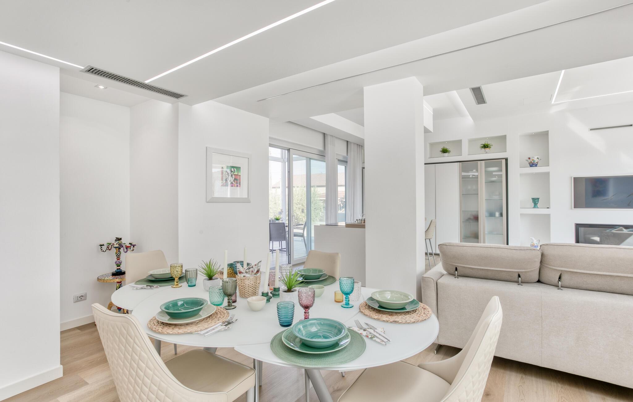 Velkommen til dette indbydende og børnevenlige hus, der ligger på den østlige del af Sicilien. Huset er smagfuldt indrettet i lyse farver, og I vil hurtigt føle jer hjemme. Her kan I lade en feriedag gå på hæld med en fælles aftensmad for hele familien, som I måske vil udfordre til brætspil bagefter? I skal bare gøre jer det behageligt i sofaerne, hvor I kan sludre til langt ud på natten.