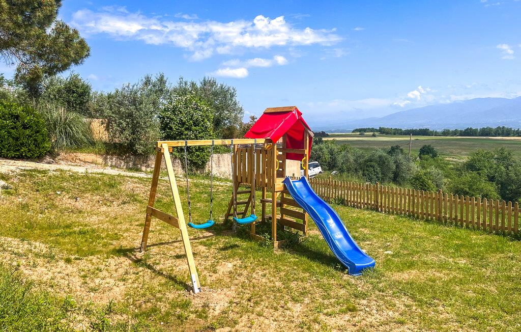 Nyd morgenkaffen på den solrige terrasse og vågn op i ro og mag til synet af det smukke landskab. Skal I køles ned, kan I hoppe en tur i poolen, hvorfra man stadig kan nyde udsigten. I den rummelige have er en parasol, så I kan holde solpauser i løbet af dagen. Fyr op i grillen og skænk vin i glasene, mens børnene er underholdt på legepladsen.