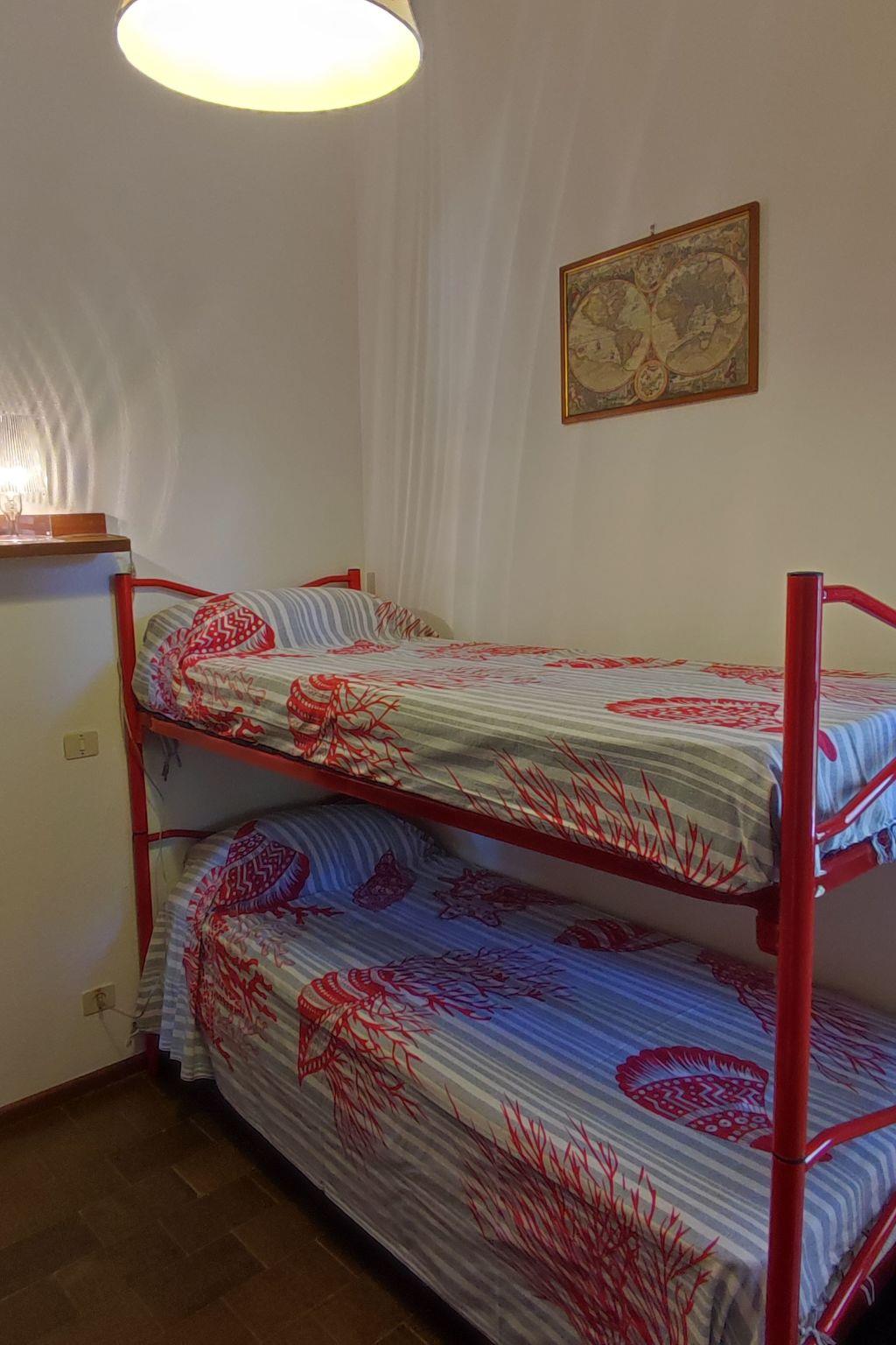 Inside there is a large living room with sofas, satellite colour TV, a large dining room, a fully equipped kitchen with fridge, freezer, oven and microwave oven, a bathroom with washing machine. On the first floor is the sleeping area with: one double bedroom, one bedroom with a double bed and a bunk bed and two bathrooms.
