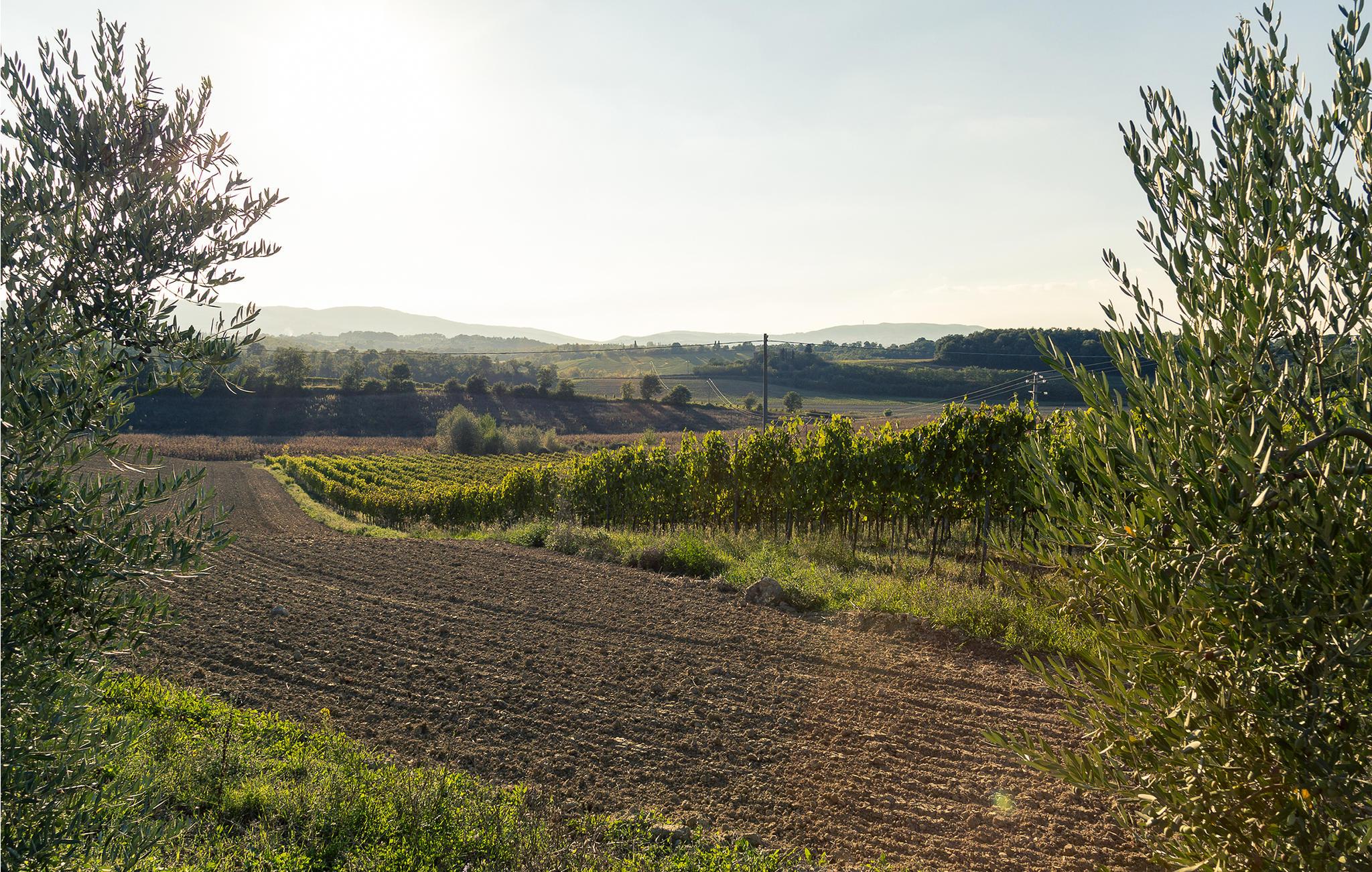 Dejlig villa med pool og panoramaudsigt, omgivet af vinmarker og olivenlunde.