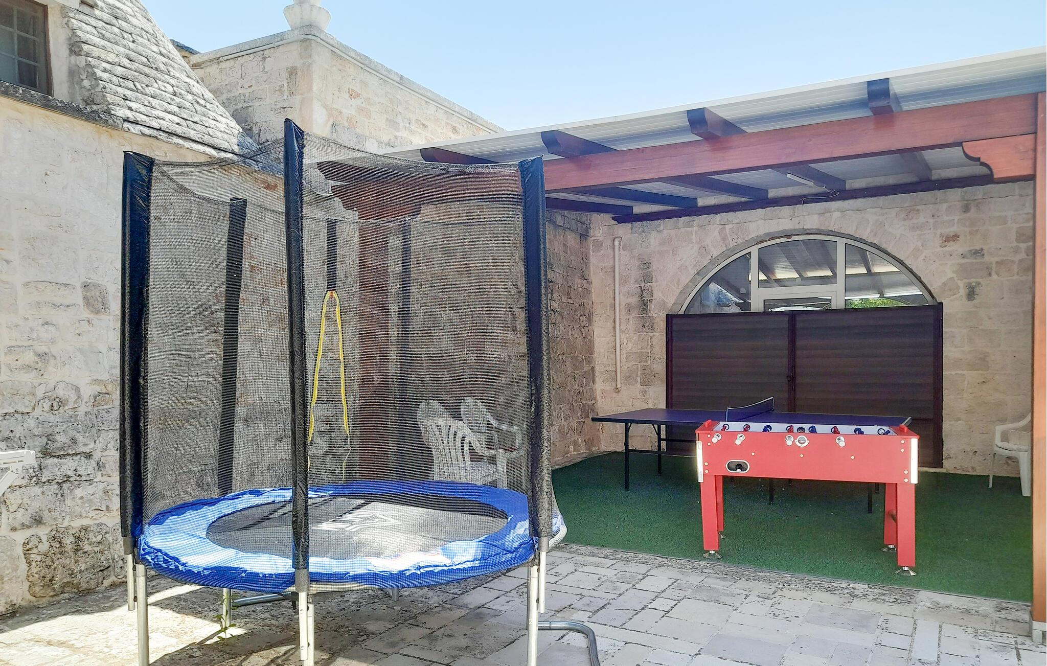 Gå en tur udenfor om morgenen og læn jer tilbage i poolen. Lad batterierne op på den solbeskinnede terrasse, mens børnene morer sig på trampolinen eller ved bordfodboldbordet, og nyd stemningsfulde grillmiddage med vin og stearinlys under åben himmel.
