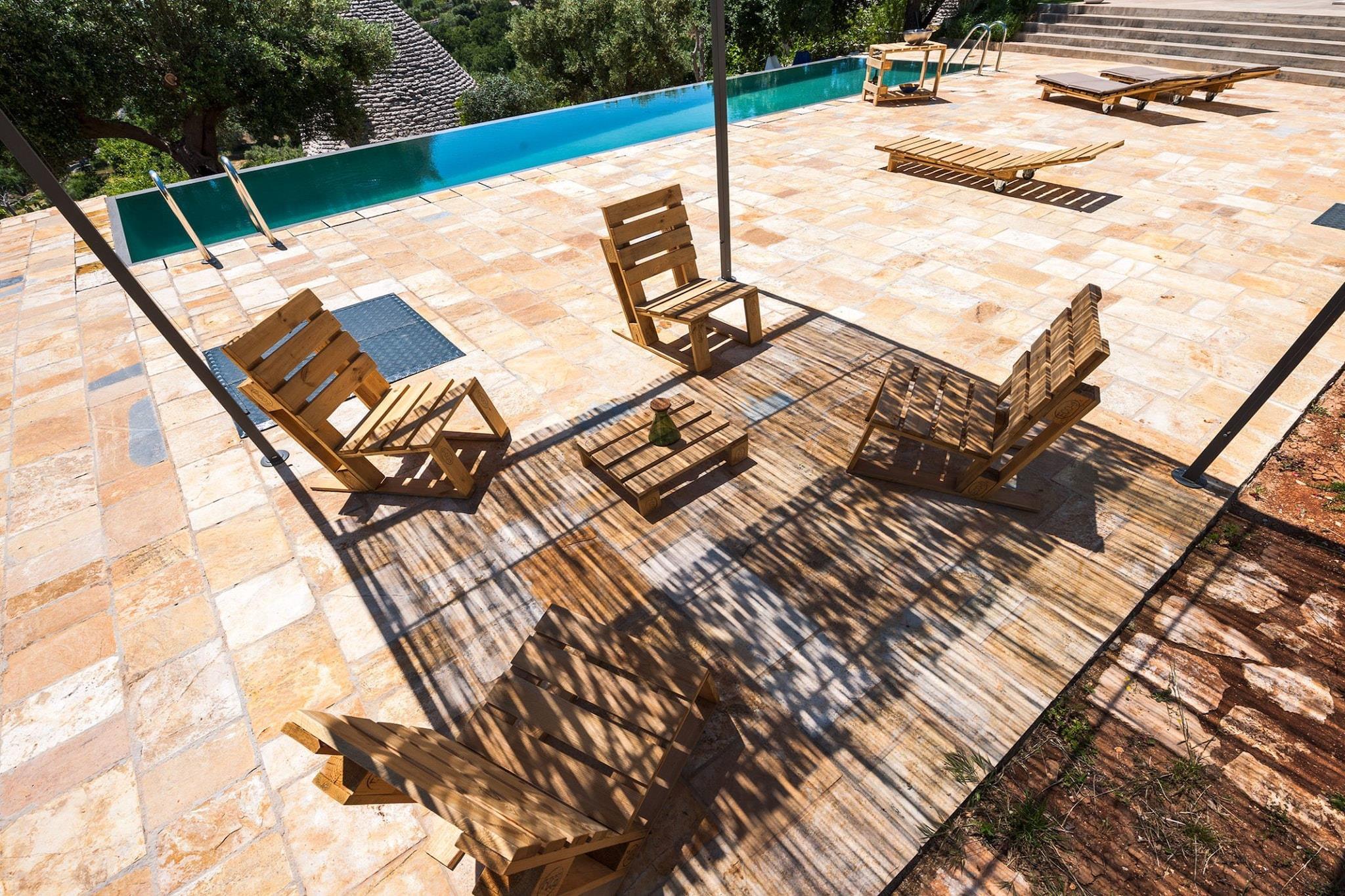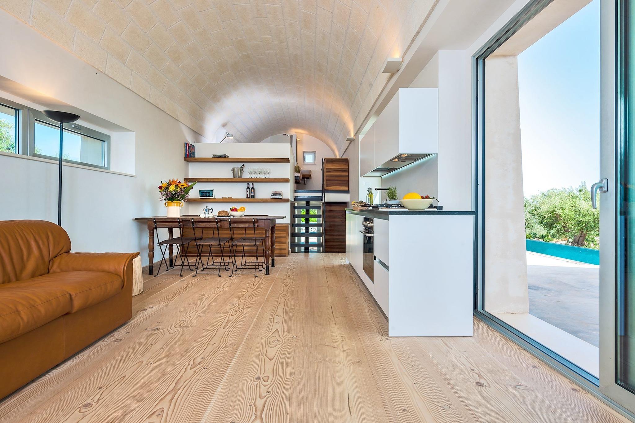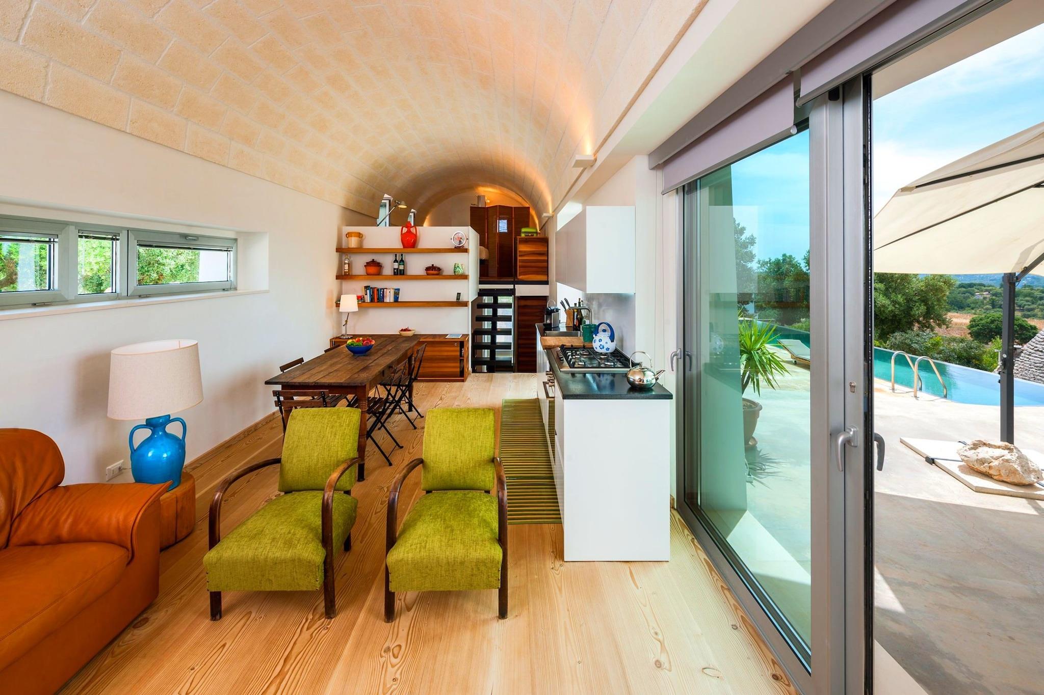 Denne private villa nær Cisternino tilbyder en fredelig flugt for op til otte gæster, der kombinerer rustik charme med moderne komfort. Det er omgivet af olivenlunde og har køkken i åbent plan, rummelig opholds- og spisestue med satellit-tv og dvd/cd-afspiller samt en frodig have med pool, der er åben året rundt, grill og udendørsmøbler. Stueetagen indeholder et hyggeligt soveværelse og et lækkert badeværelse, mens mezzaninen tilbyder fleksible sovearrangementer, et komplet bad og en panoramaterrasse. Et separat gæstehus tilføjer privatliv med eget køkken, soveværelse og badeværelse. Blot 2 km væk inviterer Cisterninos hvidkalkede gyder og håndværkerbutikker til udforskning. Besøg Centro Storico, beundre Chiesa Matrice di San Nicola Patara, eller slentre gennem Piazza Vittorio Emanuele II. Nærliggende perler omfatter Alberobello (19 km), Ostuni (13 km) og Adriaterhavskysten (18,9 km), perfekt til dagsture og vinsmagning. Til spisning kan du nyde traditionelle retter på Le Tre Lanterne, grillede specialiteter på Rosticceria L'antico Borgo eller frisk fisk og skaldyr på Osteria la Valle. Kreative vegetariske retter venter på Micro, mens Chirico Bistrot og Il Capriccio byder på stilfulde omgivelser og solide tallerkener. For elegant spisning, prøv Ristó il Grappolo eller den trendy 20M2 - Cisternino.