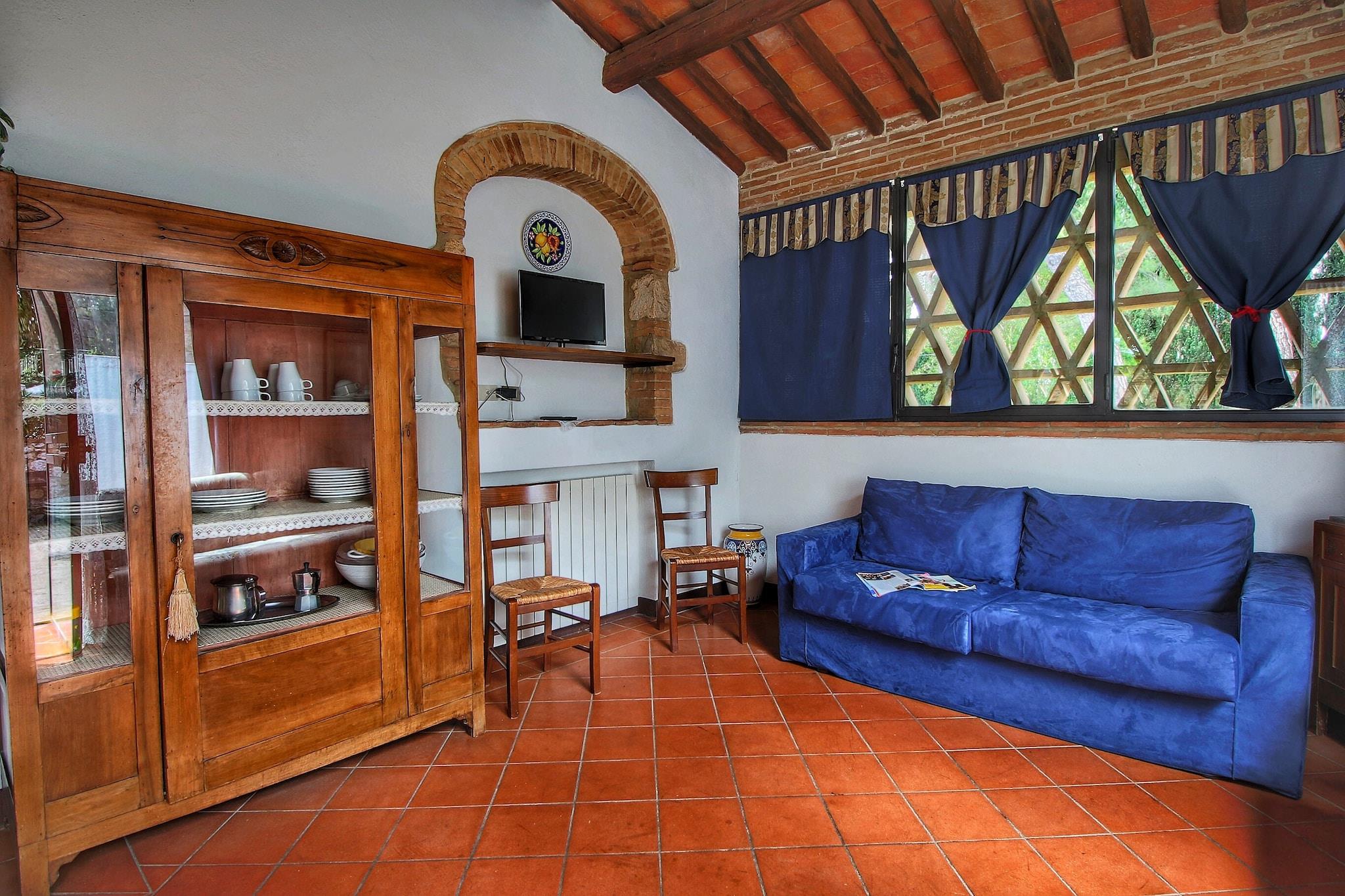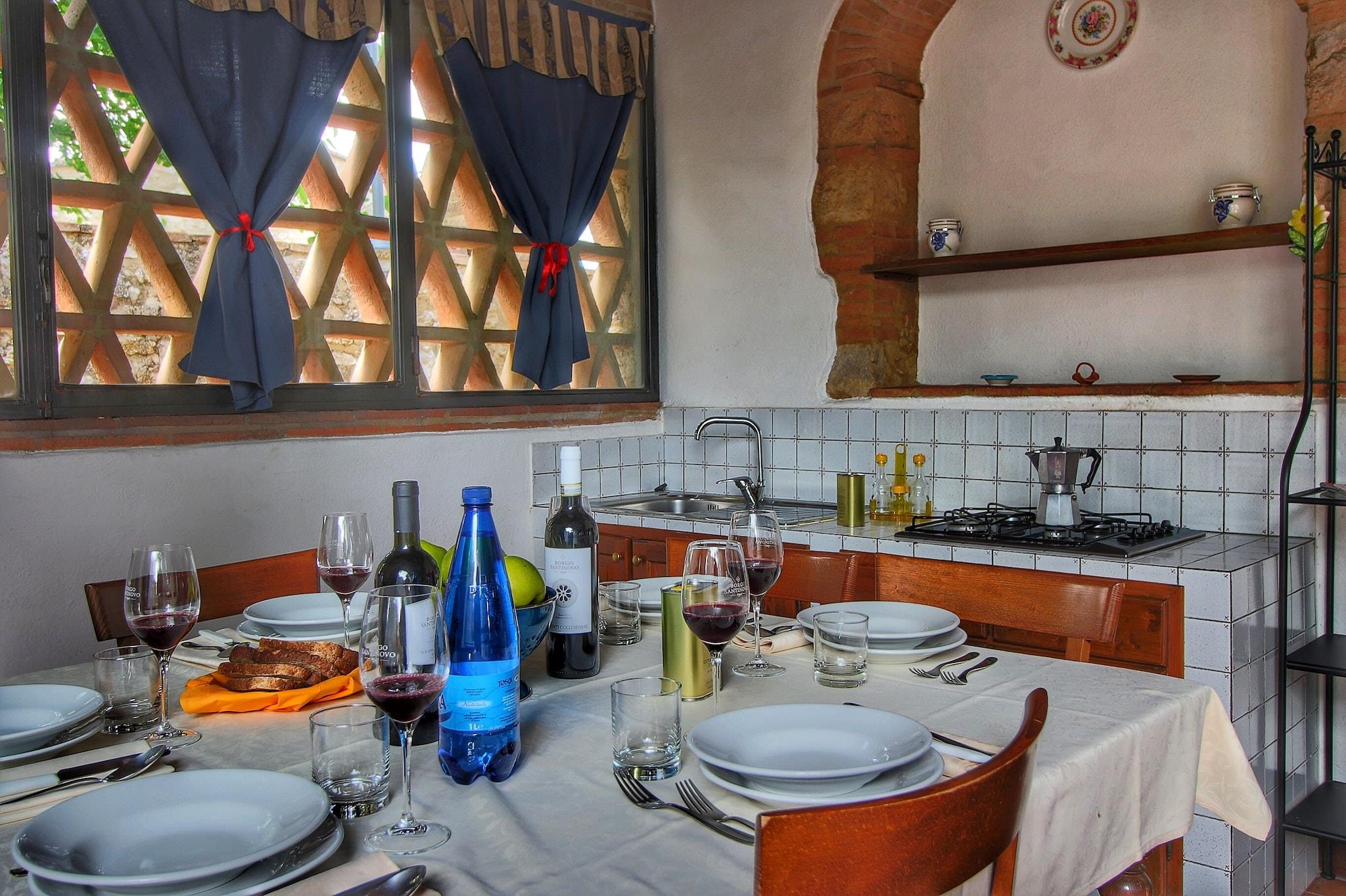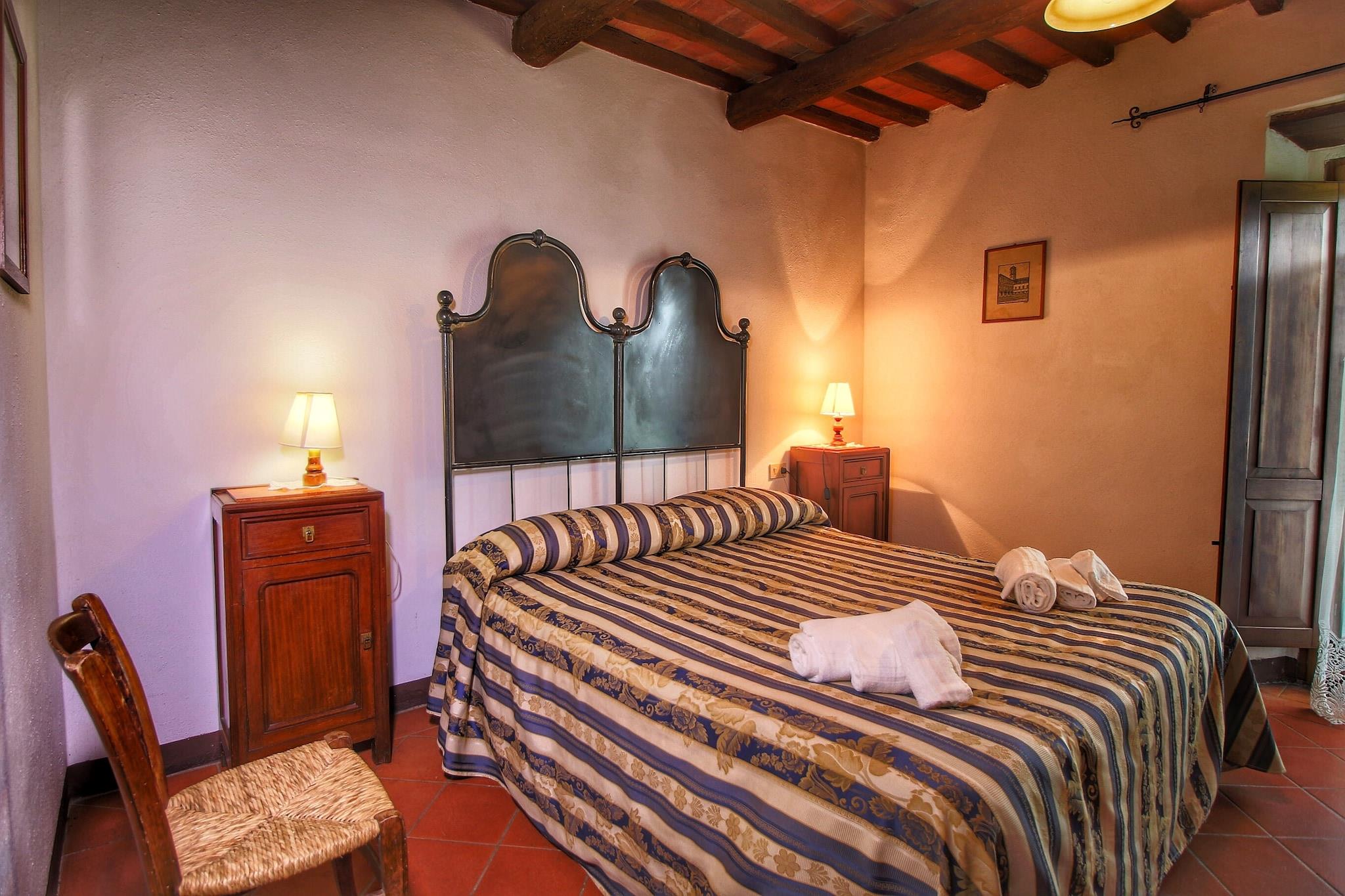 Beliggende i Colle di Val d'Elsa's fredfyldte landskab kan dette kæledyrsvenlige feriehus rumme op til 7 gæster og er ideelt for familier eller grupper, der søger en afslappende toscansk ferie. Ejendommen i stueetagen byder på et rummeligt køkken med tv og dobbelt sovesofa, tre komfortable soveværelser, to med dobbeltsenge og et med to enkeltsenge, og to badeværelser med bruser og toiletter, hvilket sikrer bekvemmelighed for alle. Hjemmet åbner til en privat have, der er møbleret til afslapning og udendørs måltider, mens to fælles swimmingpools (7×4m og 4×4m), åbne fra maj til september, inviterer til forfriskende dukkert under den toscanske sol. Rigelig parkeringsplads gør det nemt at udforske regionen, og de rolige landlige omgivelser lover fredelige aftener omgivet af natur. Blot 3,5 km væk er Colle di Val d'Elsa kendt for sin middelalderlige gamle bydel og berømte krystalhåndværk. Besøg Crystal Museum, slentre gennem det høje historiske kvarter, eller nyd udsigten fra Porta Nuova. Kulinariske højdepunkter i nærheden omfatter Ristorante Arnolfo, en Michelin-stjerne-perle, og L'Officina della Cucina Popolare for autentisk lokal mad. Med San Gimignano (15 km), Siena (25 km) og Volterra (30 km) alle inden for rækkevidde, tilbyder dette feriehus den perfekte base for at opdage Toscanas kultur, køkken og charme.