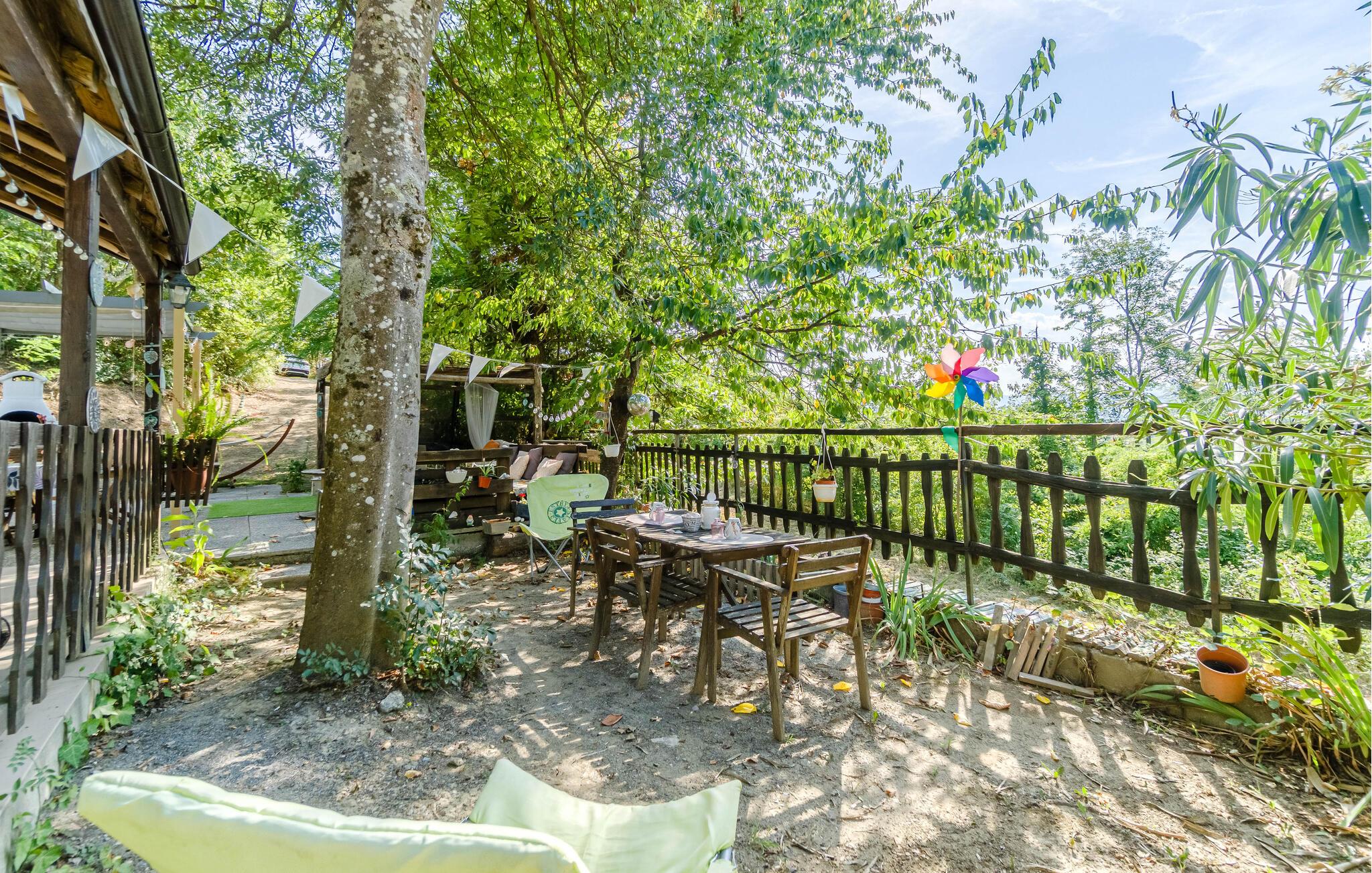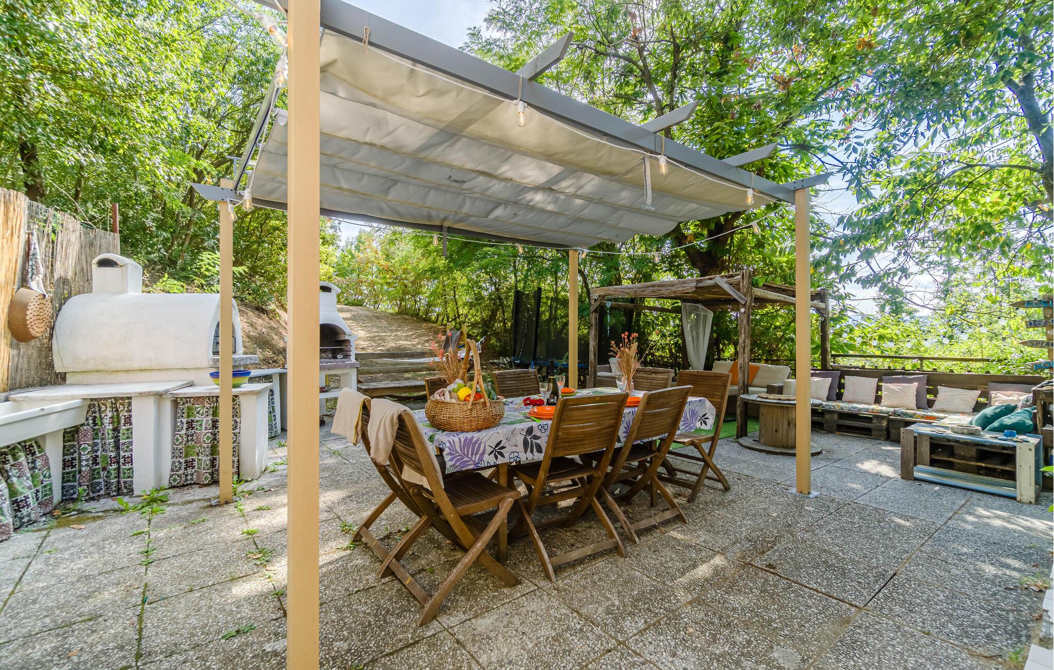 Når solen skinner er det bare at trække ud på terrassen, der ligger dejligt omgivet af træer. Her kan I ud på eftermiddagen tænde op i grillen og tilberede nogle saftige bøffer, der nydes allerbedst under den lune aftensol med et godt glas vin.
