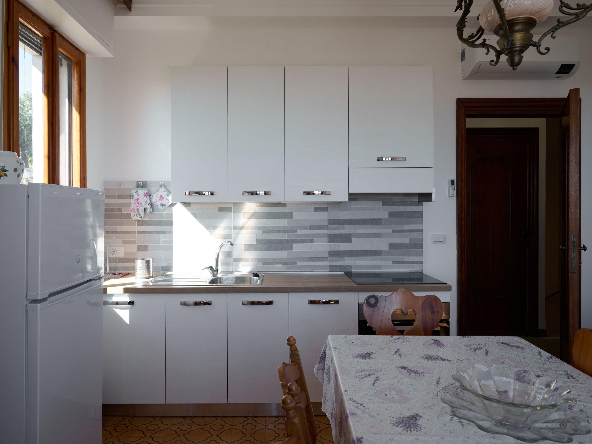The interior of the Terrazzo flat is designed to offer maximum comfort and practicality. Inside, the living room is furnished with a TV, a comfortable sofa and an inviting dining area, ideal for sharing convivial moments. The kitchen, equipped for every need, has a kitchenette, cutlery, dishes, refrigerator, dishwasher, kettle and air conditioner, as well as a window that illuminates the space with natural light and offers direct access to the terrace, thus enriching the living experience with the beauty of the outdoors.