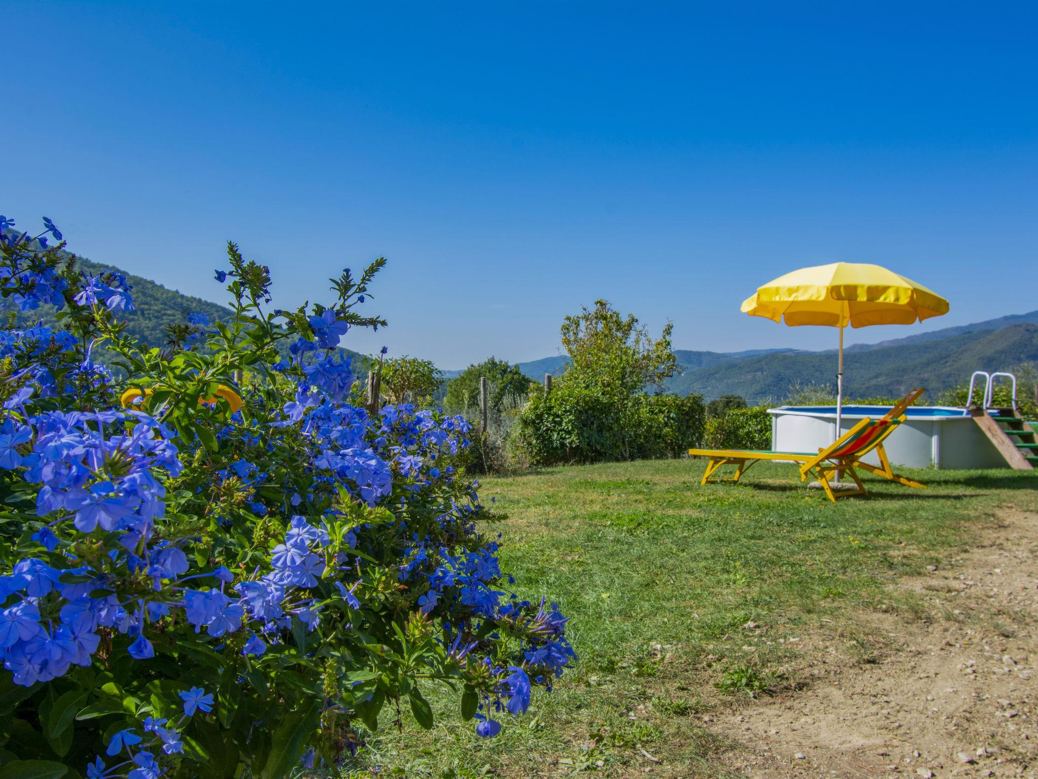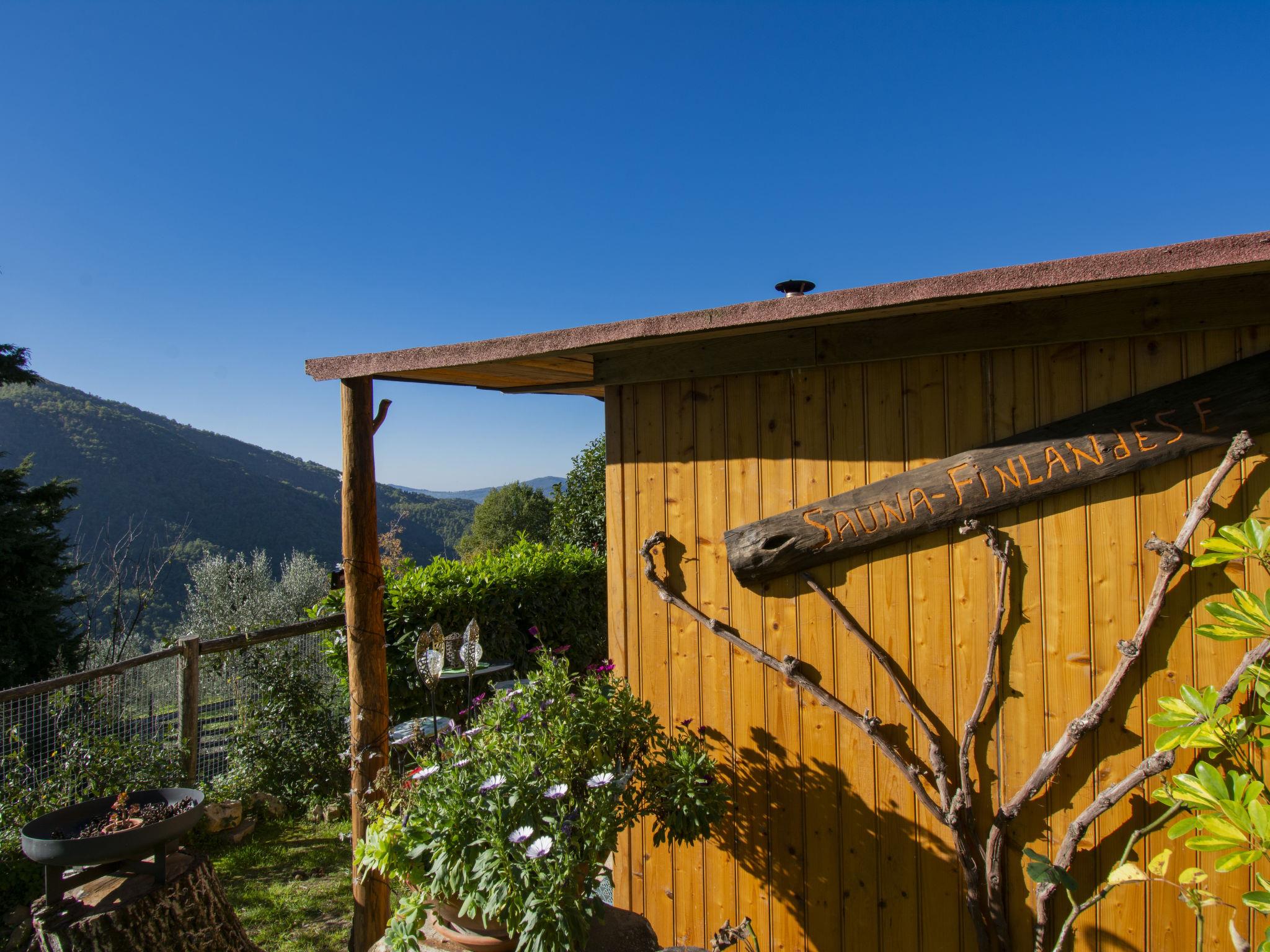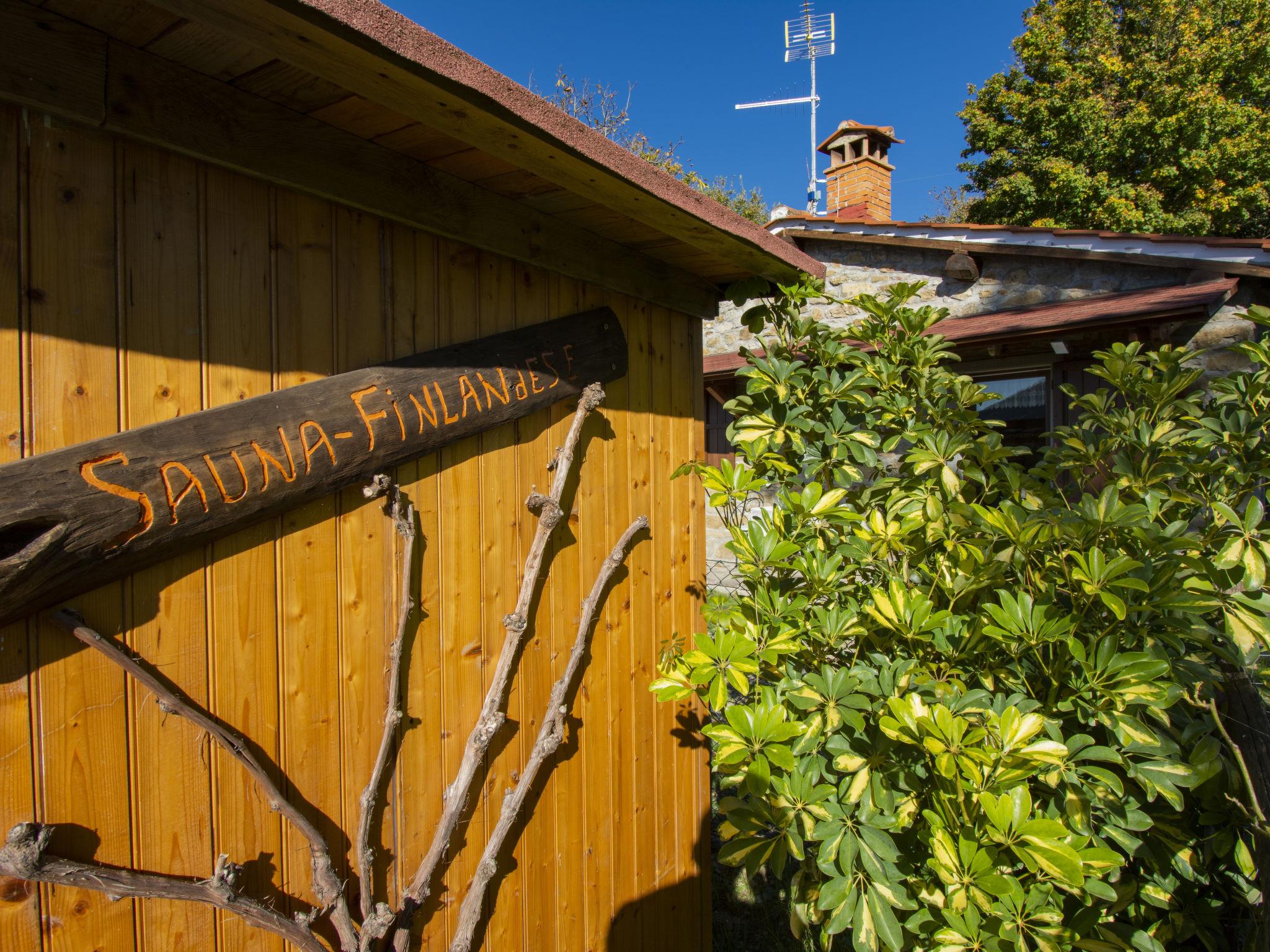Single-family house "Il Poderino", 500 m a.s.l., renovated. 7 km from the centre of Dicomano, 14 km from the centre of Rufina, 40 km from the centre of Firenze, 3 km from the lake, in the countryside. Private: natural state property 700 m2, garden 300 m2 (fenced), swimming pool (above ground) (3.5 m diameter, seasonal availability: 01.May. - 30.Sep.). Arbour, terrace (30 m2), garden furniture, barbecue. In the house: sauna, hot tub (extra). Heating available only from 15.Nov. - 15.Apr.. 600 m long steep, narrow motor access (700 m via unmade road). Parking. Supermarket 3 km, bus stop 4 km, railway station "Contea Londa" 5 km. Groups of teenagers on request only.