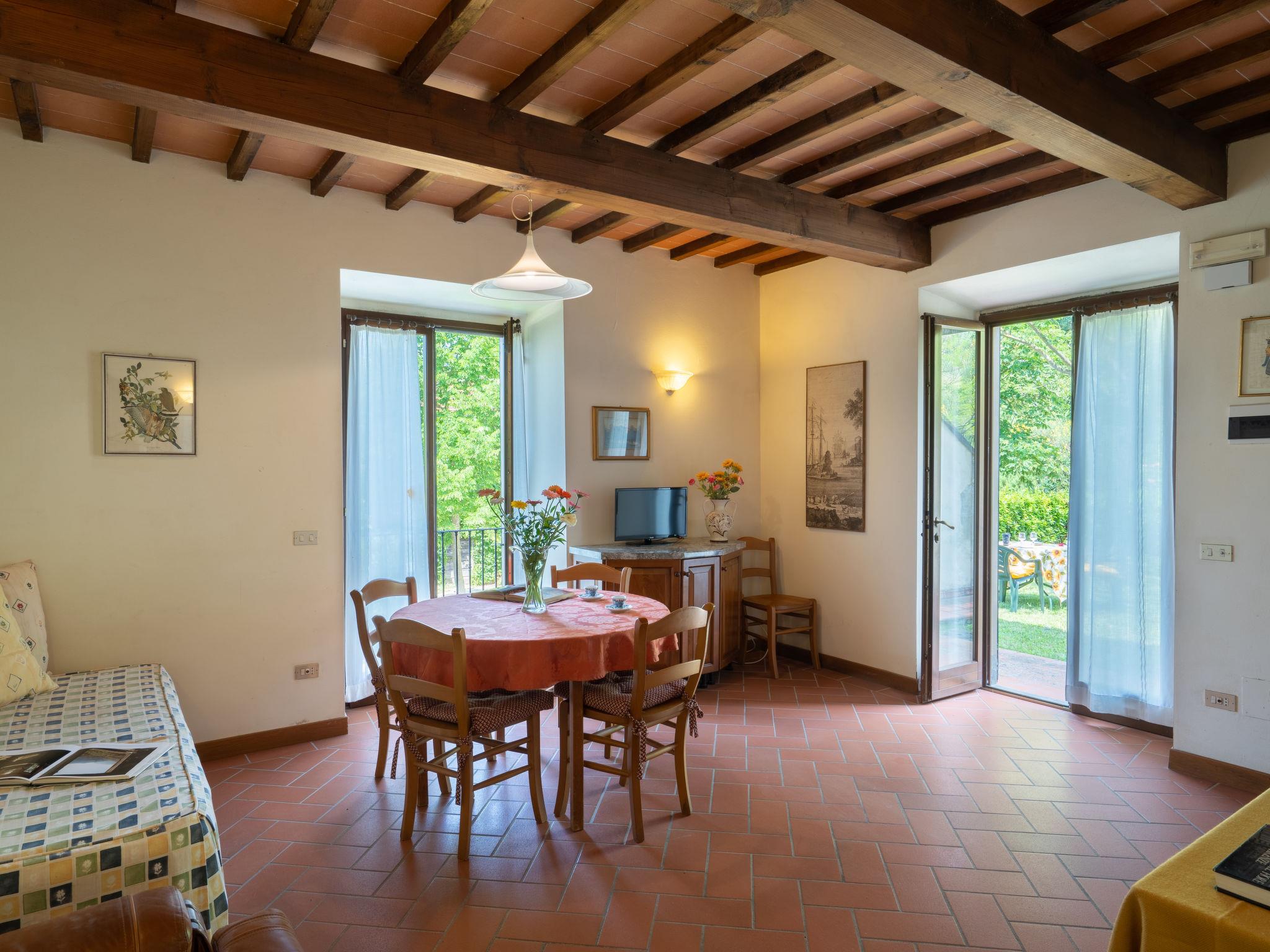 Rustic on a vinyard agricultural estate "Vigna La Corte", 2 storeys, detached from the 16th century, surrounded by trees, meadows and fields. 3 houses in the residence. 13 apartments in the residence. 2 km from the centre of Dicomano, 7.2 km from the centre of Vicchio, 45 km from the centre of Firenze, in a secluded, elevated position on a slope. For shared use: property 60 ha with plants and trees, meadow, swimming pool (16 x 8 m, depth 140 cm, seasonal availability: 01.May. - 01.Oct.). Outdoor shower, table tennis, arbour, terrace, garden furniture, barbecue. In the complex: reception, WiFi, table football, washing machine (for shared use), heating available only from 15.Nov. - 15.Apr.. Motor access (500 m via unmade road). Roofed, parking on the premises. Supermarket 2 km, restaurant 2 km, bus stop 900 m, railway station "Dicomano" 2 km. Nearby attractions: Autodromo Internazionale del Mugello 25 km, Outlet Barberino del Mugello 35 km. On the estate animal husbandry. Local sale of farm products. Please note: railway line 1 km from the property.