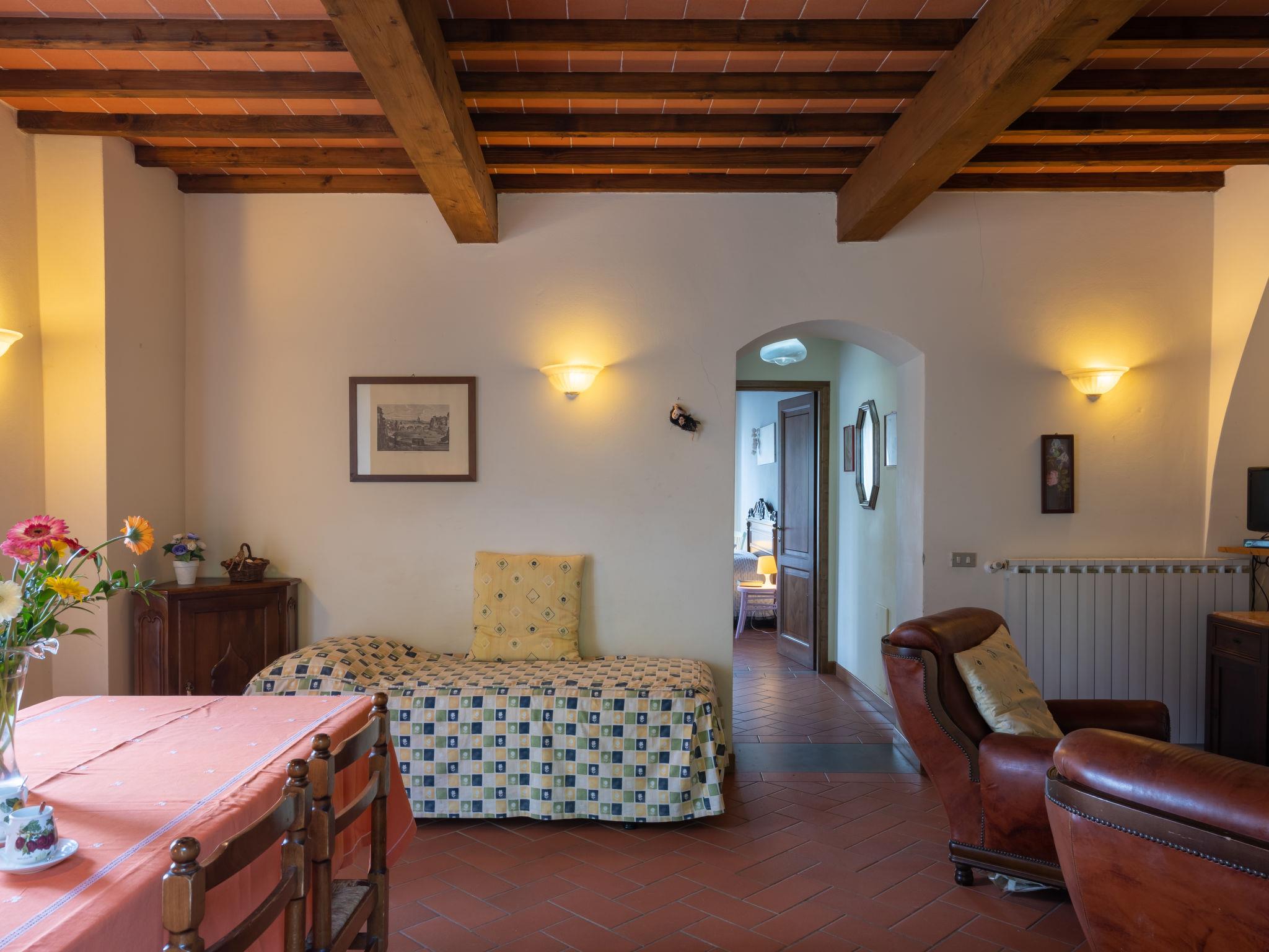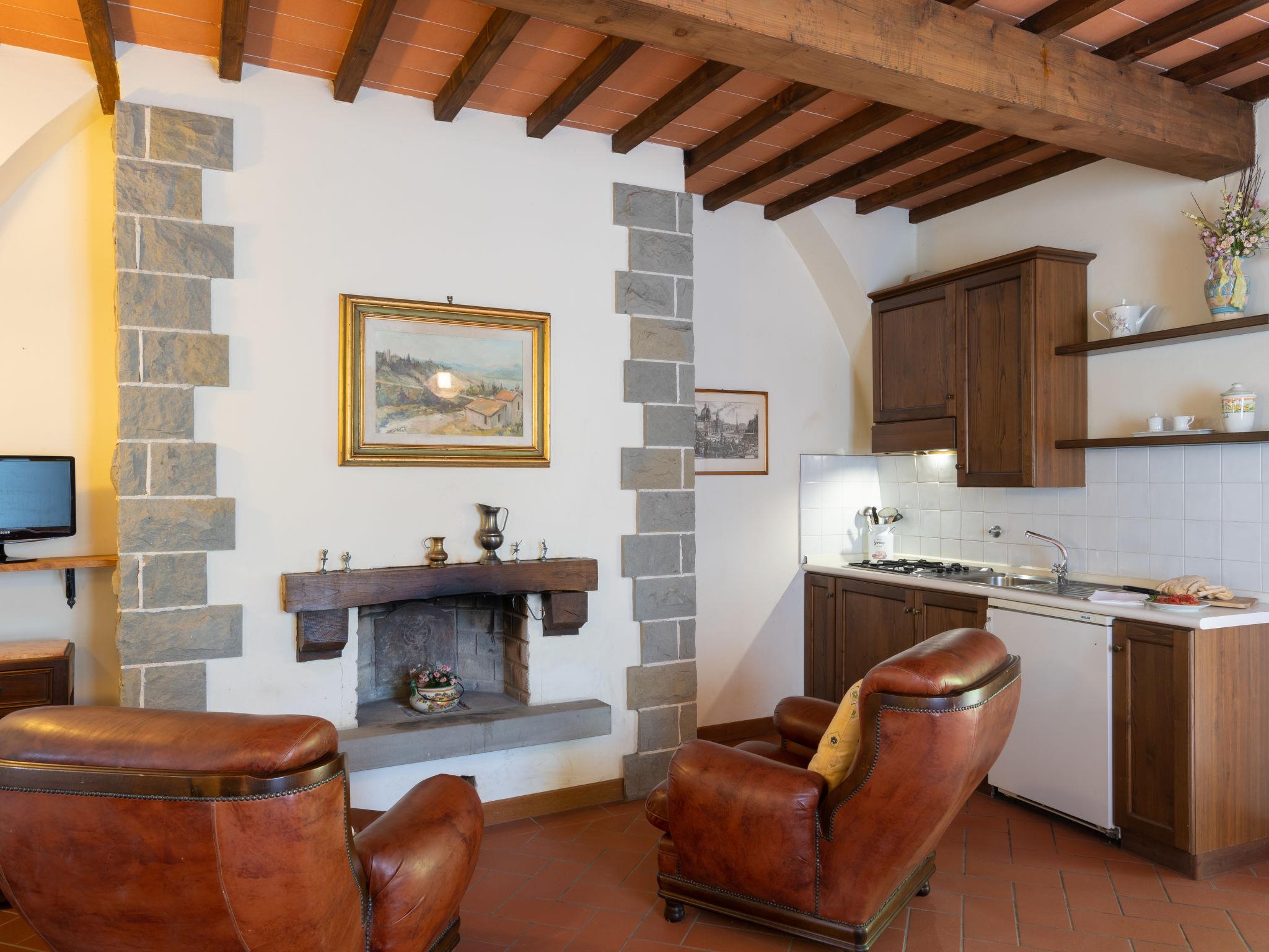 Rustic on a vinyard agricultural estate "Vigna La Corte", 2 storeys, detached from the 16th century, surrounded by trees, meadows and fields. 3 houses in the residence. 13 apartments in the residence. 2 km from the centre of Dicomano, 7.2 km from the centre of Vicchio, 45 km from the centre of Firenze, in a secluded, elevated position on a slope. For shared use: property 60 ha with plants and trees, meadow, swimming pool (16 x 8 m, depth 140 cm, seasonal availability: 01.May. - 01.Oct.). Outdoor shower, table tennis, arbour, terrace, garden furniture, barbecue. In the complex: reception, WiFi, table football, washing machine (for shared use), heating available only from 15.Nov. - 15.Apr.. Motor access (500 m via unmade road). Roofed, parking on the premises. Supermarket 2 km, restaurant 2 km, bus stop 900 m, railway station "Dicomano" 2 km. Nearby attractions: Autodromo Internazionale del Mugello 25 km, Outlet Barberino del Mugello 35 km. On the estate animal husbandry. Local sale of farm products. Please note: railway line 1 km from the property.