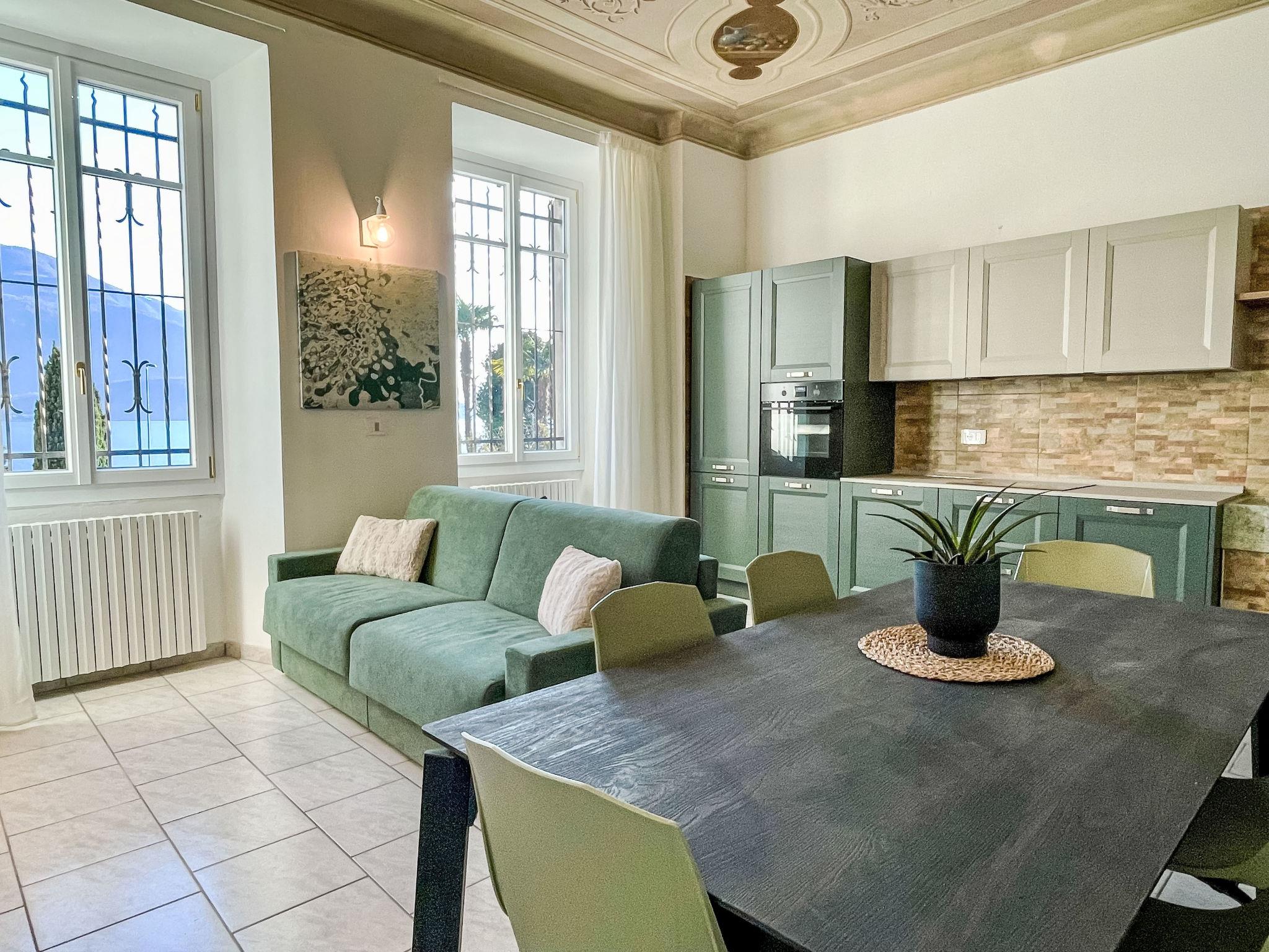 "Ground Floor", 3-room apartment 75 m2, on the ground floor. Comfortable furnishings: living/dining room with 1 double bed, dining table and TV. 1 room with 1 double bed. 1 room with 2 beds and 1 pull-out bed. Open kitchen (oven, dishwasher, 4 induction hot plates, Gas stove, toaster, kettle, electric coffee machine). Shower/bidet/WC. Gas heating, air-conditioning. Beautiful view of the lake and the mountains. Facilities: children's high chair, baby cot for up to 2 year olds, hair dryer. Internet (WiFi, free). Please note: non-smokers only. Fire extinguisher. IT013089B4WAUE76XC
