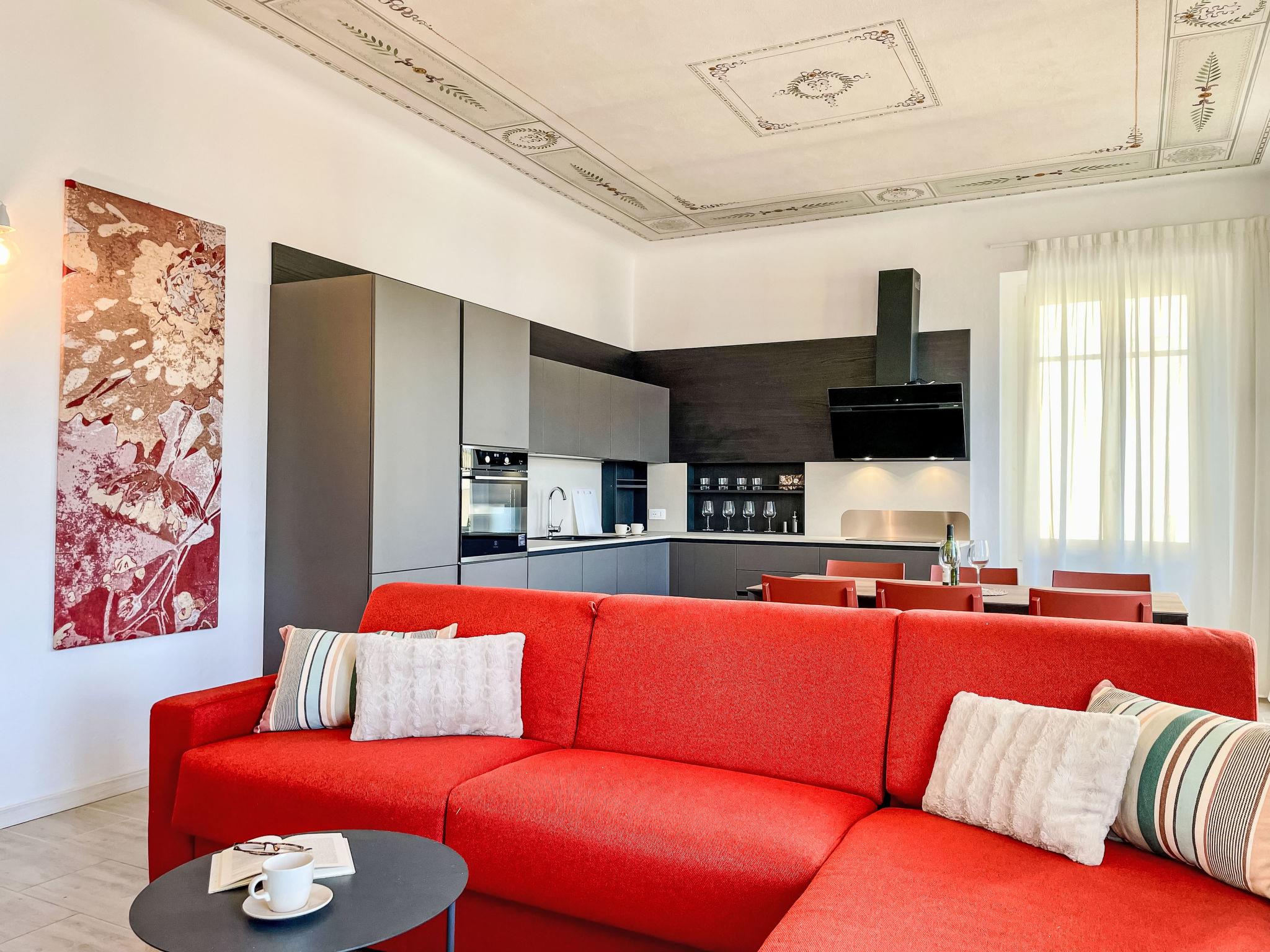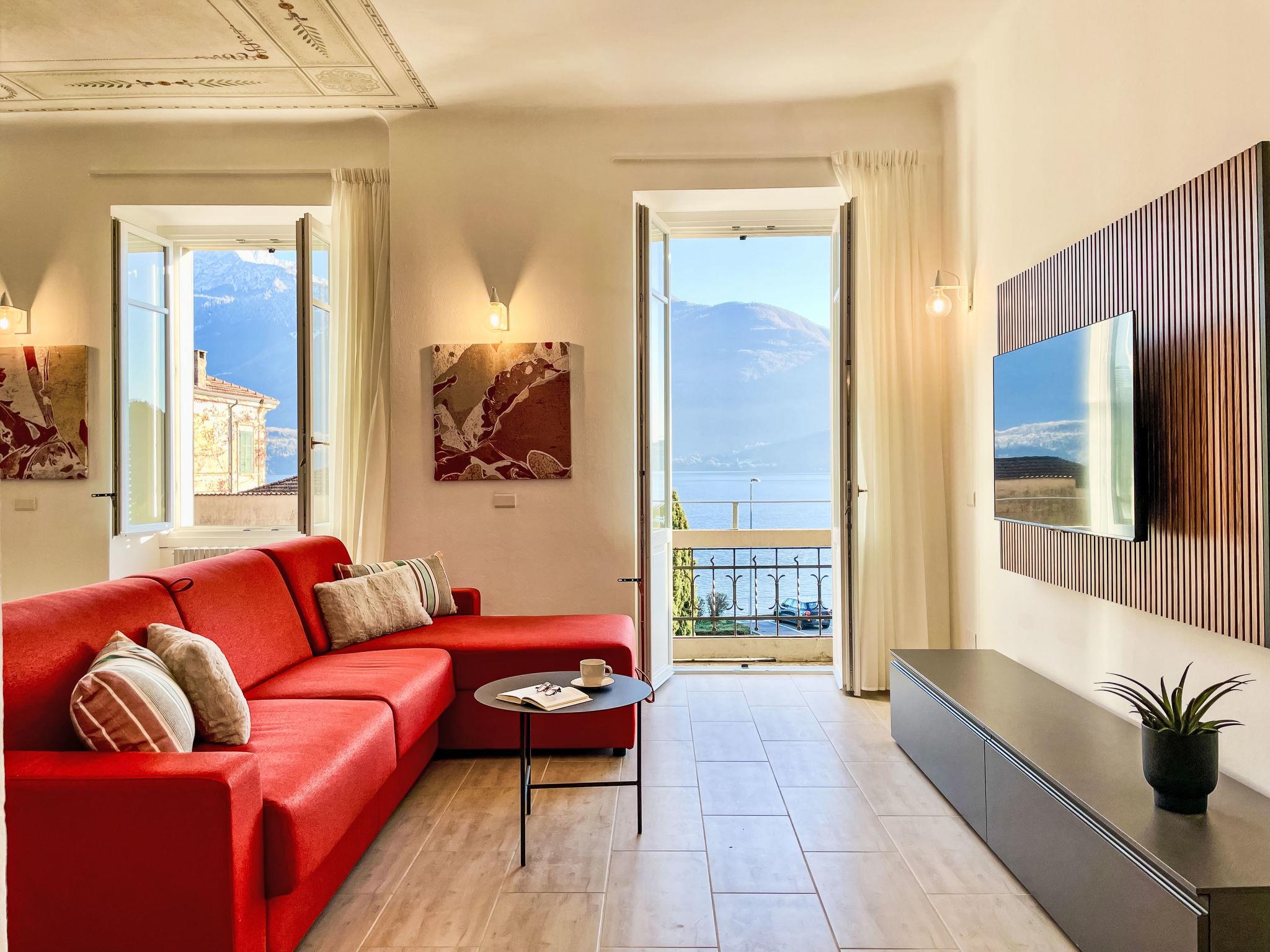 "First floor", 3-room apartment 100 m2 on 1st floor. Comfortable furnishings: open large living/sleeping room with 1 double sofabed, dining table and TV. 1 room with 1 double bed and TV. 1 room with 2 beds. Open kitchen (oven, dishwasher, 4 induction hot plates, toaster, electric coffee machine). Shower/bidet/WC. Gas heating, air-conditioning. Small balcony. Very beautiful view of the lake and the mountains. Facilities: children's high chair, baby cot for up to 2 year olds, hair dryer. Internet (WiFi, free). Please note: non-smokers only. Fire extinguisher, no lift. IT013089B4CA3TNOYL