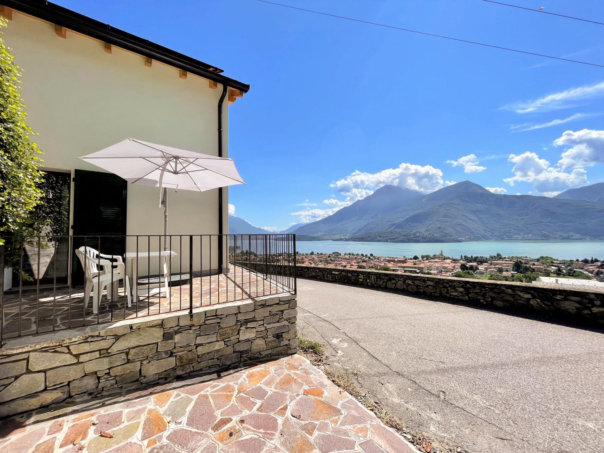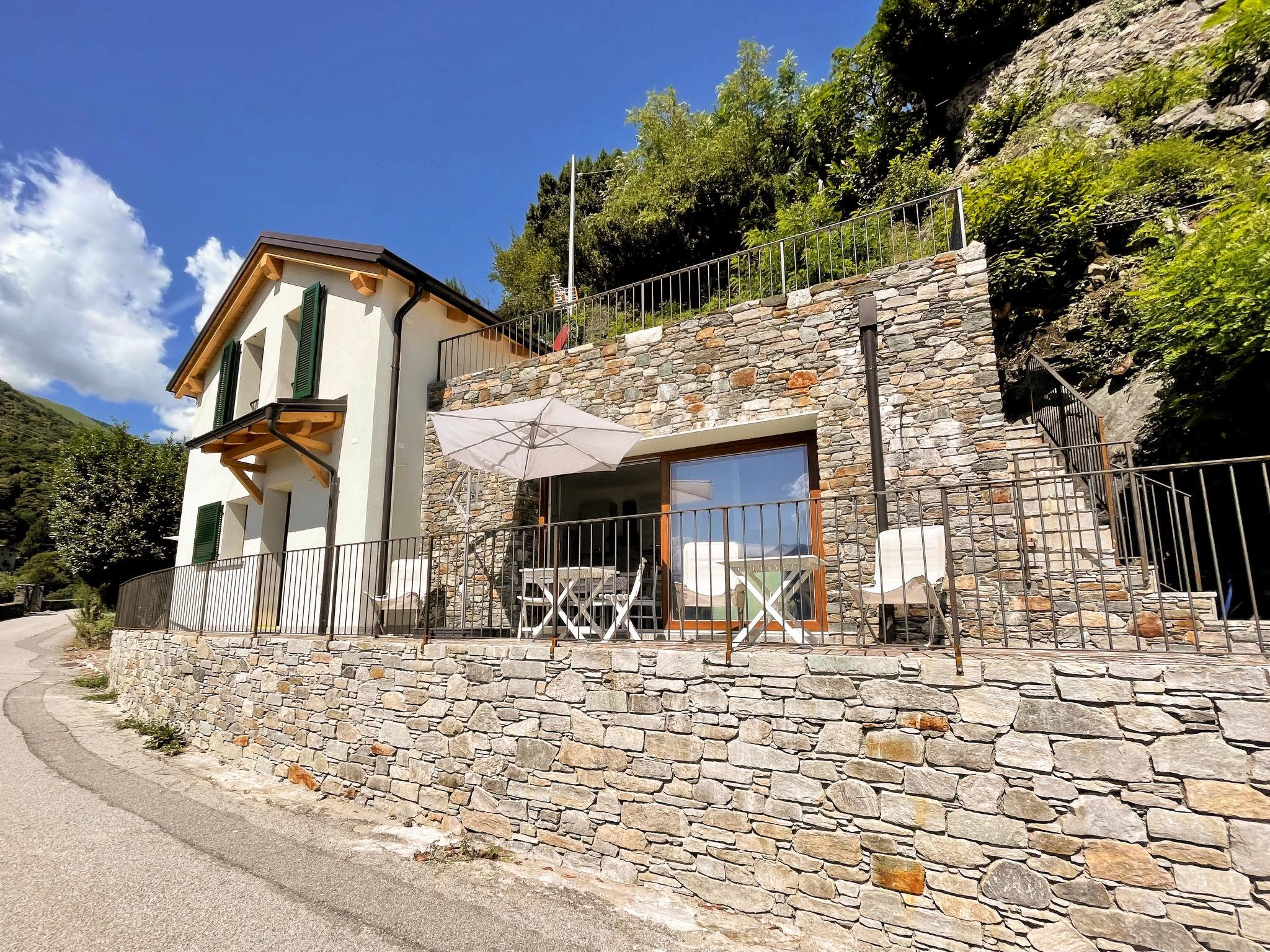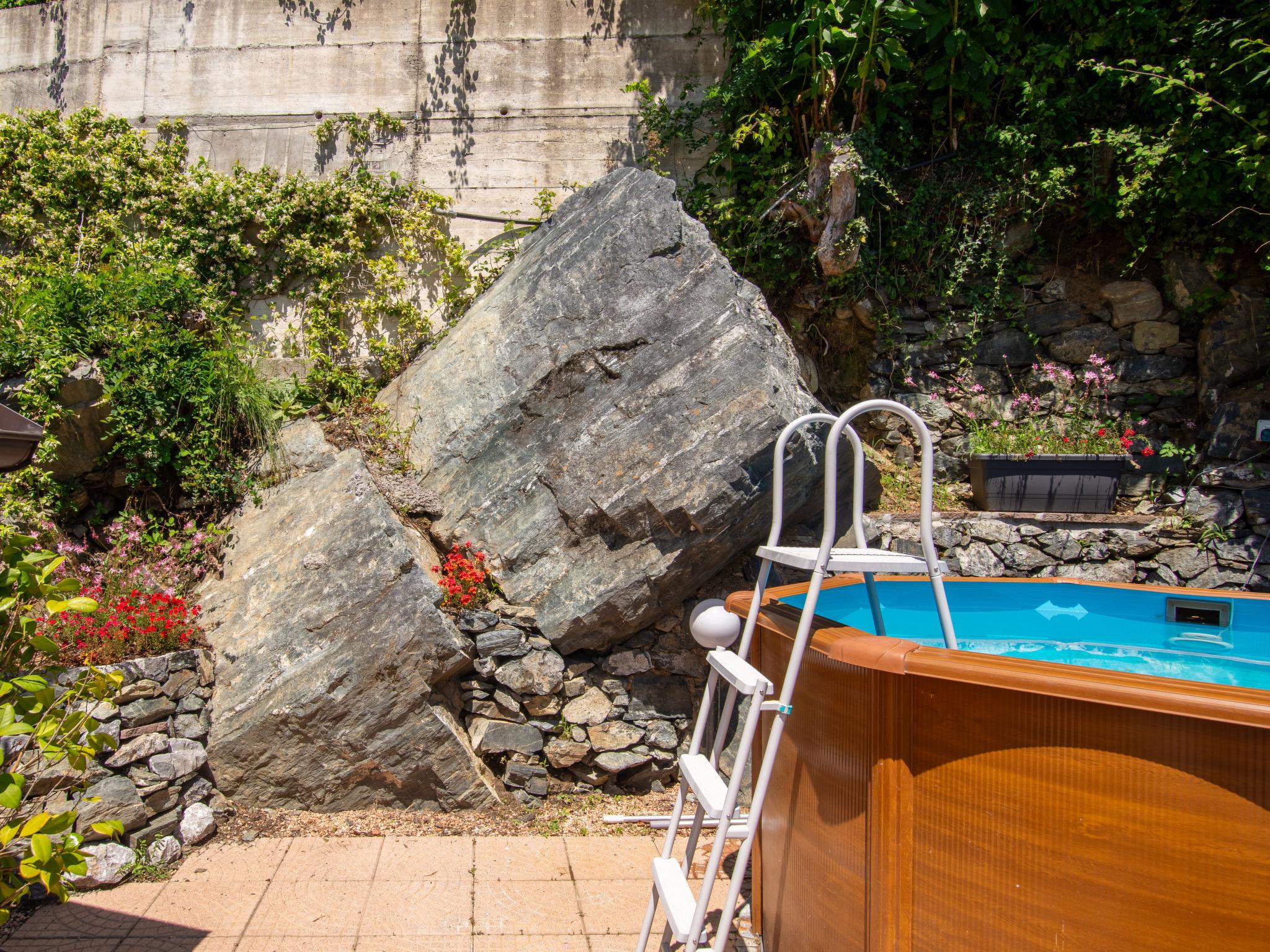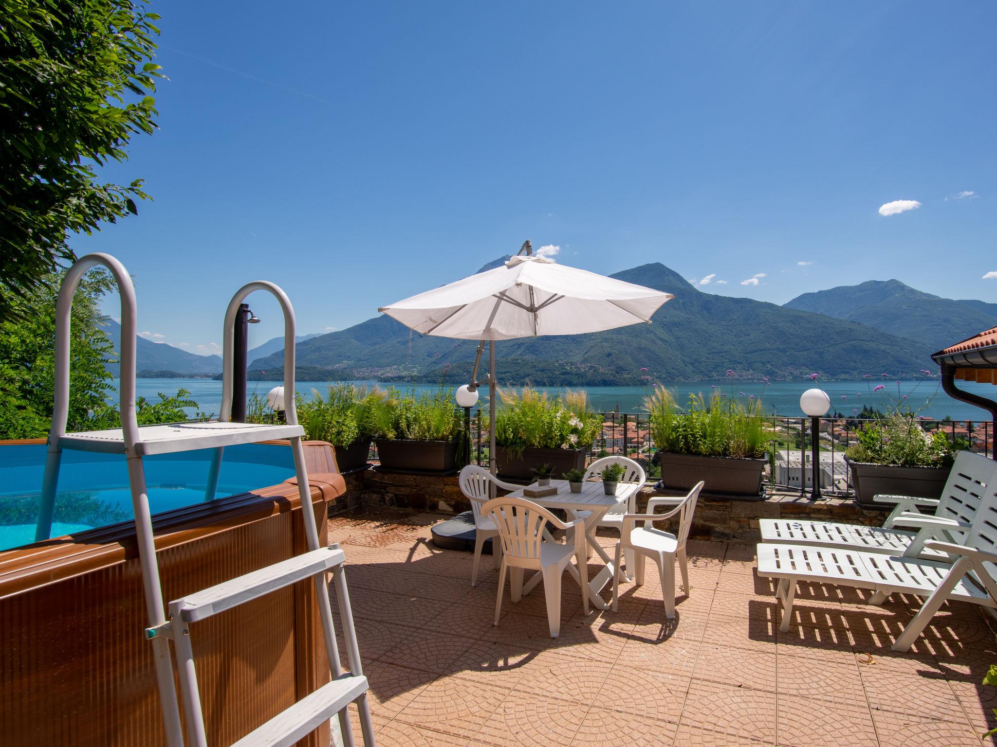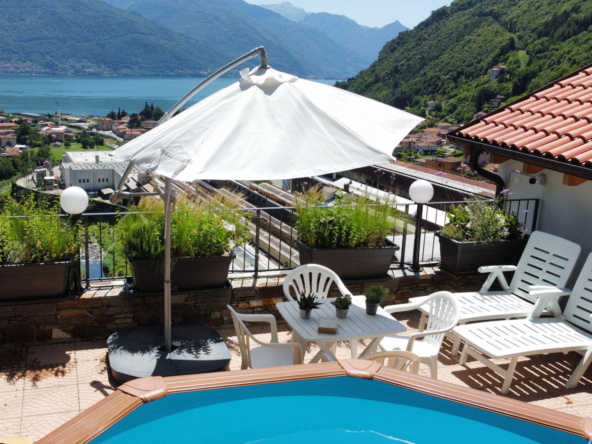 Modern villa "Anna", 2 storeys. Above Dongo 2 km from the centre of Dongo, 50 km from the centre of Como, 43 km from the centre of Lugano, in a secluded, elevated position on a slope, 1.7 km from the lake, located by a road. Private: property (fenced), swimming pool (above ground) round (2,20 m diameter, depth 130 - 140 cm, seasonal availability: 15.Apr. - 15.Sep.). Outdoor shower, terrace, garden furniture, barbecue. In the house: air conditioning, burglar alarm system. Supermarket 1.2 km, restaurant 1.5 km, bar 1.5 km, bicycle rental 2.2 km, bus stop 500 m, railway station "Como" 50 km, pebble beach 1.7 km, grass beach 1.7 km, outdoor swimming pool 6 km. Marina 2 km, golf course (18 hole) 22 km, surf school 2.2 km, sailing school 4.5 km, sports centre 1.5 km, children's playground 1.1 km. Nearby attractions: Palazzo Gallio-Gravedona, Museo della Barca Lariana-Pianello, Bellagio, Menaggio, Varenna. Well-known lakes can easily be reached: Lago di Mezzola. Please note: car recommended.