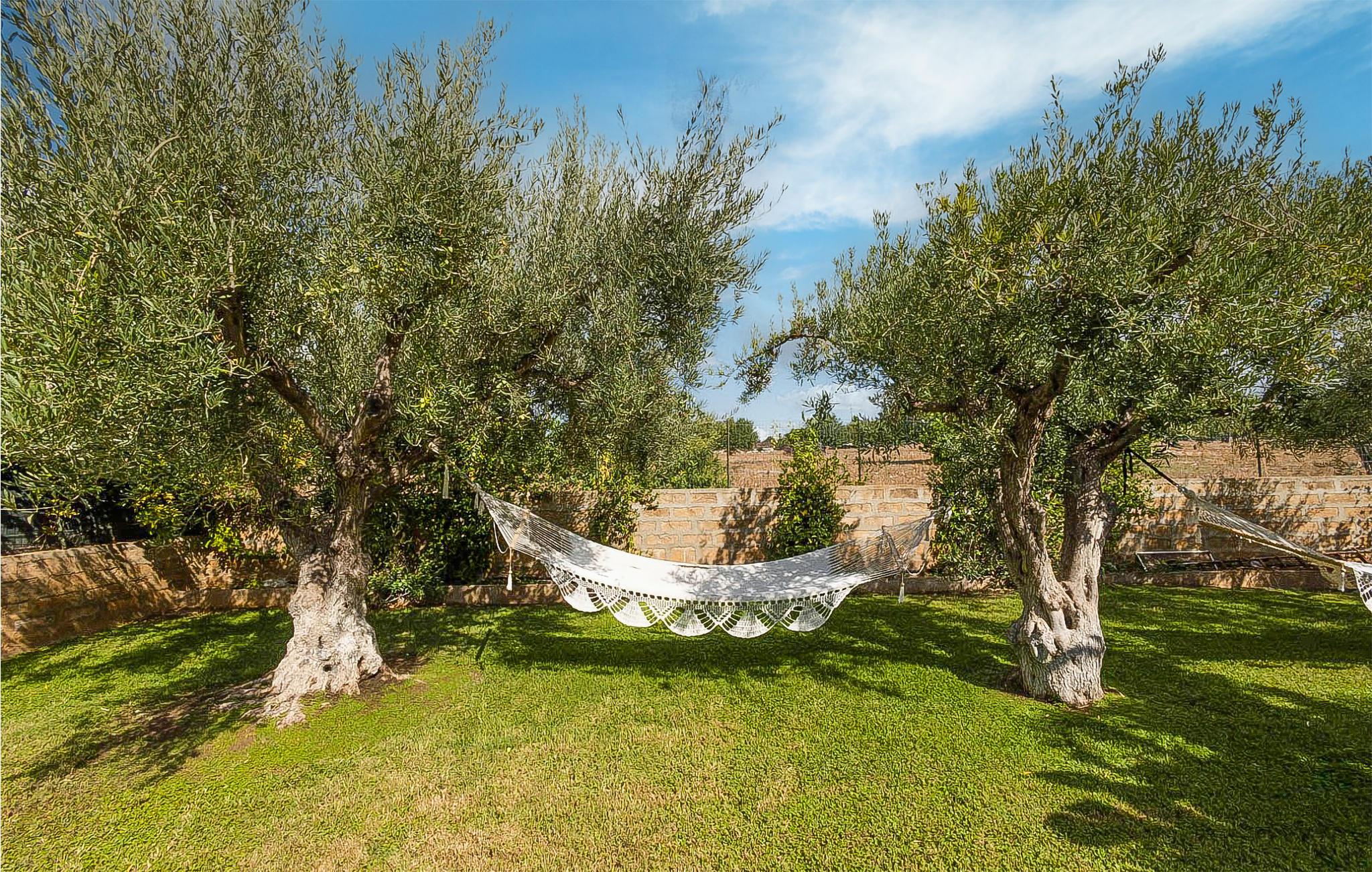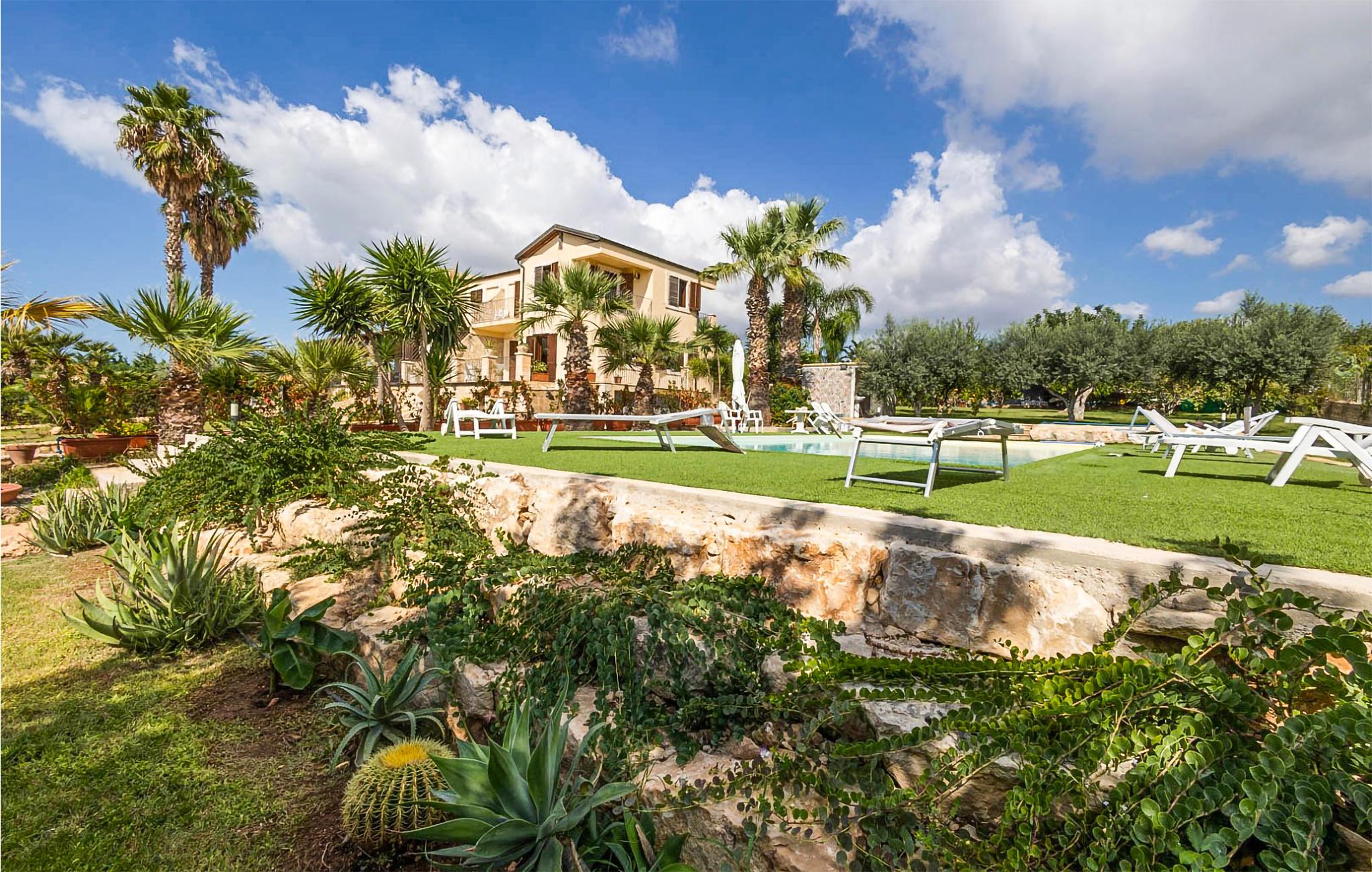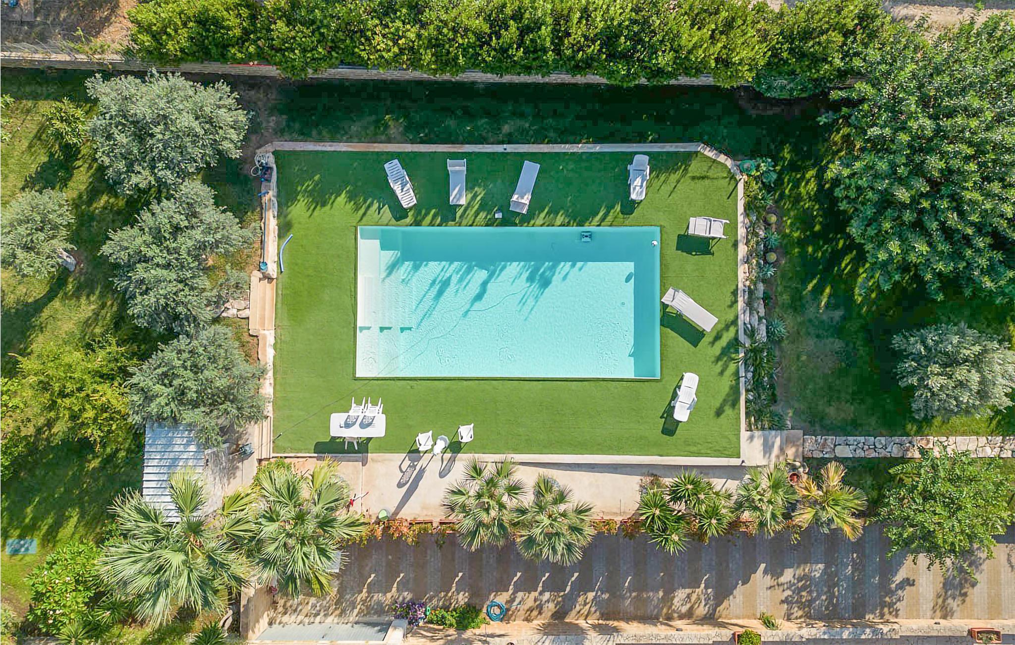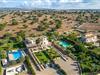 Udenfor omgiver huset en stor terrasse på ca. 150 m², som er udstyret med borde, stole, sofaer og et udendørs køkken / grillplads. Poolen er omgivet af engelsk græsplæne og er omgivet af høje hække for ekstra privatliv. På plænen er der et område for børn med udendørs legesager (rutsjebane, gynge og et lille hus). I resten af ??ejendommen er der citrus træer, frugttræer og karakteristiske palmer.