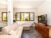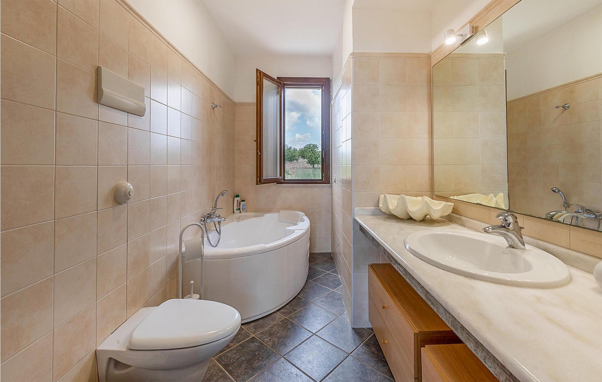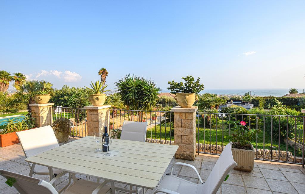 Huset er omgivet af velplejede grønne områder og tilbyder en spektakulær udsigt over havet. Villaen kan nås via en bred trappe, og indeni finder du et stort opholdsstue med stue, spiseplads og køkkenområde. På første sal er soveværelserne, det ene med havudsigt, mens det andet har en lille terrasse med udsigt over poolen og haven. Fra øverste etage har du adgang til en terrasse med spektakulær havudsigt.
