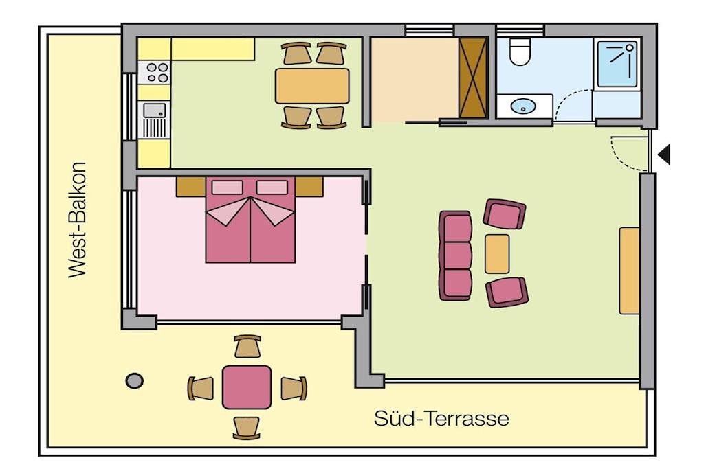 Ferielejligheden har et stort panoramasoveværelse, en opholdsstue med satellit-tv, et fuldt udstyret køkken og en sydvendt balkon. Badeværelset har bruser, toilet, bidet, hårtørrer og sminkespejl. Et ventilationssystem regulerer opvarmning og køling, hvilket sikrer et særligt behageligt indeklima. Et opvarmet swimmingpoolkompleks med en panoramalounge og en solterrasse i to niveauer samt en grustennisbane forbedrer dit velvære på vores resort. Der er et fitnessrum og en sauna i hovedbygningen.