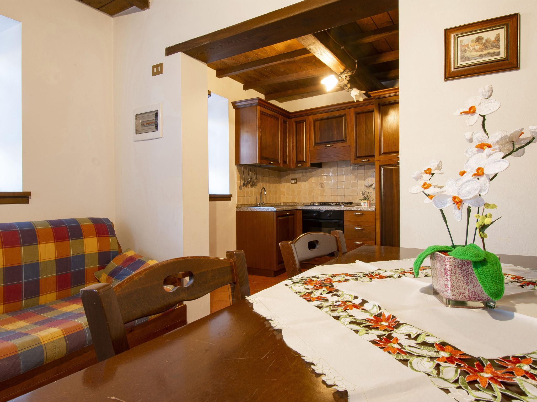 "Paradiso I", 3-room house 50 m2 on 2 levels. Renovated, simple and rustic furnishings: living/sleeping room with 1 double sofabed, open-hearth fireplace, dining table and satellite TV. Open kitchen (4 hot plates, oven, freezer, electric coffee machine). Upper floor: (steep stair), 1 room with 1 french bed (160 cm). 1 small room with 1 x 2 bunk beds. Shower/WC. Heating, gas heating. Patio. Terrace furniture, deck chairs. Beautiful view of the mountains. Facilities: children's high chair, baby cot. Internet (WiFi, free). Please note: non-smokers only. Maximum 1 pet/ dog allowed. IT040036B57UJ8J8IQ