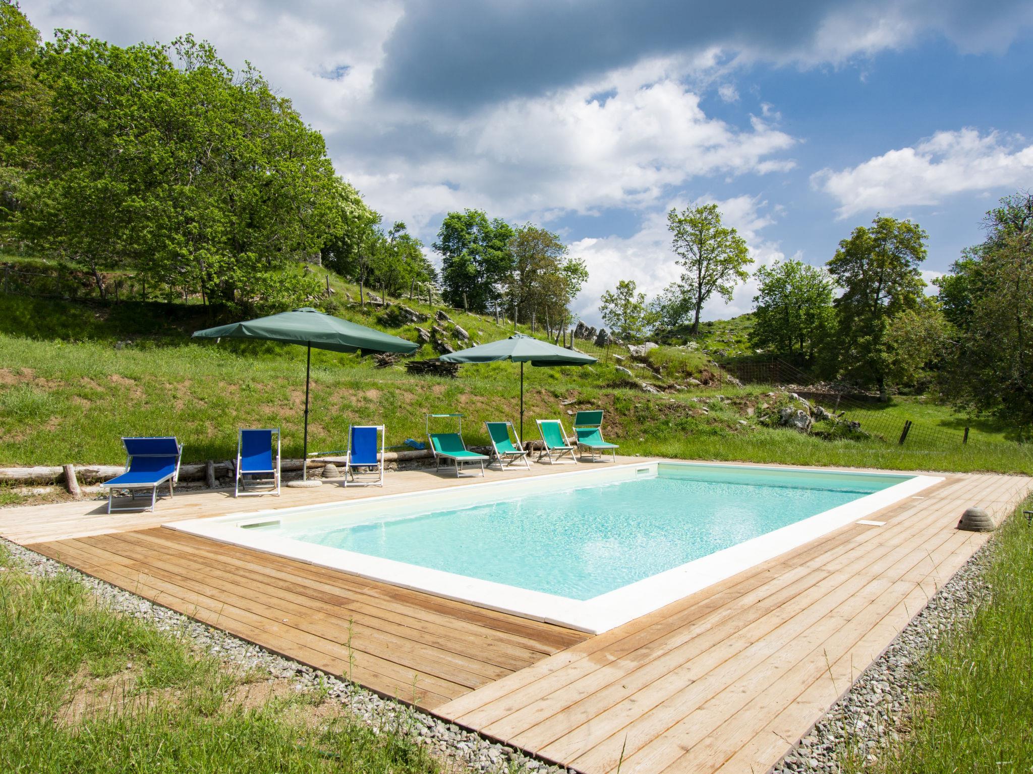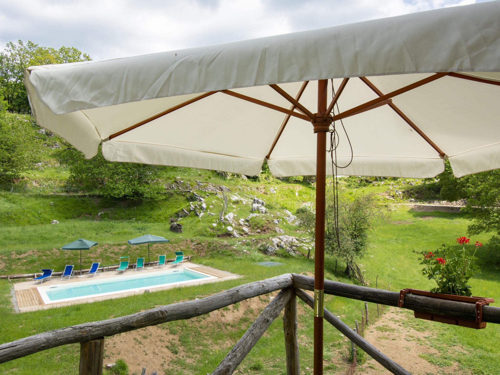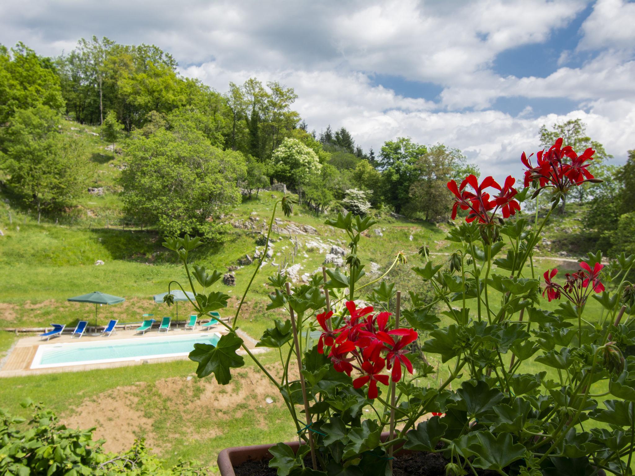 Rustic country house "Paradiso", 950 m a.s.l., detached, surrounded by trees and meadows. 2 houses in the resort. 8 km from the centre of Fabbriche di Vallico, 45 km from the centre of Lucca, 63 km from the centre of Pisa, in a secluded, elevated position, 73 km from the sea, in the countryside, in the woods. For shared use: property 10'000 m2, terraced garden (not fenced) with trees, natural garden, meadow, swimming pool (10 x 5 m, depth 140 cm, seasonal availability: 29.Apr. - 15.Oct.). Terrace, barbecue. In the house: washing machine (for shared use). 600 m long bumpy, narrow motor access to 20 m from the house (mountain road). Stepped path to the house. Parking on the premises. Shop 8 km, supermarket 20 km, restaurant 3.5 km, bus stop 3 km, sandy beach "Lido di Camaiore" 73 km, outdoor swimming pool 20 km, indoor swimming pool 20 km. Walking paths from the house 50 m.
