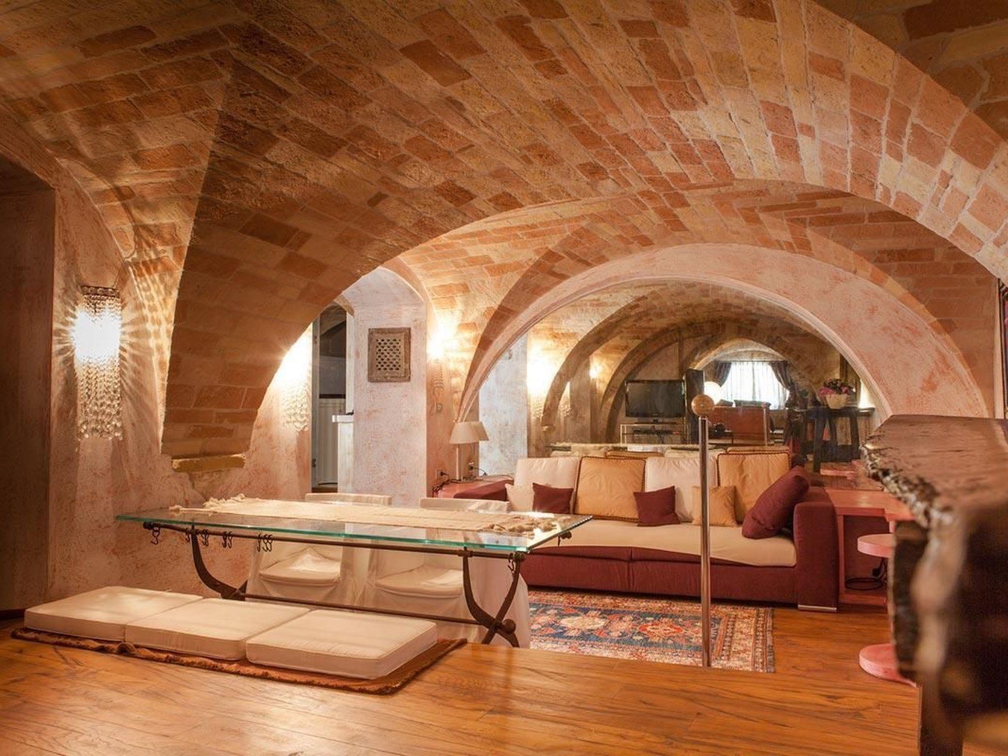 La Bottega di Giacomino is a succession of rooms and spacious alcoves that house a contemporary kitchen, a large living room that can accommodate up to six people, an open space suitable for children or couples, a comfortable double bedroom with walk-in wardrobe and a bathroom. A large, cosy, richly furnished and air-conditioned flat, where the extraordinary ceiling is interrupted by a play of vaults that intersect in an unpredictable manner, almost as if to delimit the individual rooms. The spaces blend pleasantly with the period furniture and precious fabrics that give this place its aristocratic and captivating flavour.