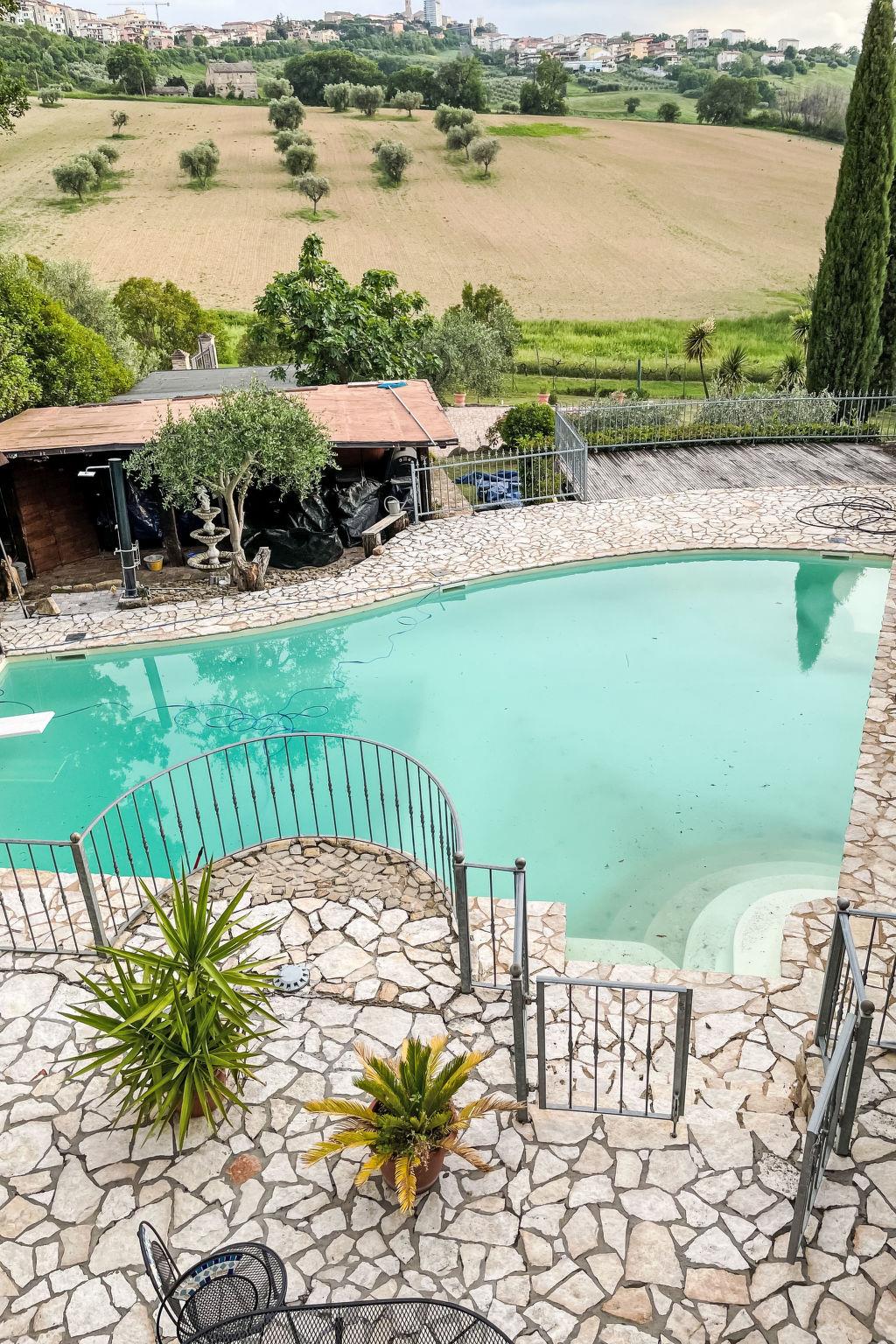 Large, beautiful farmhouse "Martin", built in 2008, renovated, surrounded by meadows and fields. Outside the resort Montegranaro, 15 km from the sea. Private: property 600 m2 (fenced), well-kept garden 400 m2, swimming pool (10 x 6 m, depth 140 - 240 cm, seasonal availability: 01.Apr. - 15.Oct.) with internal staircase. Unconventional pool shape. WC in the pool area, paddling pool, outdoor shower, pool house, terrace, garden furniture, barbecue, parking (for 5 cars) on the premises. Bus stop 700 m, sandy beach "Civitanova Marche" 8 km pebble beach "Civitanova Marche" 8 km. The owner does not accept any youth groups.