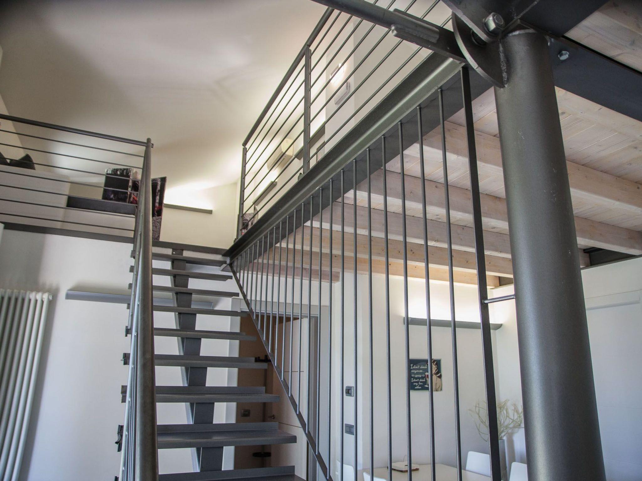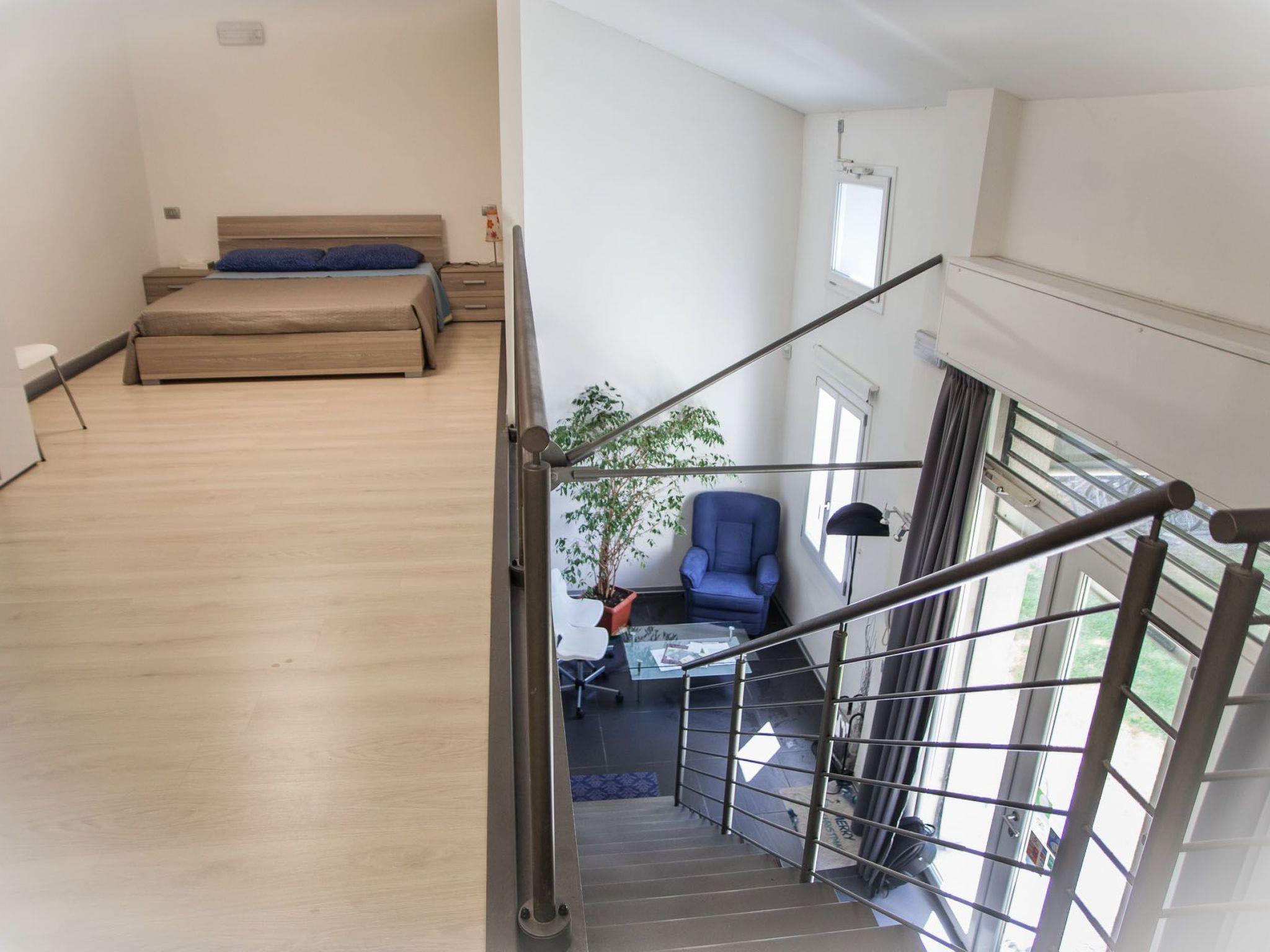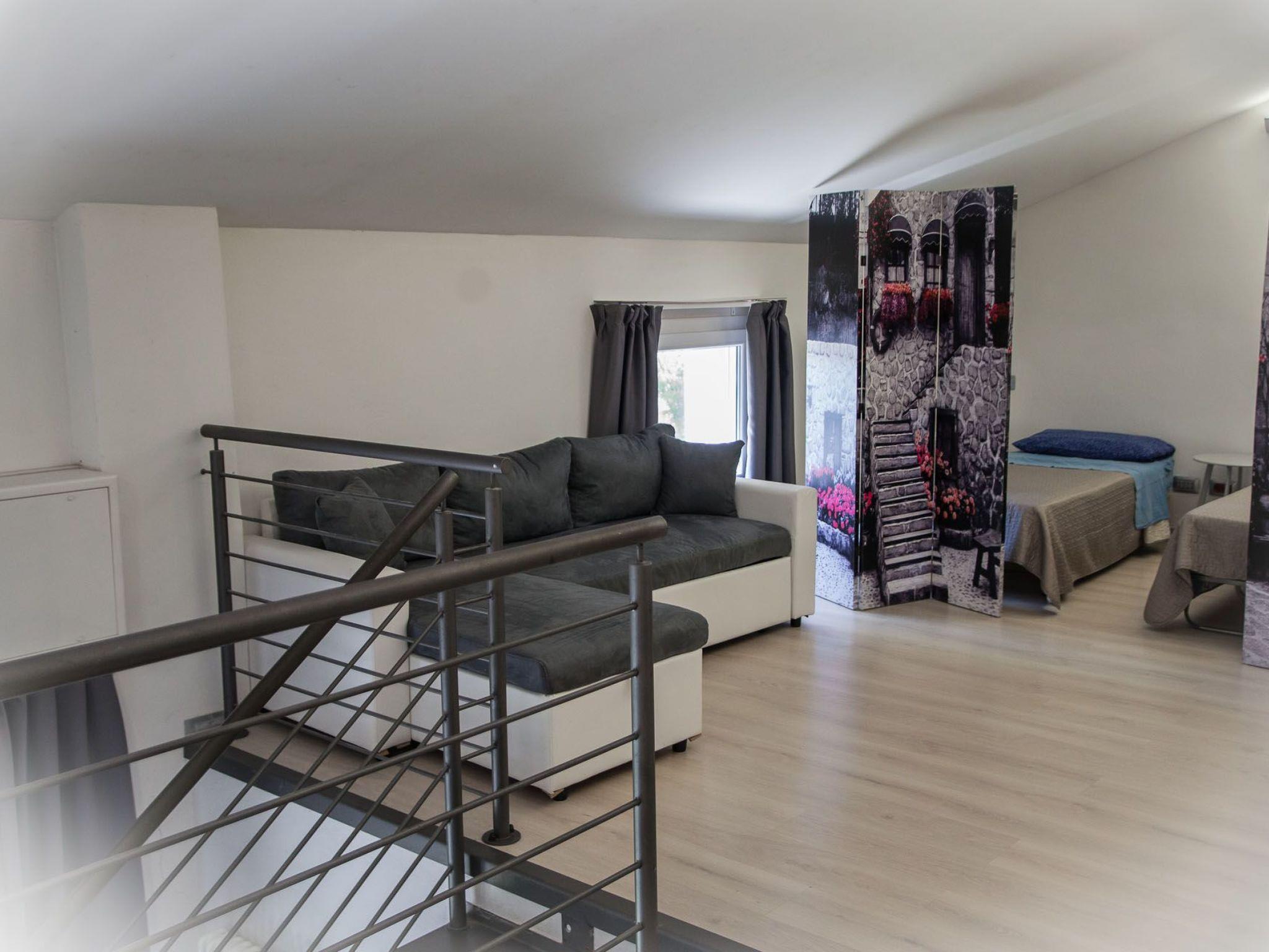 On the mezzanine floor is the open-plan sleeping area with a double bed, two single beds and a double sofa bed.