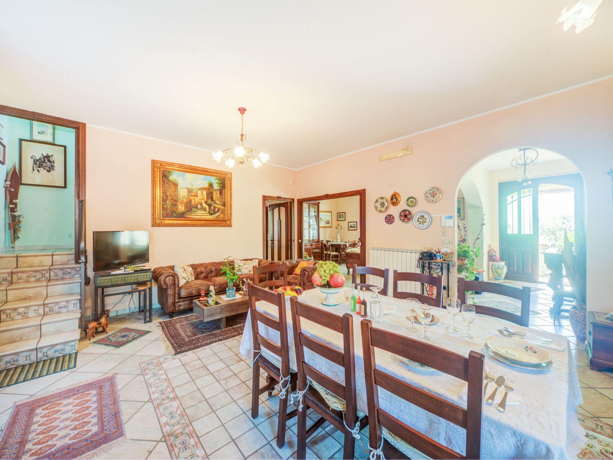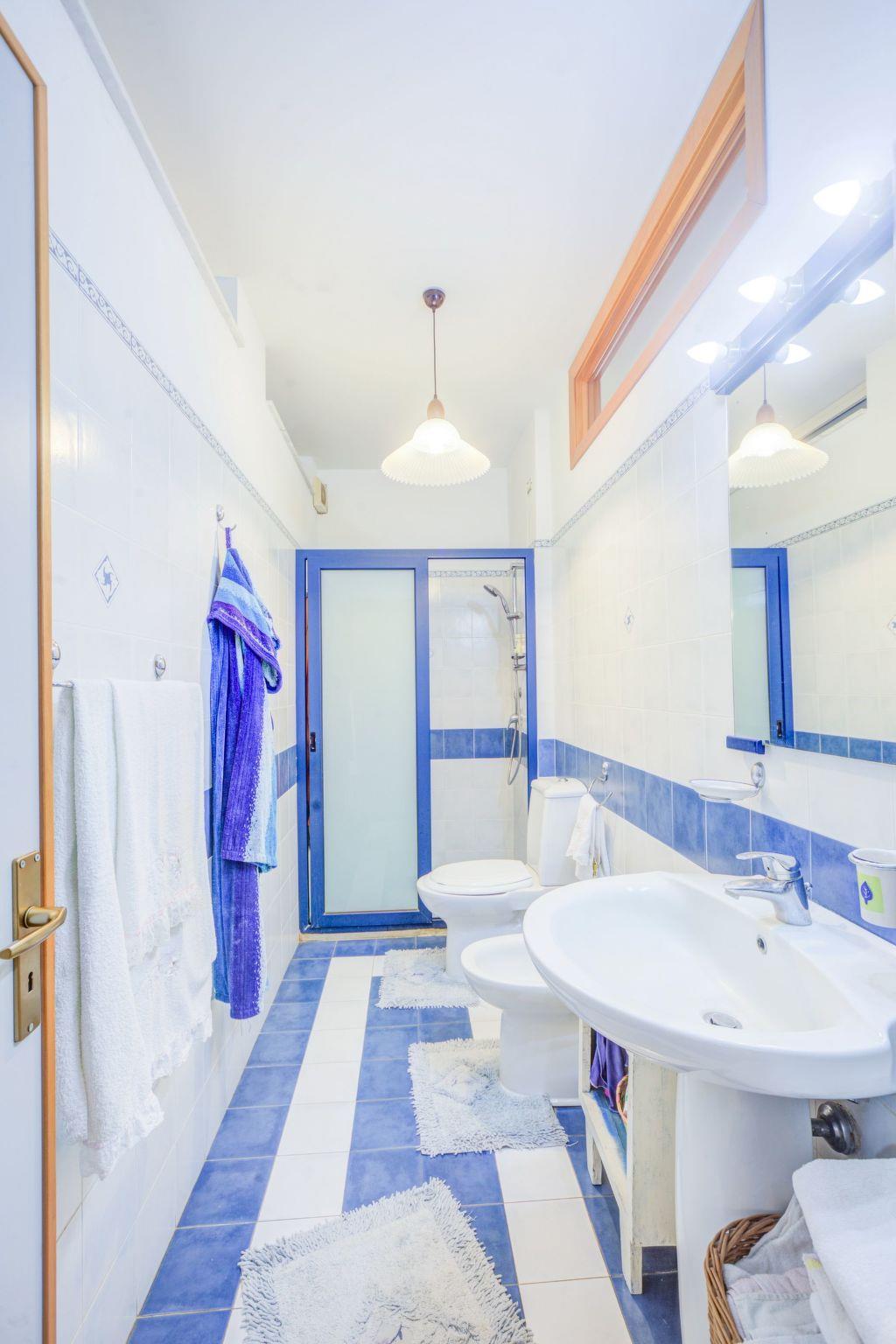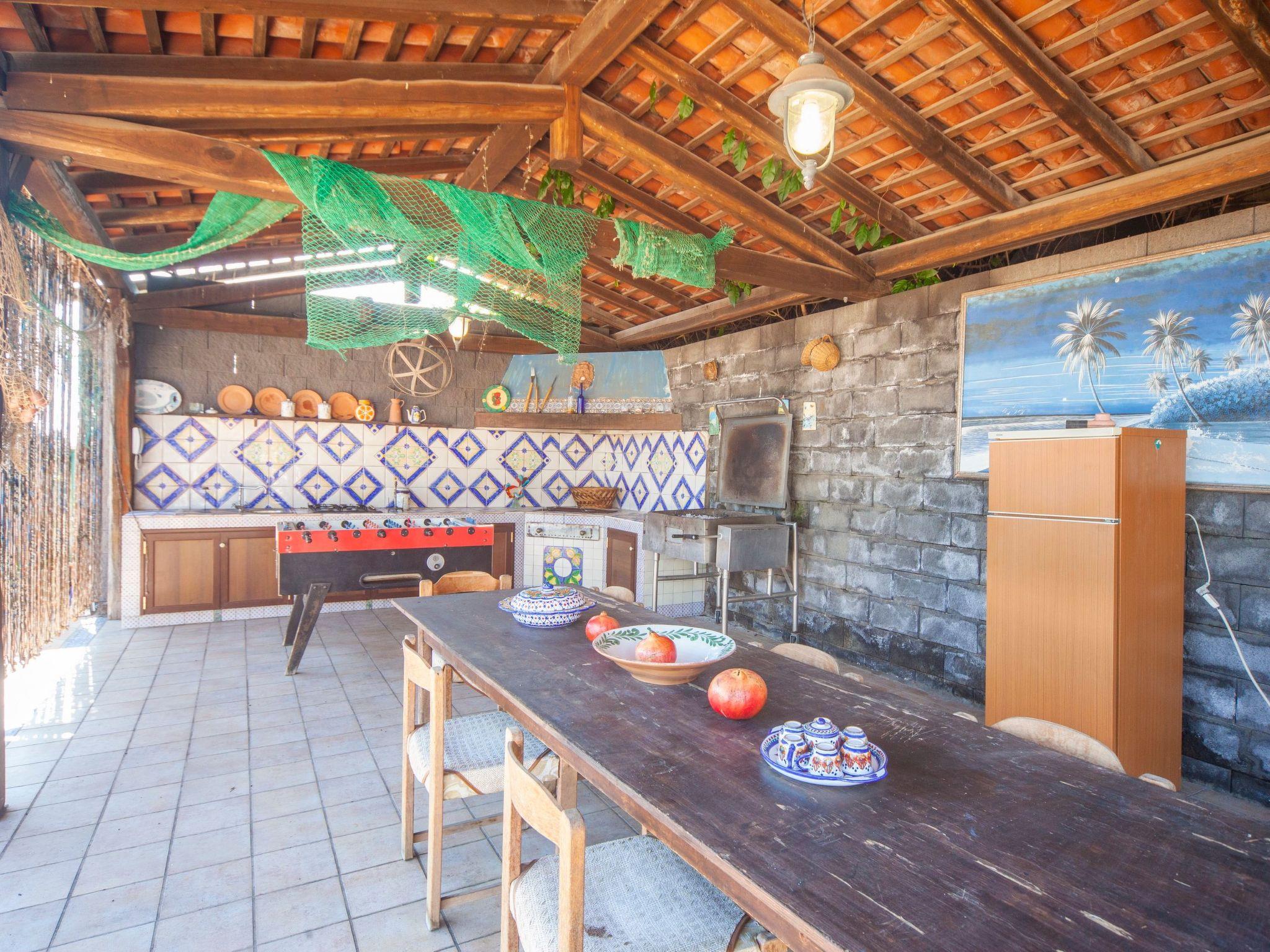 The main entrance leads directly into an open space with a large Sicilian rustic style kitchen, dining table and a living room with sofas, armchairs and television. Part of this living room can be completely isolated turning in a bedroom with a double sofa bed. On this ground floor there is also an elegant double bedroom and a bathroom with hydromassage tub.