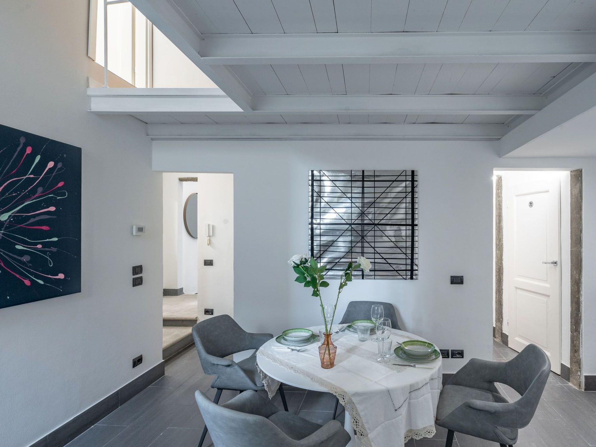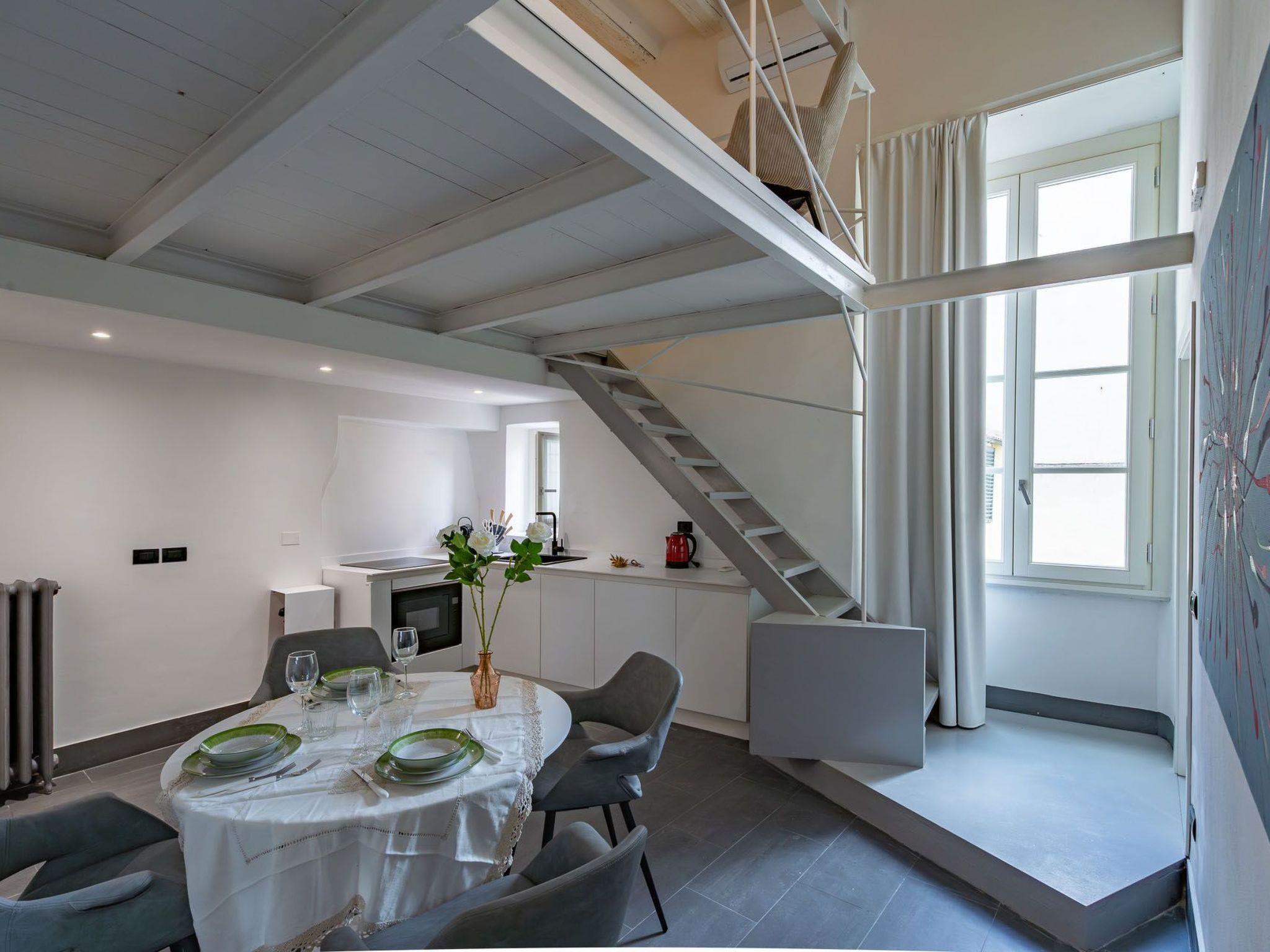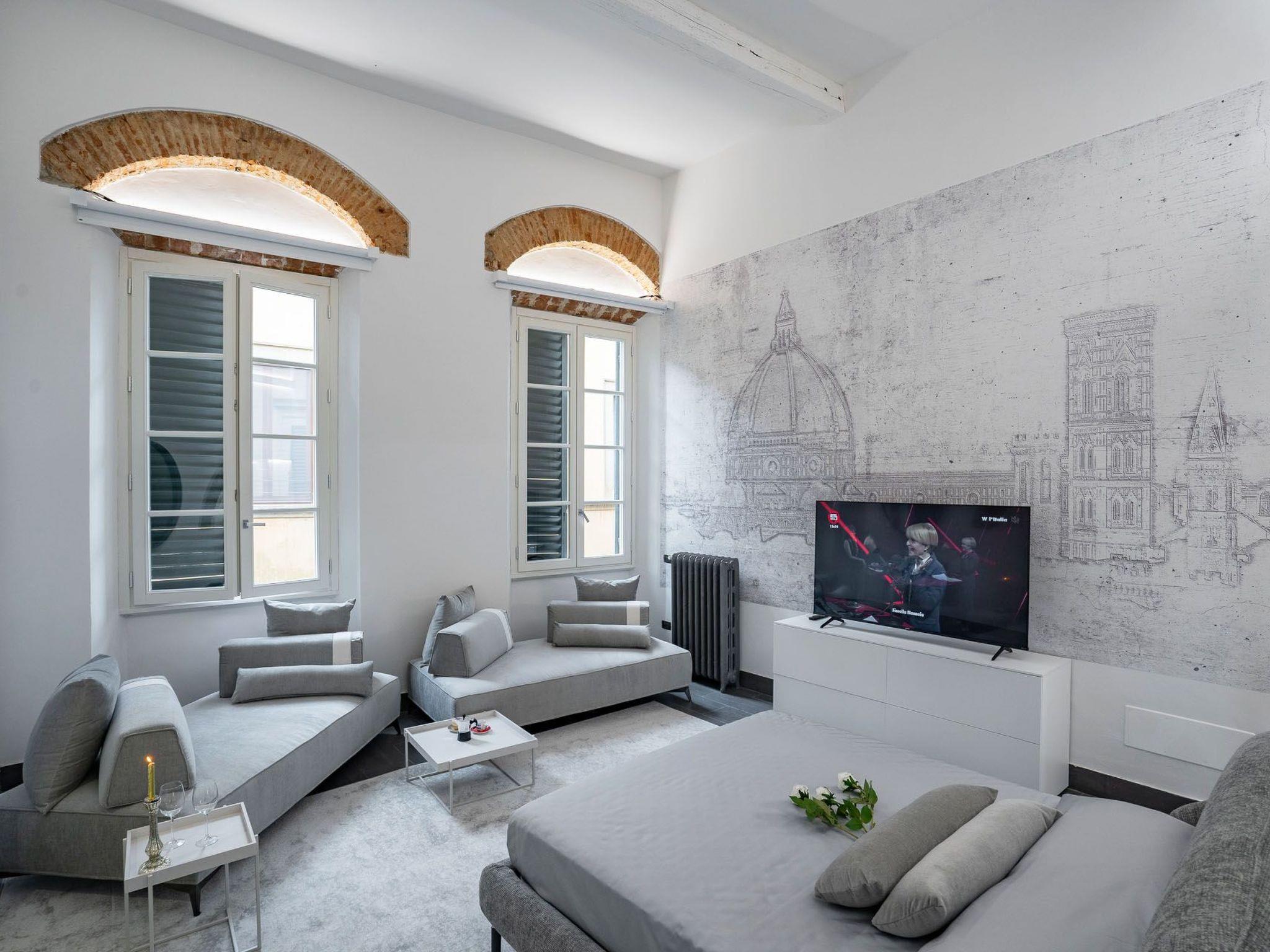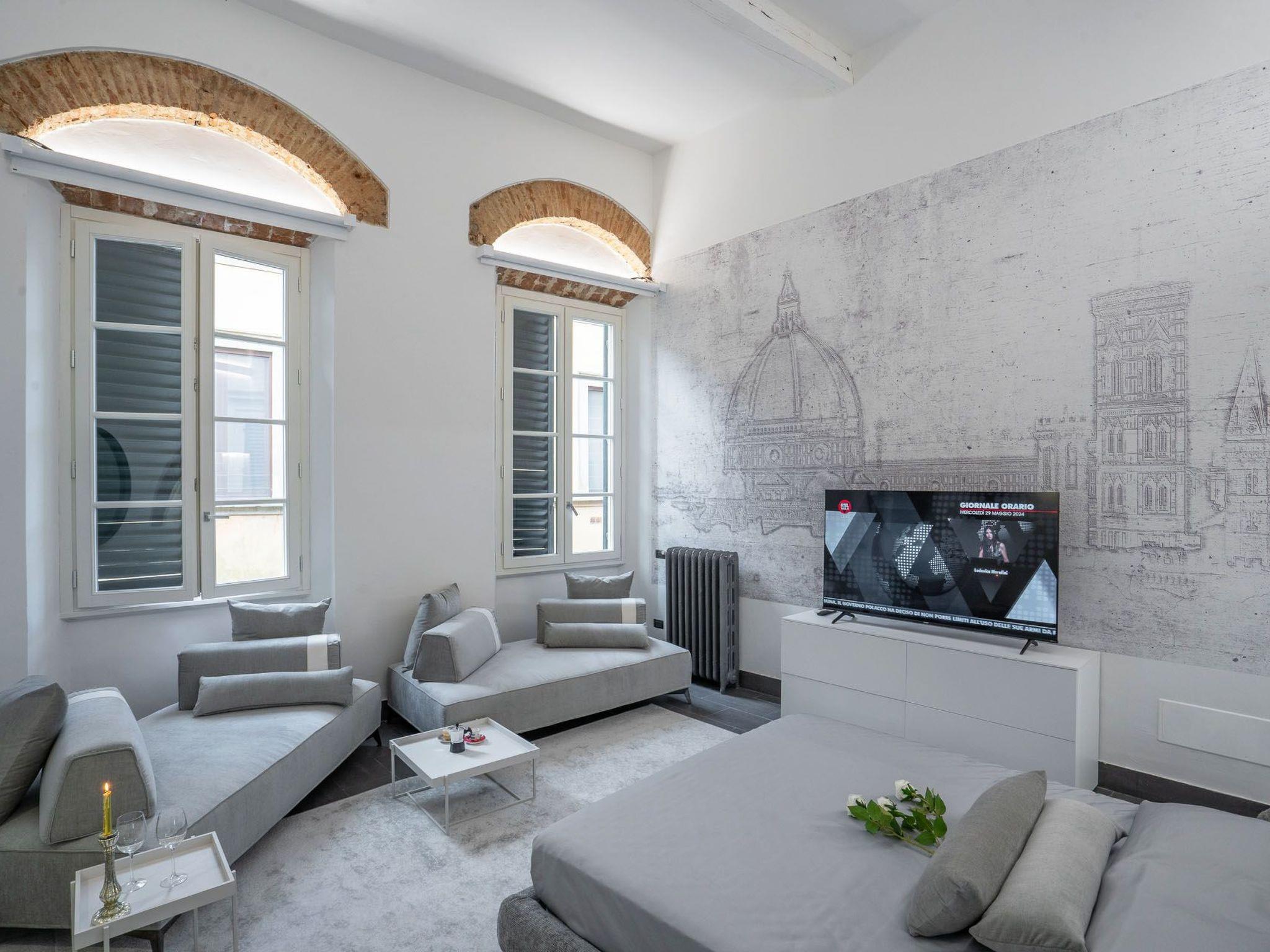 Via Giraldi House | interno 7 is located on the second floor of a neo-Renaissance building with lift in one of the beautiful Florentine streets. just a few steps away from Florence Cathedral and Piazza della Signoria. This air-conditioned flat can accommodate up to 6 people. The two double bedrooms and two bathrooms are designed to make this an ideal stay for 4 people. In the main room, where two large windows provide natural light, two designer sofa beds also offer the possibility of accommodating two more people. A 50" television, modern furnishings and automated blinds complete this room. The other room is located on the mezzanine, reached by a wooden staircase, with warm wooden parquet flooring and an en-suite bathroom. Definitely romantic. The modern kitchen is fully equipped (induction hob, combi-oven, dishwasher).