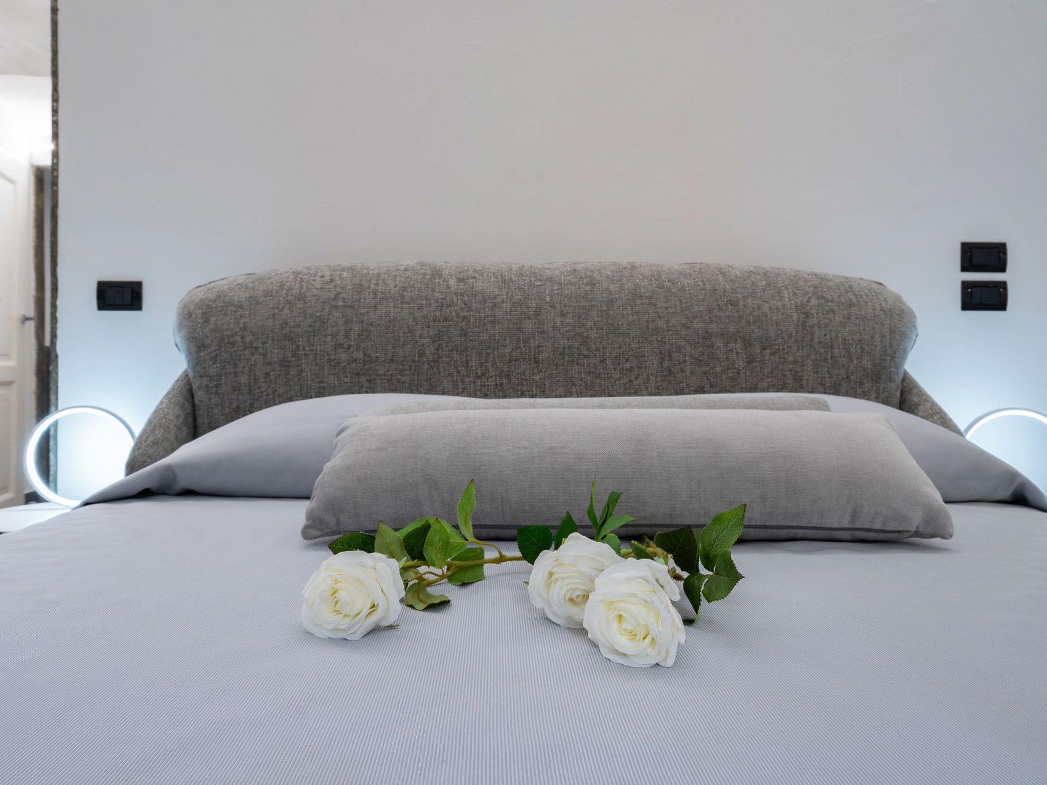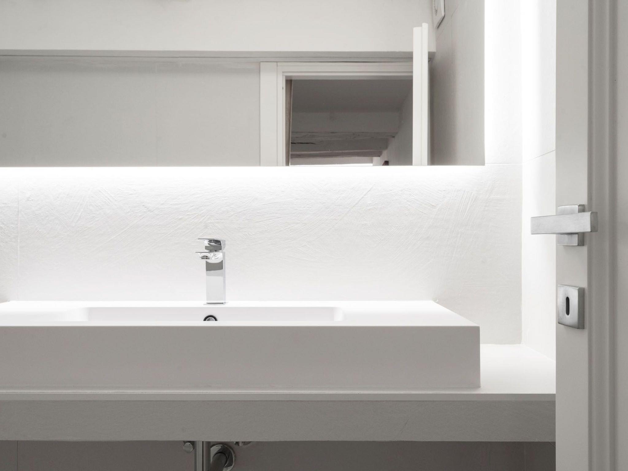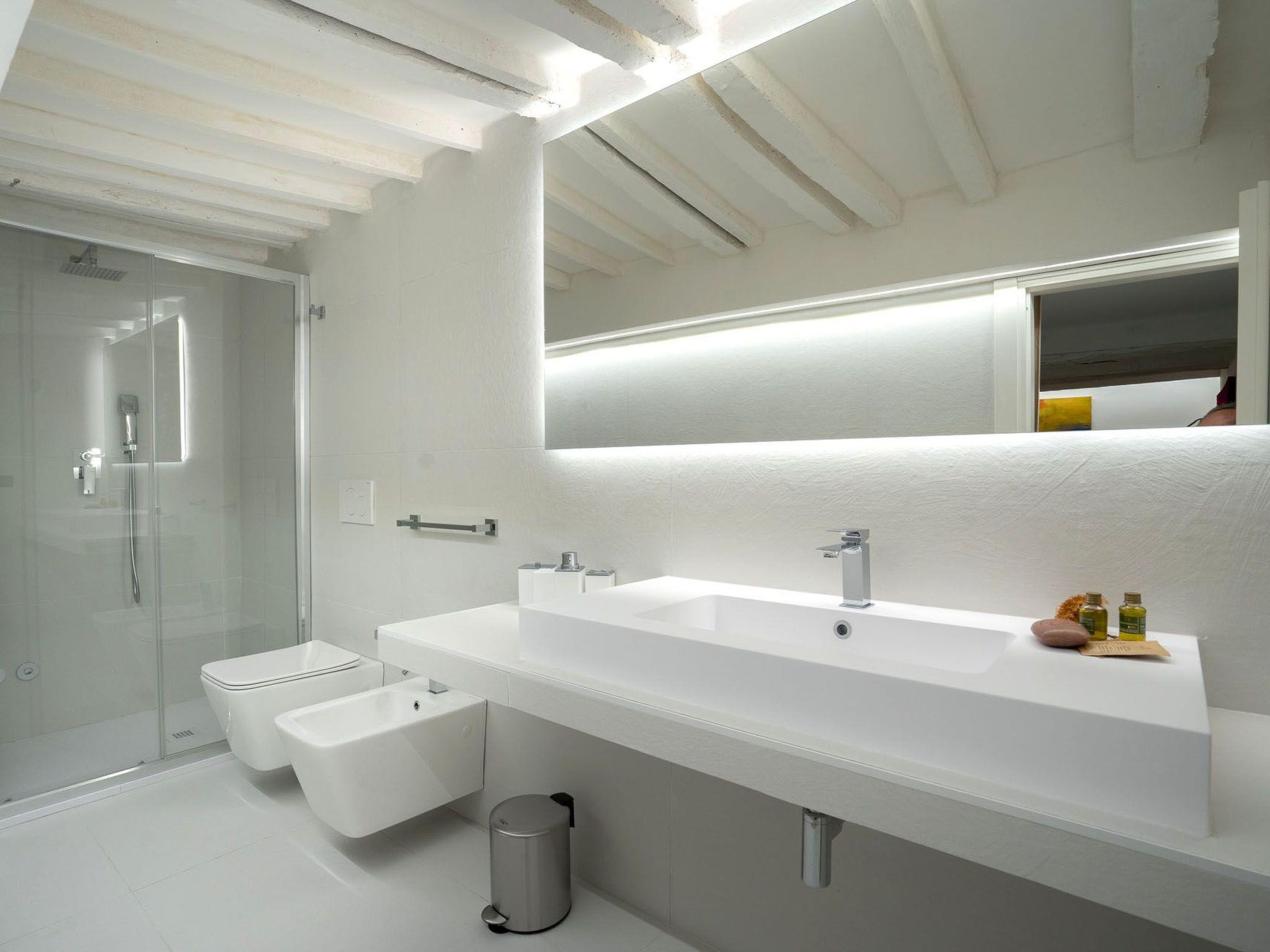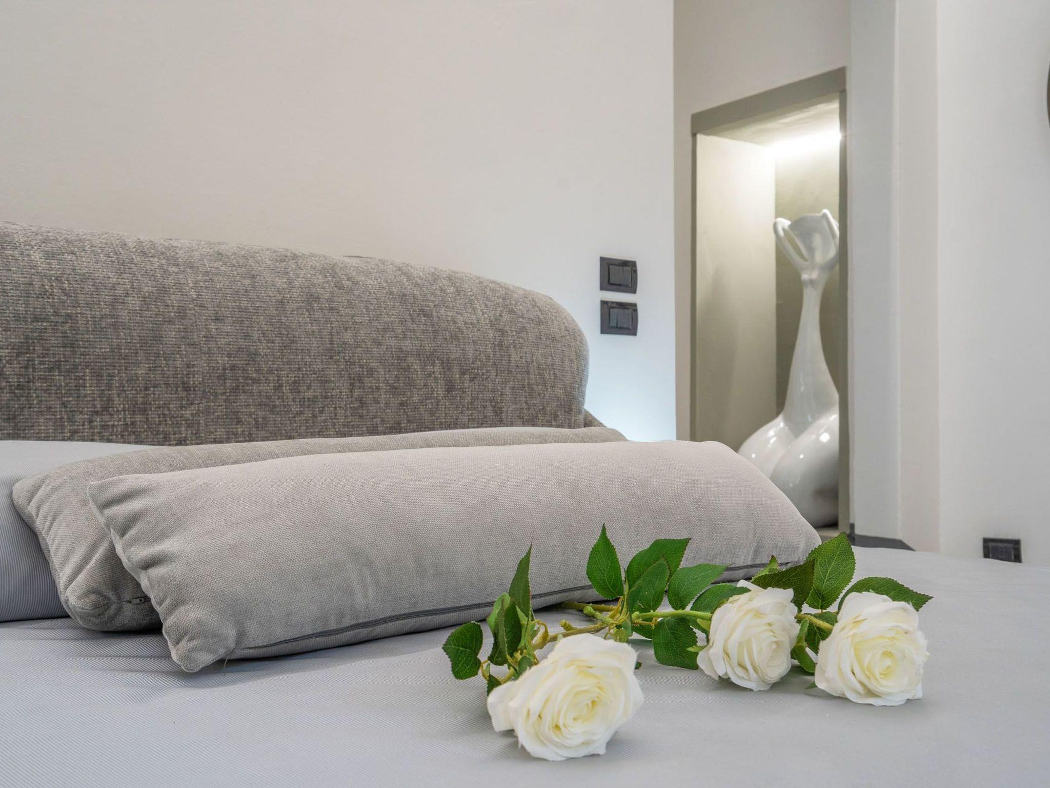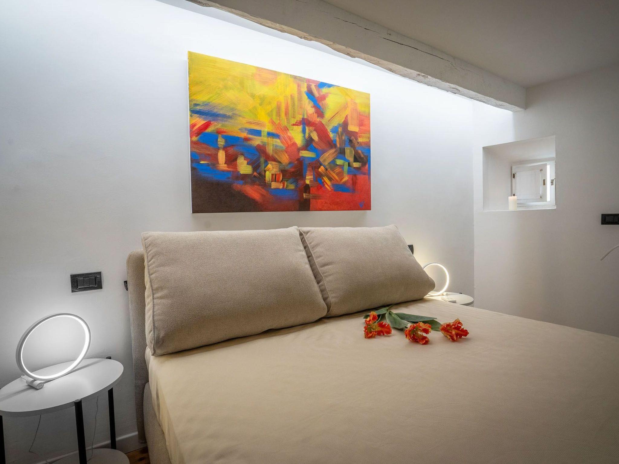 Via Giraldi House | interno 7 is located on the second floor of a neo-Renaissance building with lift in one of the beautiful Florentine streets. just a few steps away from Florence Cathedral and Piazza della Signoria. This air-conditioned flat can accommodate up to 6 people. The two double bedrooms and two bathrooms are designed to make this an ideal stay for 4 people. In the main room, where two large windows provide natural light, two designer sofa beds also offer the possibility of accommodating two more people. A 50" television, modern furnishings and automated blinds complete this room. The other room is located on the mezzanine, reached by a wooden staircase, with warm wooden parquet flooring and an en-suite bathroom. Definitely romantic. The modern kitchen is fully equipped (induction hob, combi-oven, dishwasher).