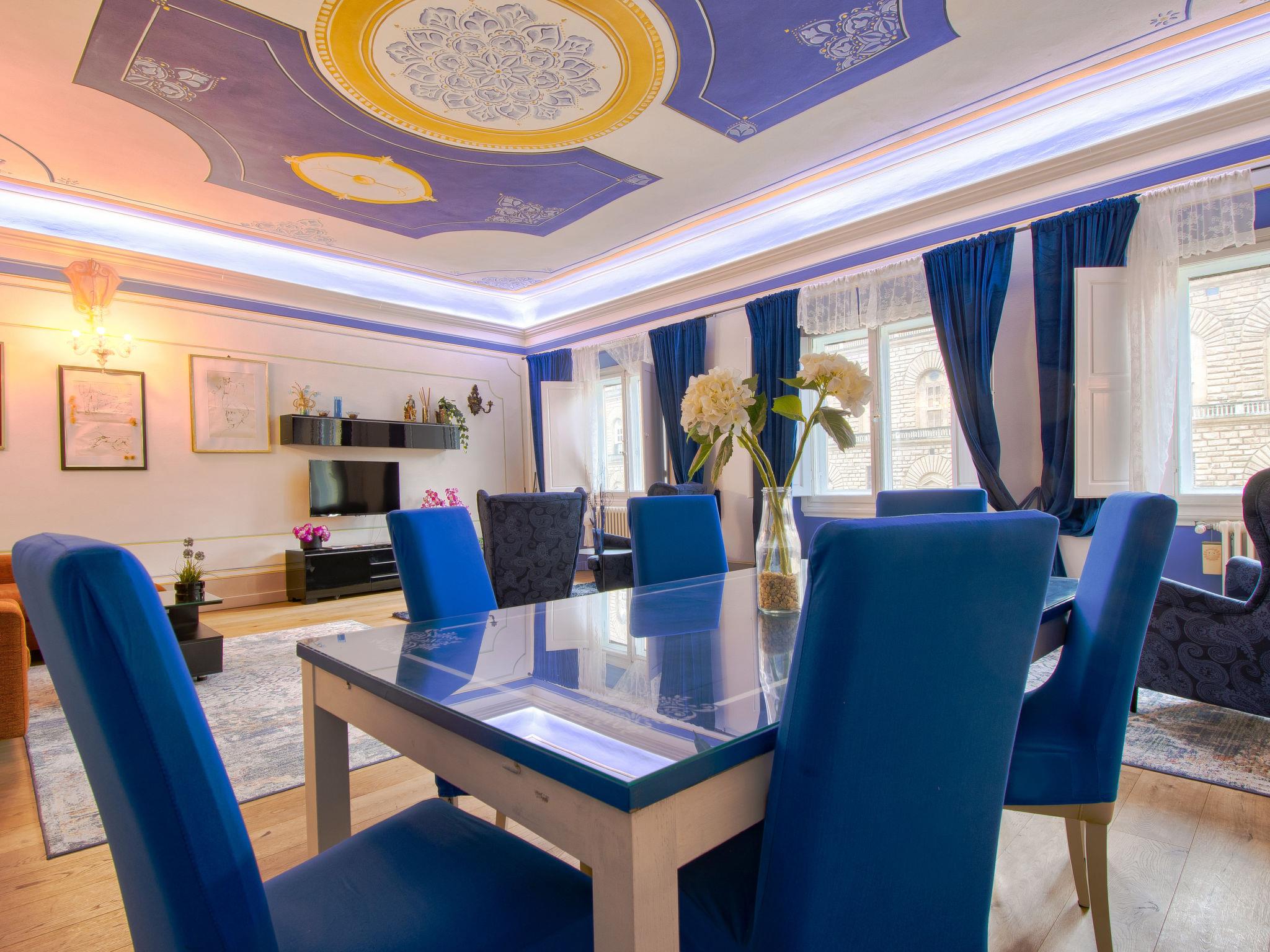 "Bellevue Palazzo Pitti", 4-room apartment 170 m2 on 3rd floor. Beautiful and stylish furnishings: entrance hall. Large living/dining room with TV and air conditioning. 1 double bedroom with TV and air conditioning. 1 room with 2 beds and air conditioning. 1 room with 2 beds and air conditioning. Kitchen (4 hot plates, dishwasher, toaster, kettle, microwave, freezer). 2 showers/bidet/WC. Facilities: washing machine, dryer, iron, hair dryer. Internet (WiFi, free). Please note: non-smokers only. Smoke alarm, fire extinguisher. From the large living room you can admire a beautiful view of Piazza Pitti. When there are less than the maximum number of guests staying at the property, not all of the bedrooms will be available for use. IT048017B4ZCDH7875