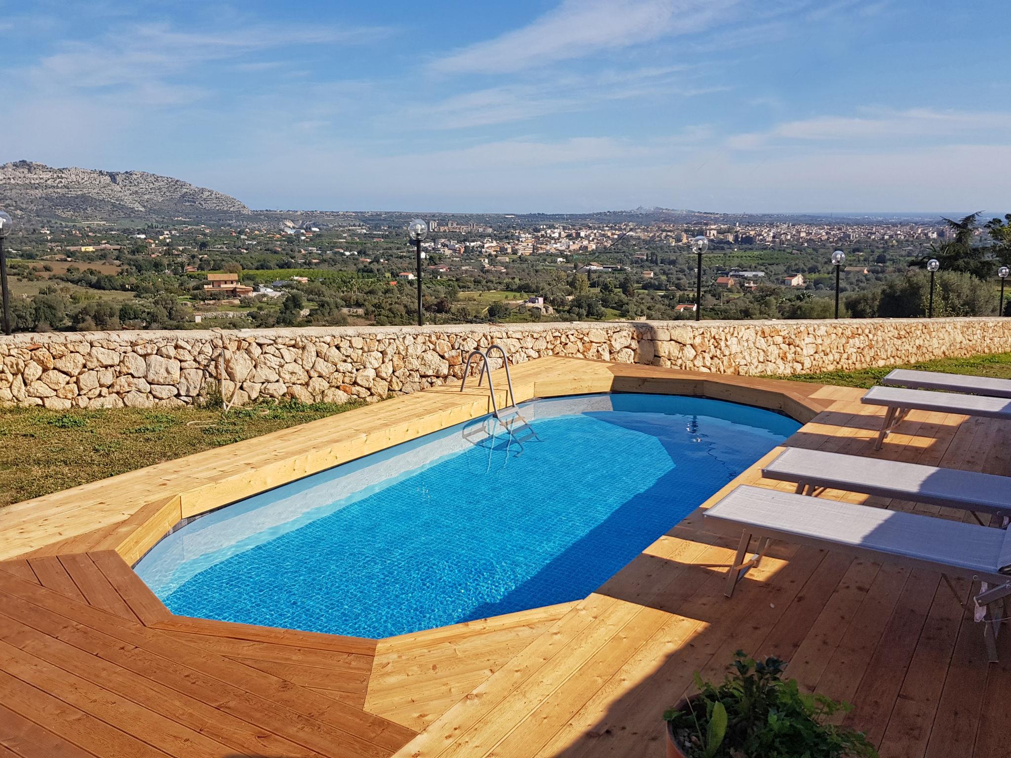 Villa "Bellavista". In the resort 5 km from the centre of Floridia, 20 km from the centre of Siracusa, in a secluded, sunny position, 20 km from the sea, 22 km from the beach. Private: property 1'700 m2 (fenced), garden 40 m2, swimming pool (above ground) (7 x 3 m, depth 120 cm, seasonal availability: 01.Apr. - 31.Oct.). Outdoor shower, pool maintenance by the owner/gardener. Parking (for 2 cars) on the premises. Grocery 4 km, supermarket 2.5 km, restaurant 4 km, bus stop 2.5 km, sandy beach "Fontane Bianche" 22 km. Tennis 6 km, riding stable 7 km. Nearby attractions: Necropoli di Pantalica 43 km, Noto 44 km, Marzamemi 57 km, Catania 60 km, Ragusa 70 km, Modica 77 km. Hiking paths: Riserva Naturale Cavagrande di Cassibile 32 km, Riserva Naturale Faunistica Vendicari 47 m. Please note: car recommended.