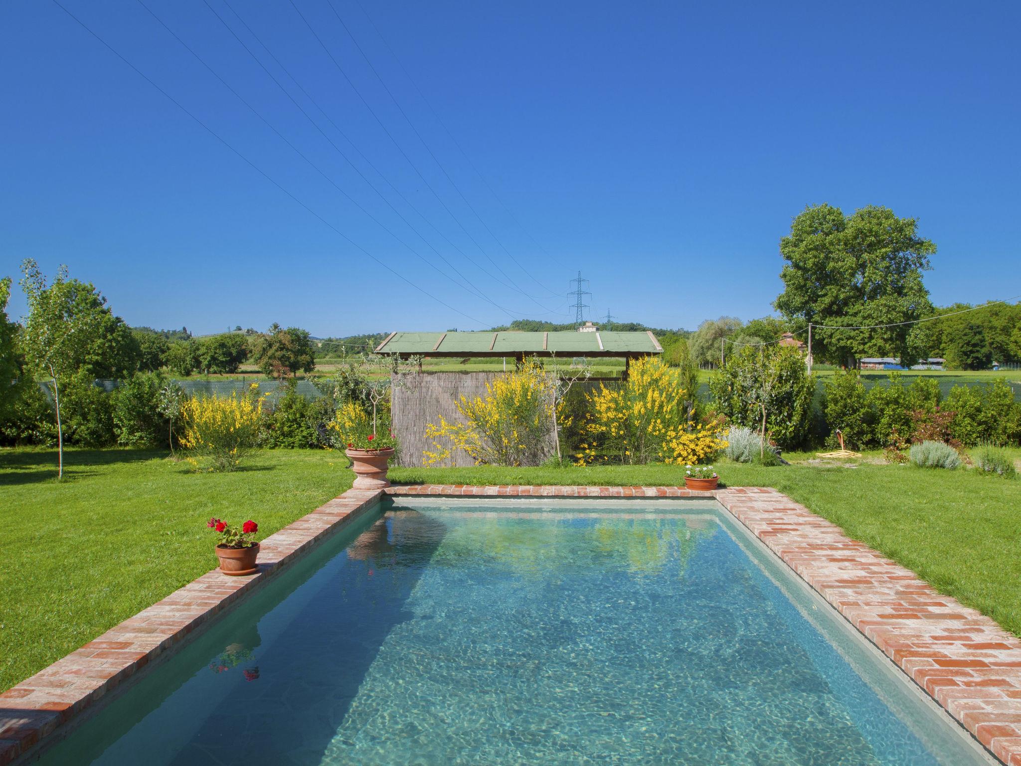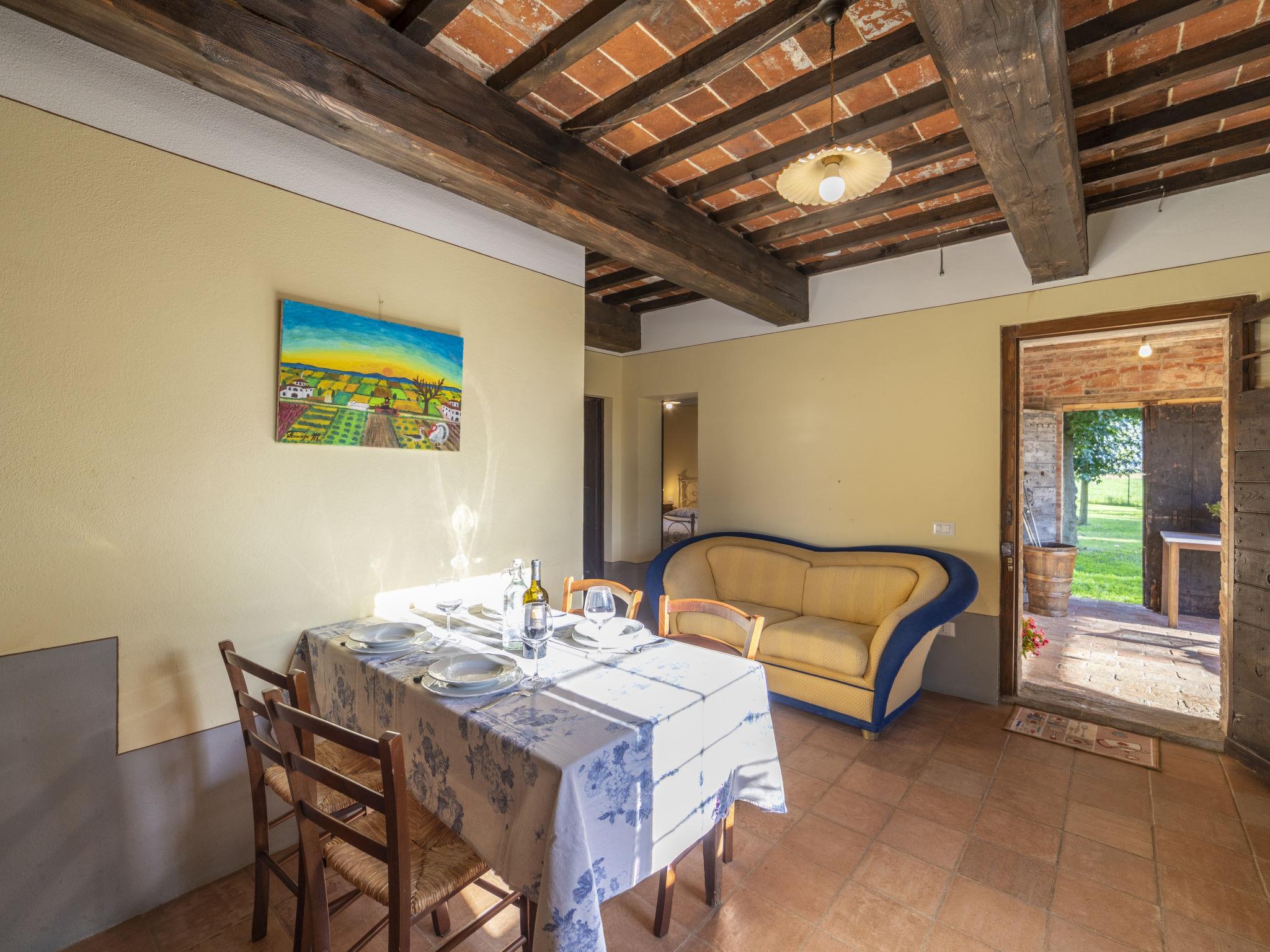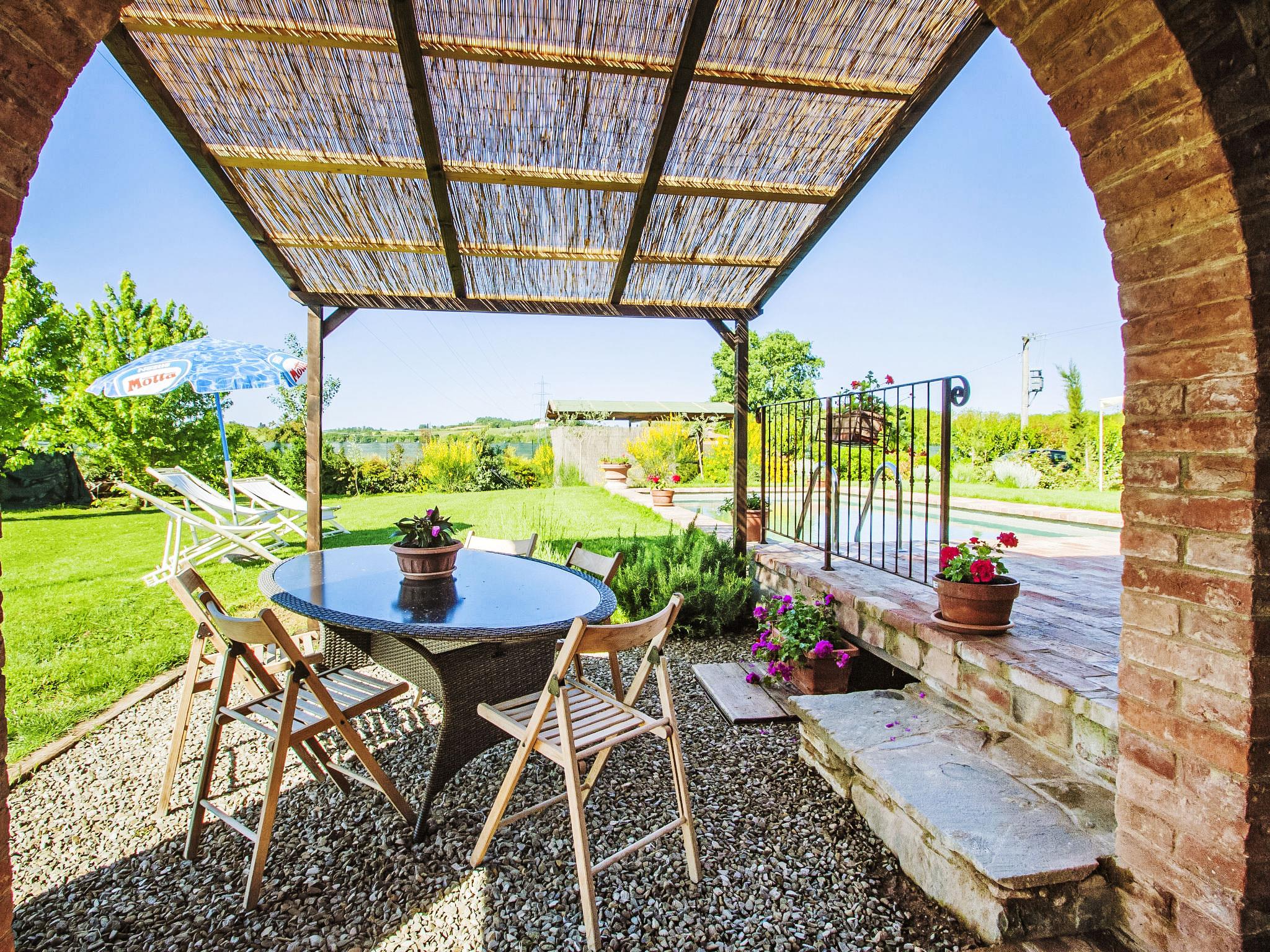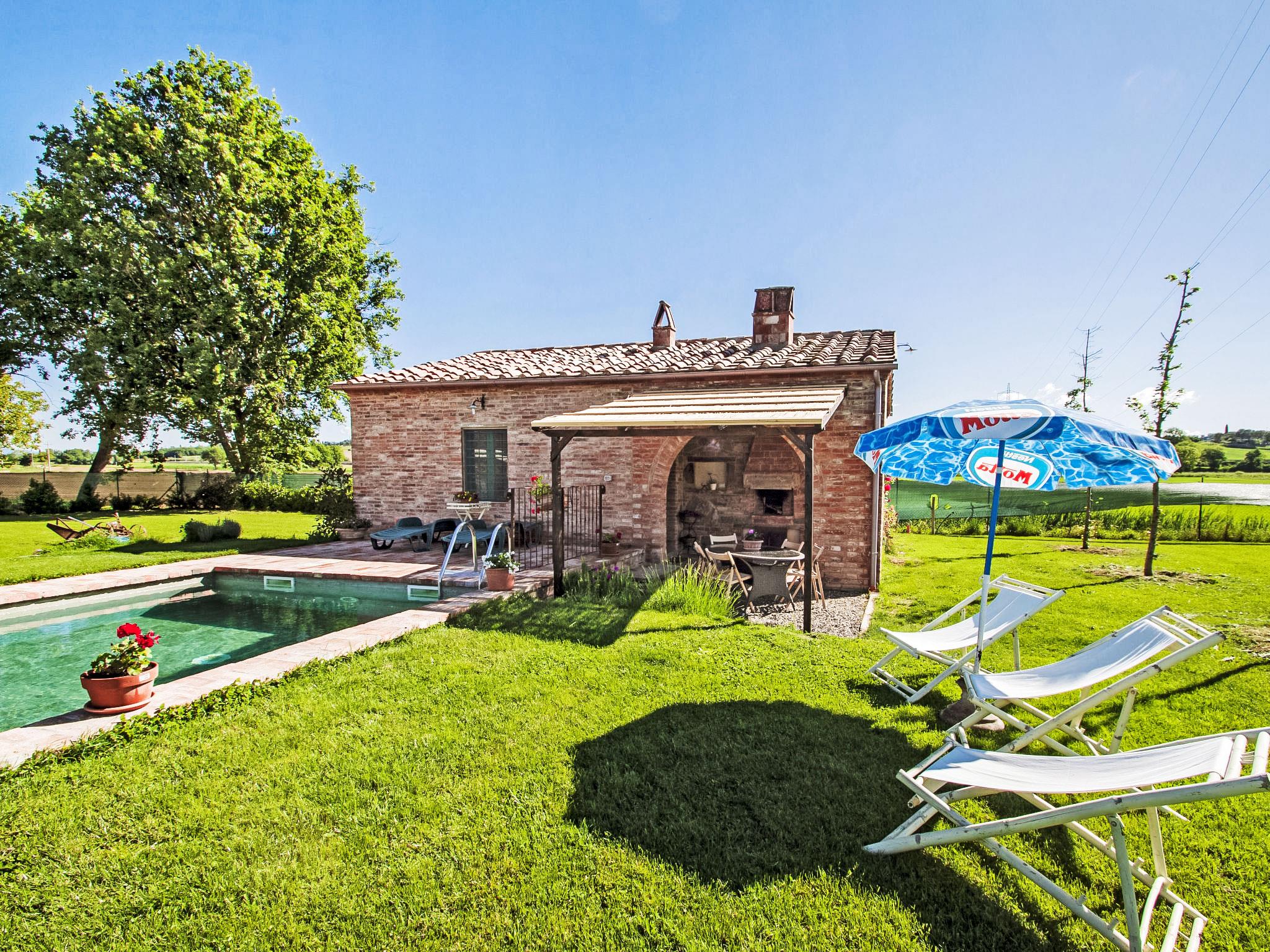Cosy single-family house "La Capannina", detached, renovated, surrounded by fields. Foiano della Chiana 6 km from the centre of Foiano della Chiana, in a sunny position, 25 km from the lake, in the countryside. For shared use: property 2'000 m2 (fenced). Private: garden 1'000 m2 (fenced), swimming pool (8 x 4 m, depth 150 cm, seasonal availability: 01.May. - 30.Sep.). Shower/WC in the pool area, pergola, garden furniture, barbecue, barbecue house. In the house: internet access. Motor access (1.5 km via unmade road). Parking on the premises. Shop 2 km, supermarket 5 km, shopping centre 3 km, restaurant 3 km, bus stop 5 km, thermal baths "Rapolano Terme" 23 km, bathing lake "Trasimeno" 25 km. Golf course (12 hole) 10 km, riding stable 3 km. Nearby attractions: Cortona 20 km, Montepulciano 20 km, Pienza 30 km, Castiglione Del Lago 31 km, Arezzo 32 km, San quirico D'Orcia 38 km. Please note: car recommended. Suitable for families. Object suitable for 4 adults + 1 child. The owner lives on the same property. The owner has a dog.