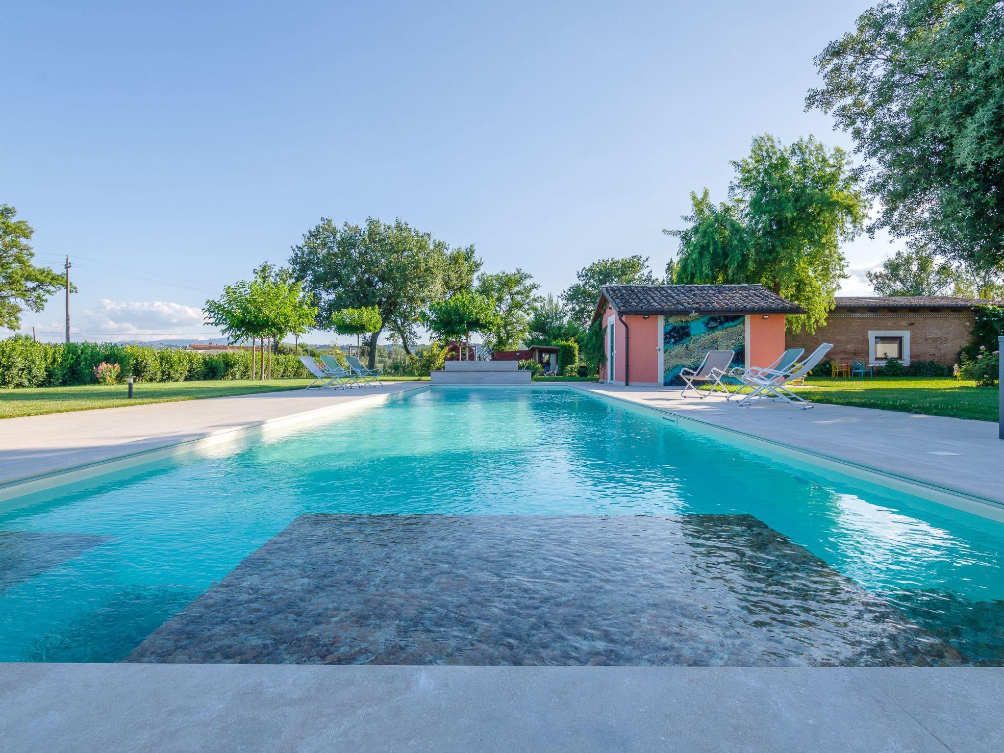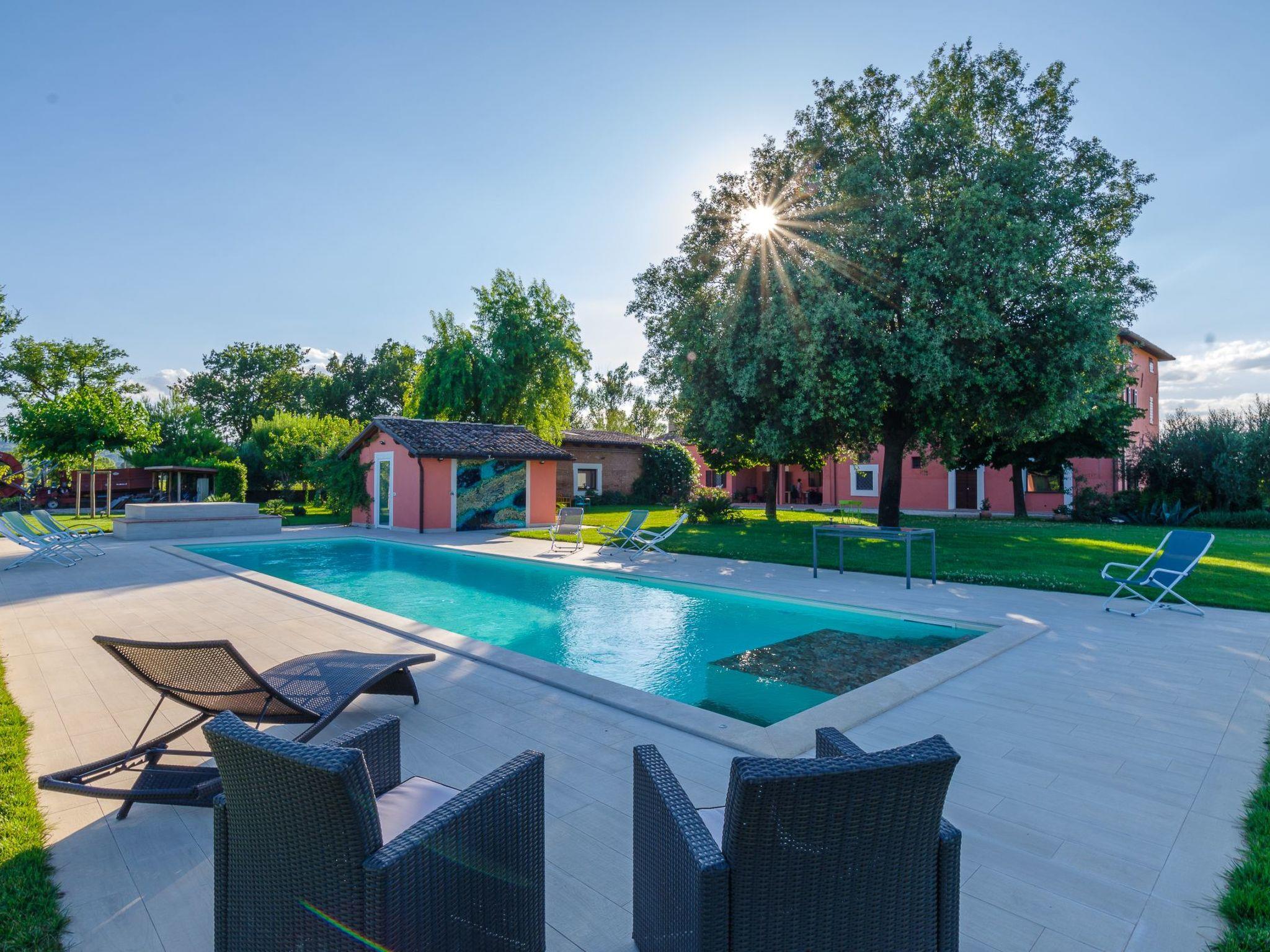 It is distinguished by the presence of a 15-metre-long swimming pool with hydro-massage corner, at lawn level, in a garden where you can relax and enjoy time in the open air, among shady trees and roses. The garden is equipped with tables, chairs, deckchairs and parasol.