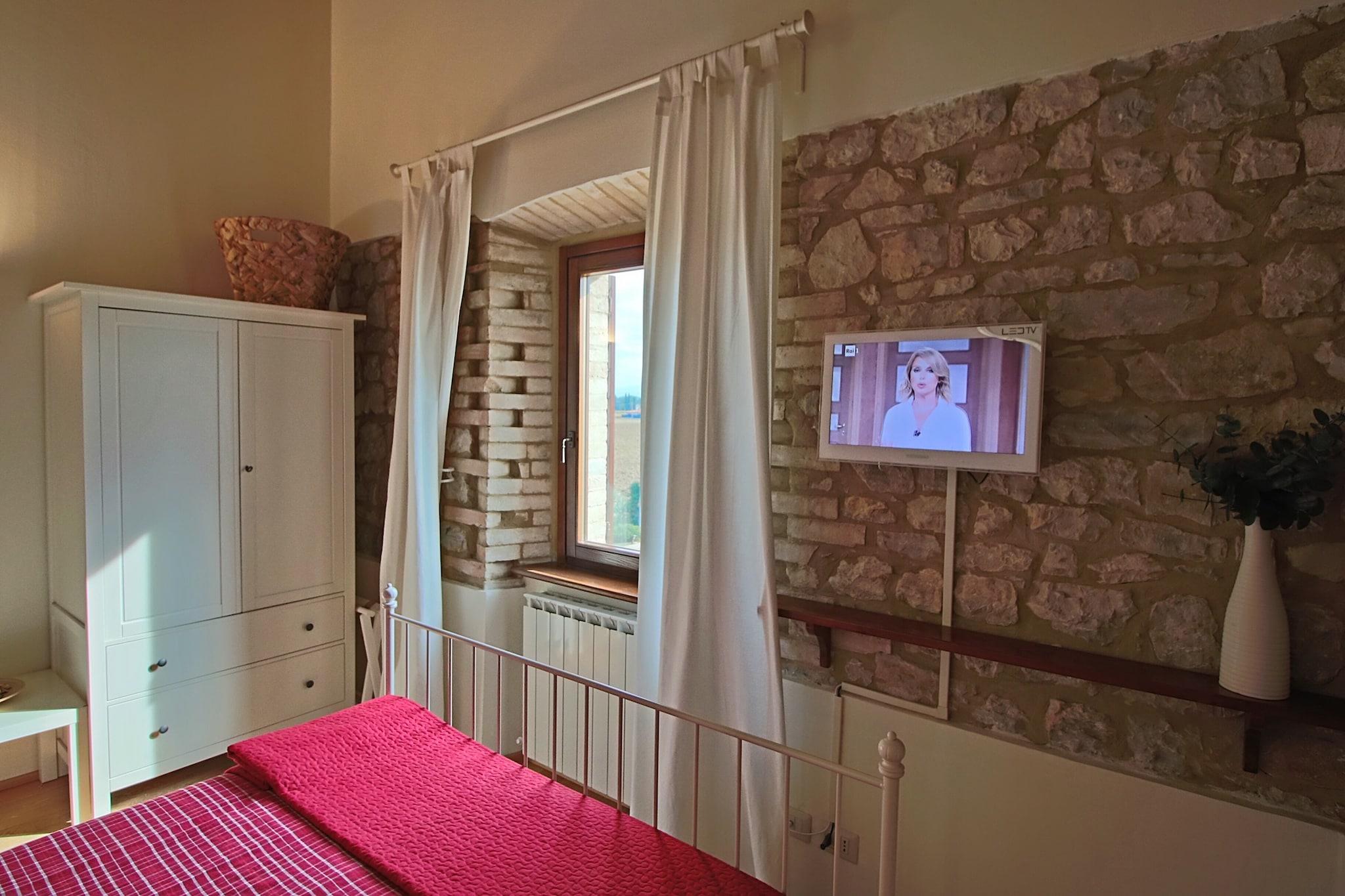Dette er et smukt restaureret gårdhus, som nu består af 5 lejligheder og en stor fælles have. Vælg friske grøntsager fra din egen have og lav en lækker middag! Ejeren vil give dig gode råd om de bedste restauranter og vingårde. Vejene i området er flade og meget praktiske på cykel. Disse er til leje på stedet. Gården ligger mellem Foligno (4 km) og Montefalco (9 km). Foligno er en livlig by med historiske bygninger, hyggelige butikker og mange restauranter. Foligno er også berømt for \ Giostra