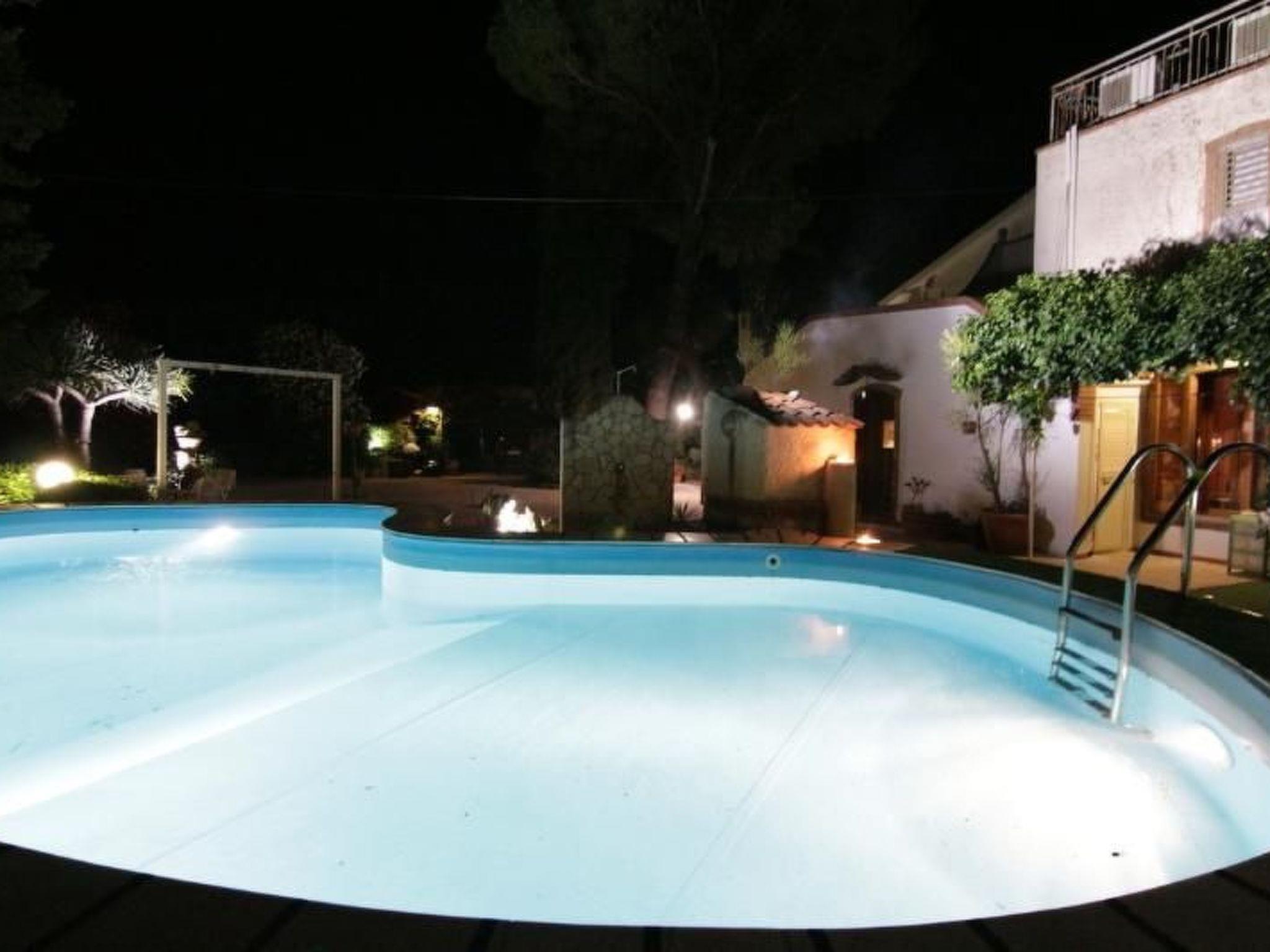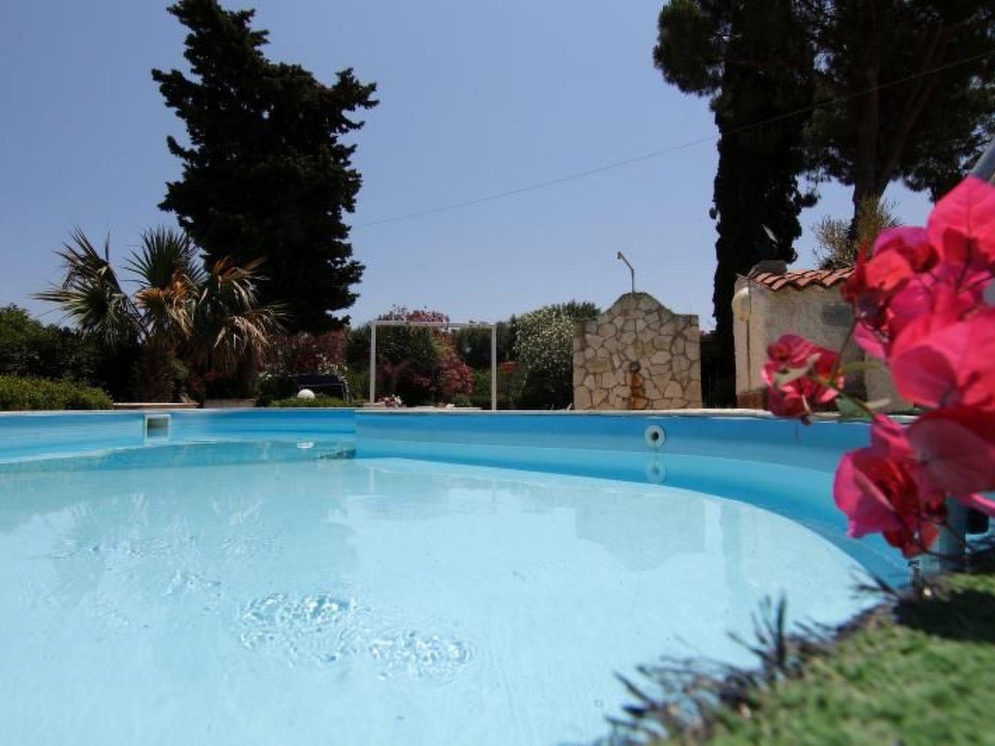 The entire property is fenced off. Access is through an automatic gate to a driveway of about 200 metres on which there are various parking spaces. The house is surrounded by a large and beautiful paved garden, equipped with umbrellas, deck chairs, rocking chair, hammock, table tennis, tables. The pool is half a metre high, the other half two metres. It is equipped with a neighbouring shower and night lighting.
