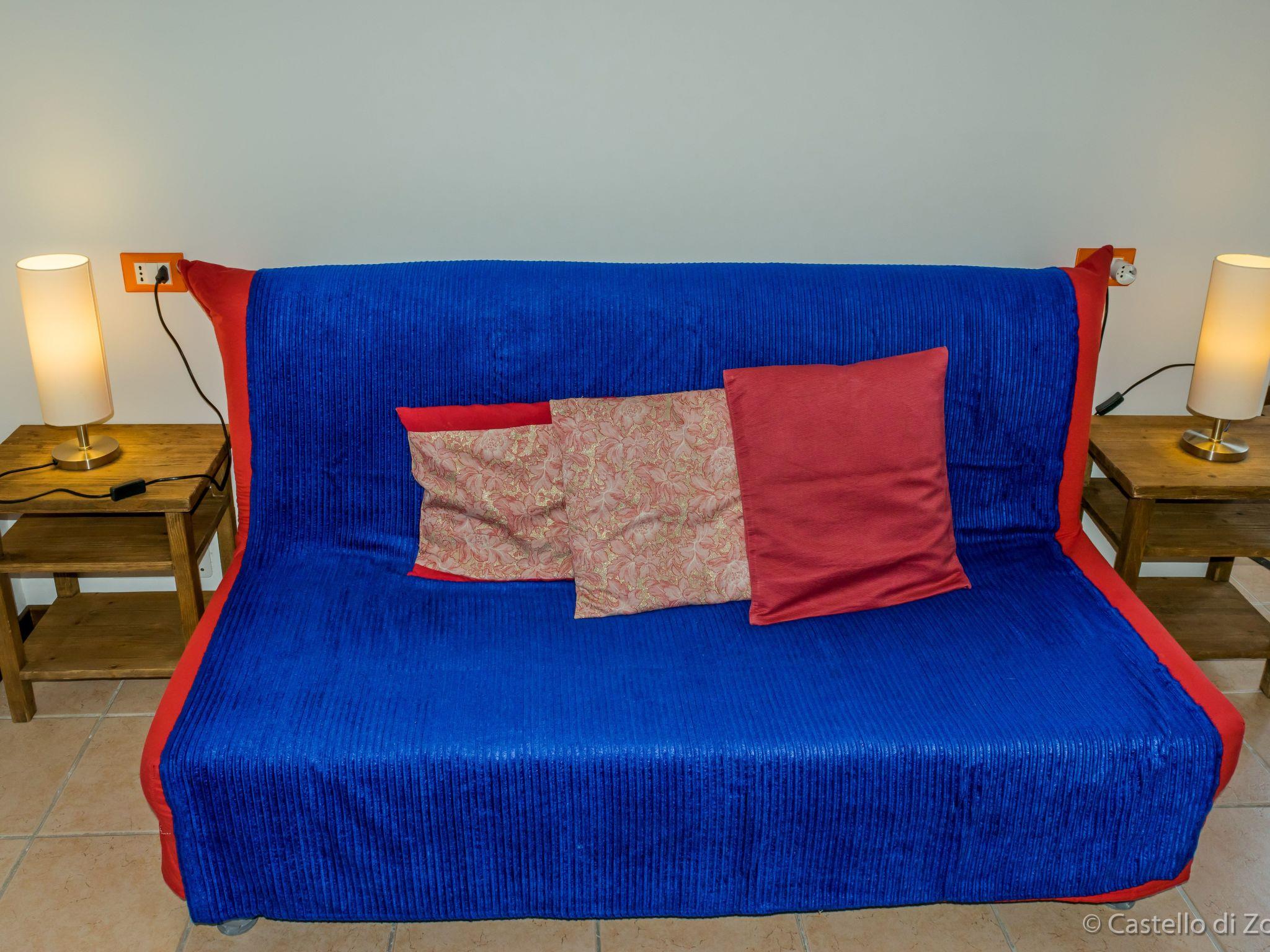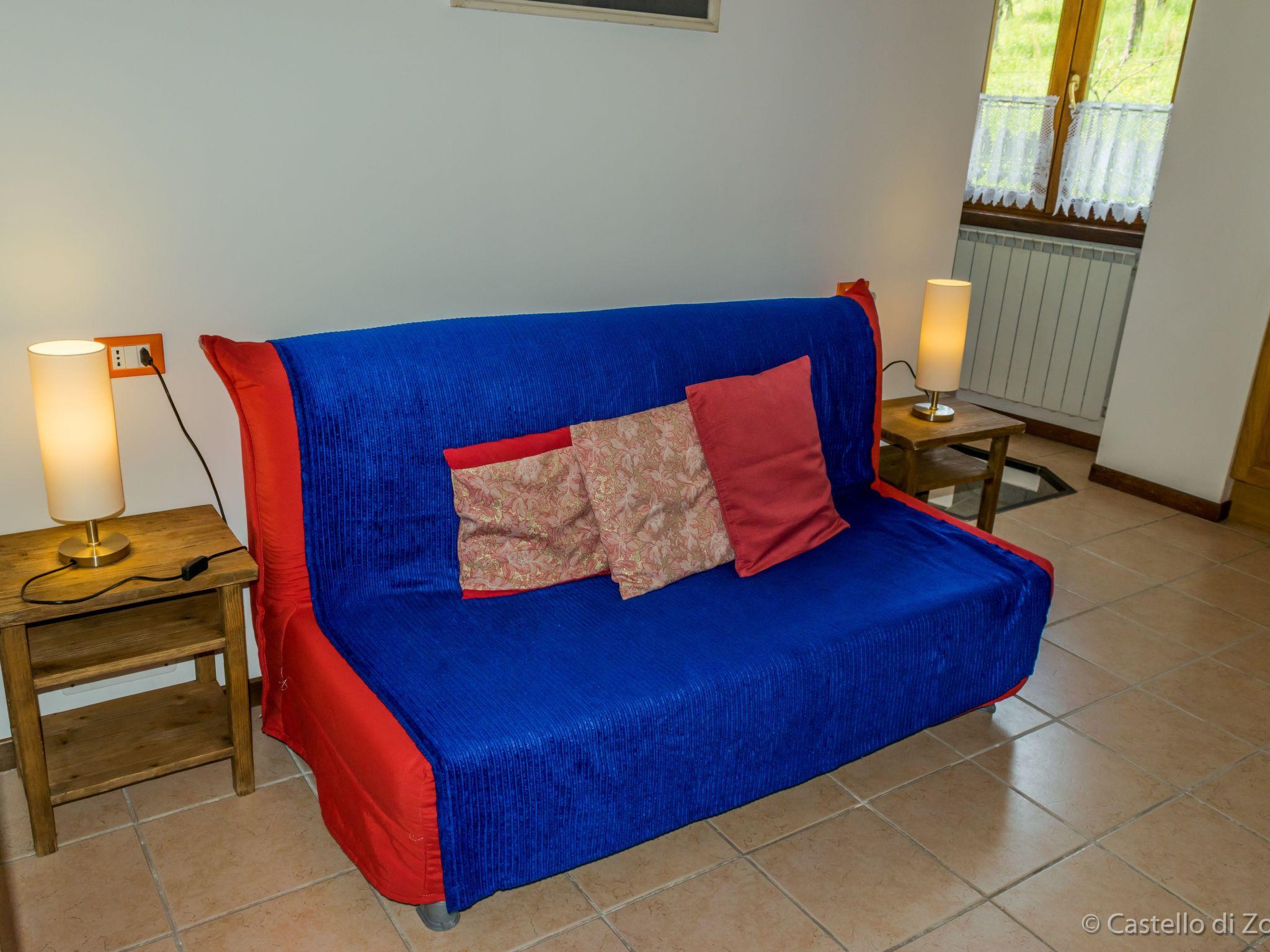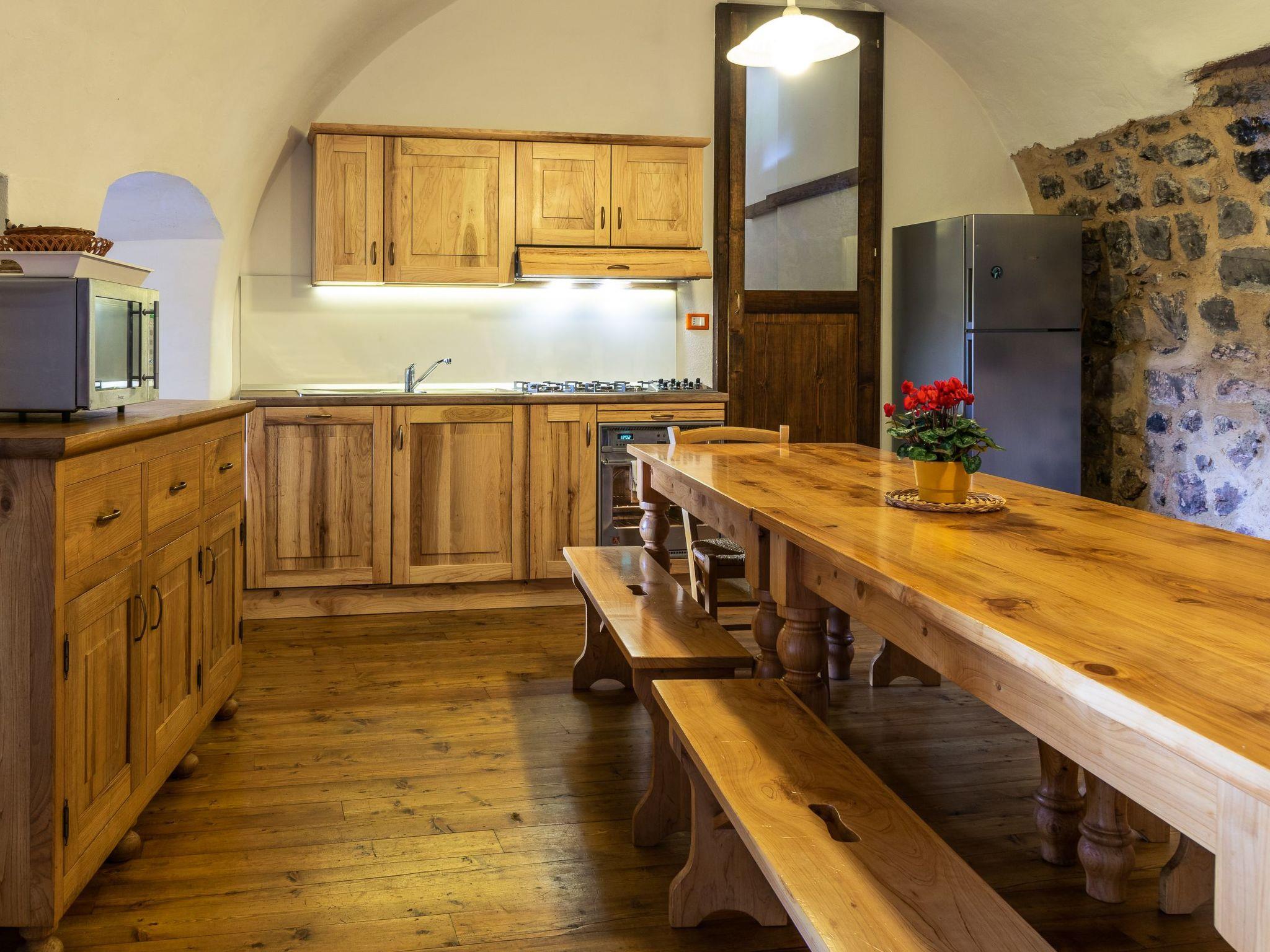 The large living room-kitchen with wooden floor and vaulted ceiling has two large dining tables with chairs, a sofa bed for two people and satellite smart-TV. It is equipped with a dishwasher, microwave, six-burner gas stove, oven and fridge with freezer.