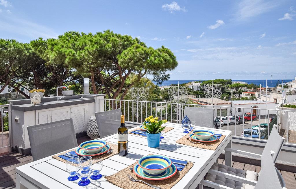 Lejlighedens force er terrassen med havemøbler og udekøkken. Her kan I tilberede lækre måltider og nyde stemningsfulde aftener med panoramaudsigt til havet.