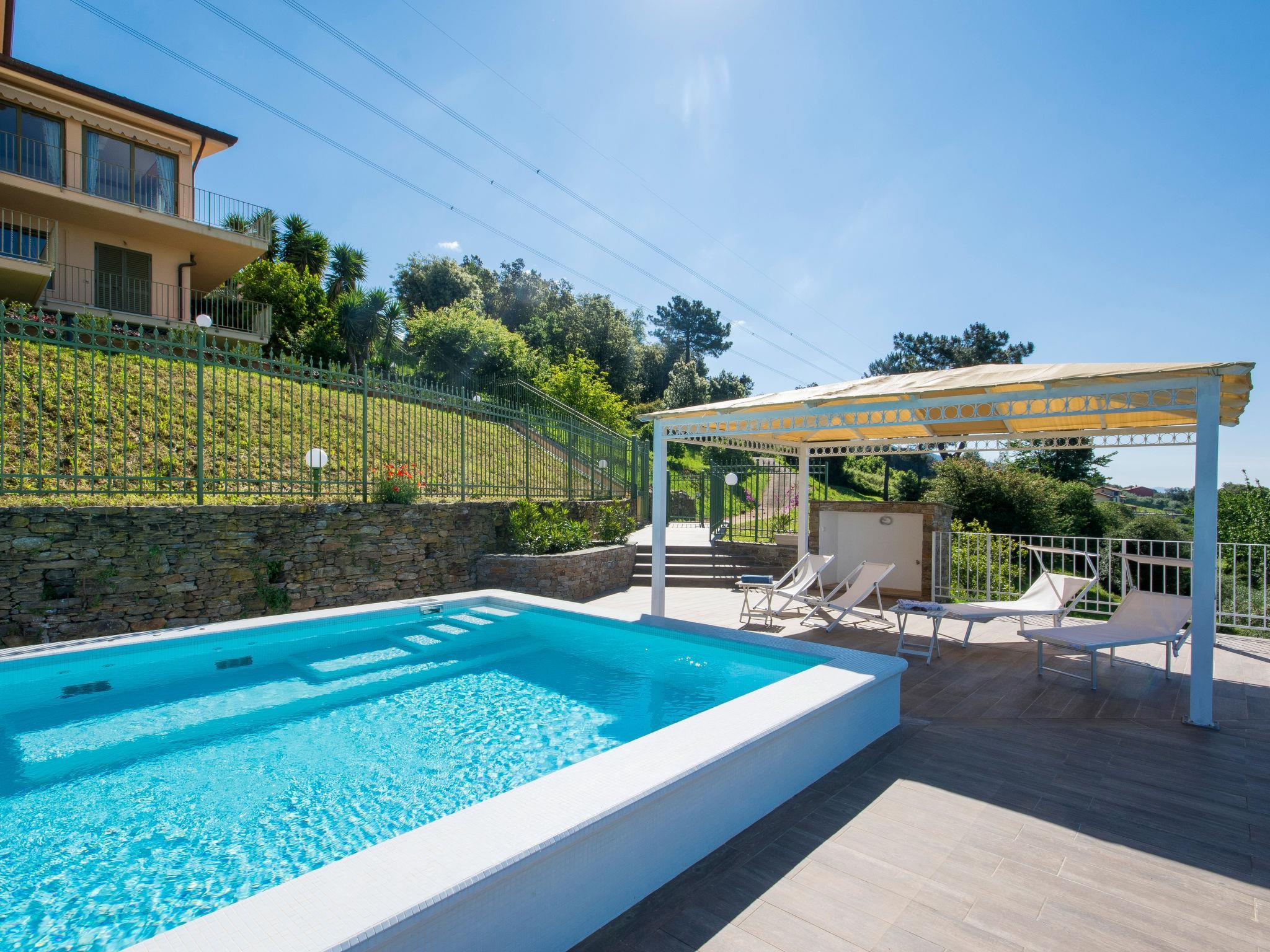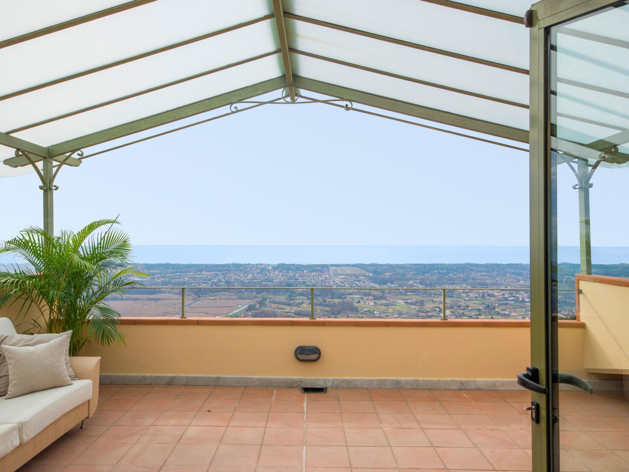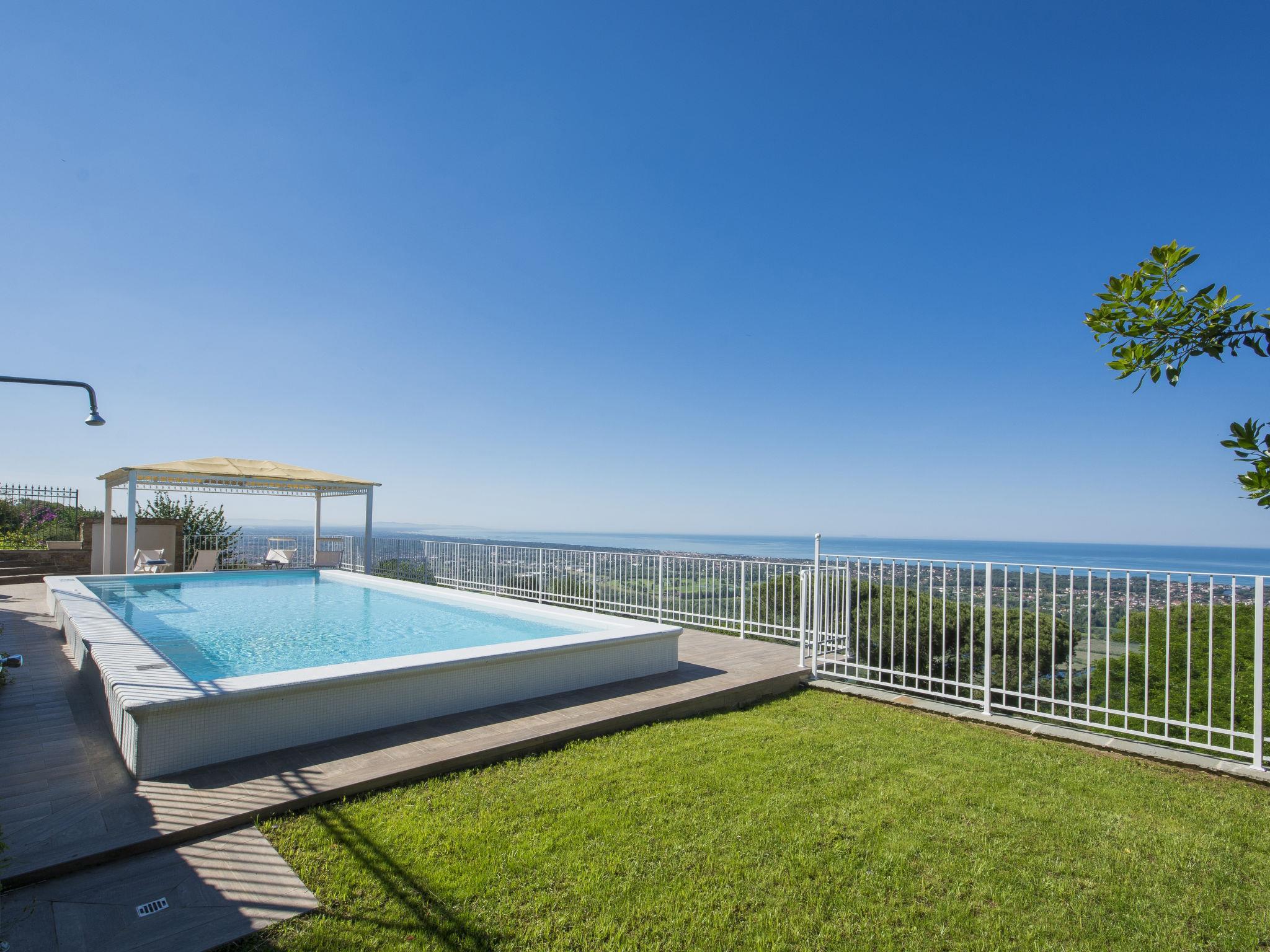 Villa Delfina is situated in an elevated position in the hills above Forte de Marmi, with views of the entire coastline. Its strategic position means that, while close to all of Versilia’s most famous attractions, the property is at the same time located in a quiet and private area, surrounded by green shrubs, succulents and colourful plants. Beautiful villa "Delfina", detached. In the hamlet Palatina 9 km from the centre of Forte de Marmi, in a sunny position on top of a hill, traffic calmed area, 8 km from the sea. Private: property 5'000 m2 (fenced), terraced garden with lawn and wildlife garden, swimming pool fenced (12 x 8 m, depth 140 cm, seasonal availability: 01.May. - 15.Oct.). Outdoor shower, patio, arbour, garden furniture. In the house: internet access, burglar alarm system, washing machine, heating available only from 01.Nov. - 15.Apr.. Linen change (suppl. charge extra). Parking at the house. Grocery 2 km, supermarket 5 km, restaurant 1 km, bus stop 3 km, railway station "Forte dei Marmi" 7 km, sandy beach "Cinquale" 8 km, thermal baths "San Carlo" 5 km, lake Massaciuccoli 30 km. Marina 15 km, golf course (18 hole) 7 km, sailing school 8 km, tennis 8 km. Nearby attractions: Terme della Versilia 8 km, Pietrasanta 9 km, Lucca 45 km, Pisa 50 km, Cinque Terre 60 km, Firenze 90 km. The house is fully equipped with all amenities and has a delightful garden with pool and furnished area with gazebo and sun loungers, where guests can relax while enjoying the spectacular sea view.