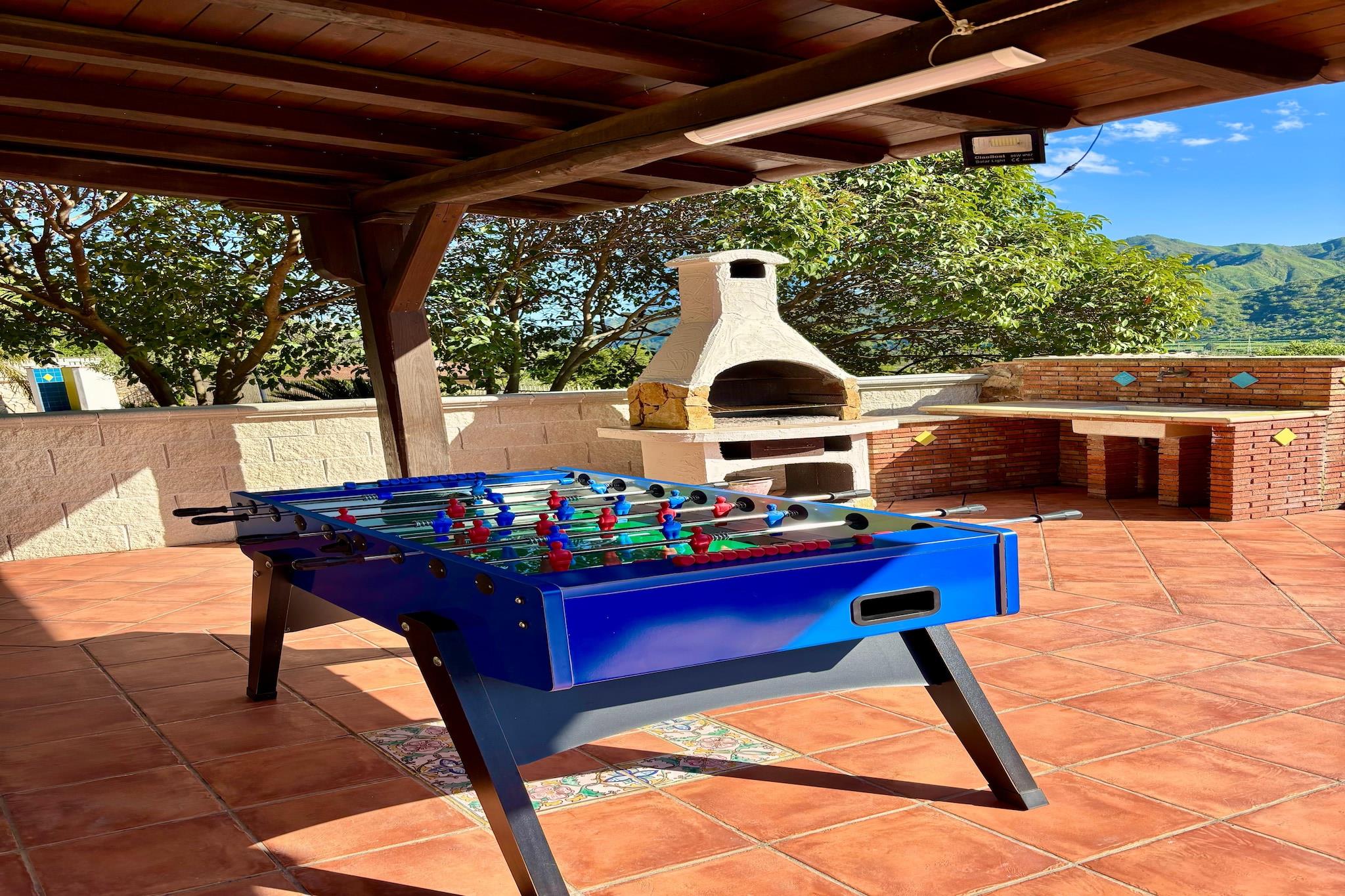 Stueetage: (Stue(Fjernsyn, pejs, sofahjørne, klimaanlæg), badeværelse(bruser, håndvask, toilet)) På 1. etage: (soveværelse(dobbeltseng), soveværelse(enkeltseng, enkeltseng), badeværelse(badekar, håndvask, toilet, bidet)) Kælderetage: (køkken-alrum(spisebord, elkedel, brødrister, komfur(Komfur med fem kogeplader, gas), emhætte, kaffemaskine, ovn, mikrobølgeovn, køle-fryseskab)) bruser, terrasse(overdækket), have, havemøbler, grill, parkering, liggestole, Parasol, swimmingpool(privat, udendørs, opened from 1/2 Apr upto and including Oct)