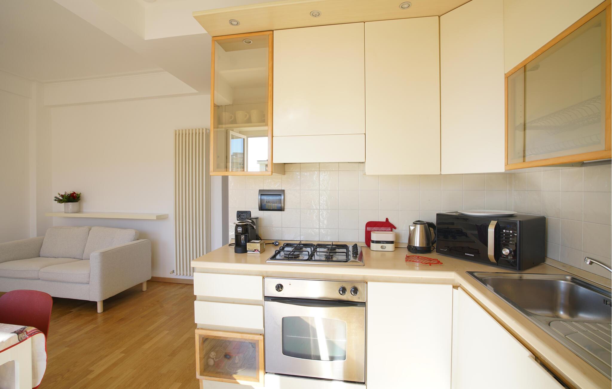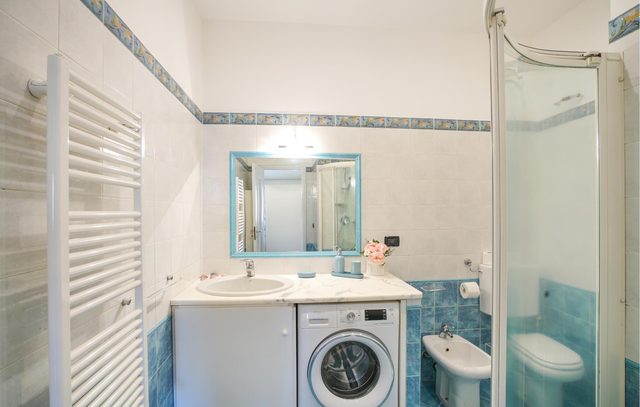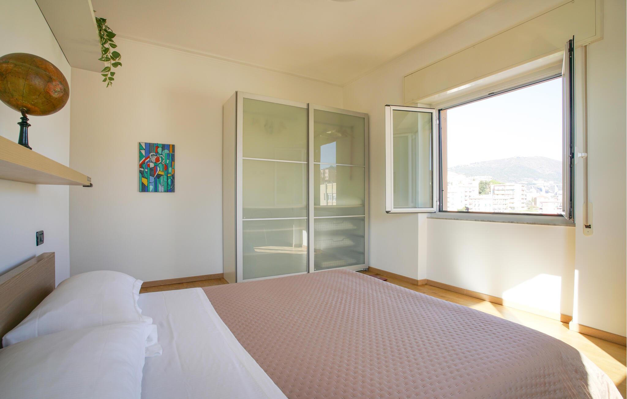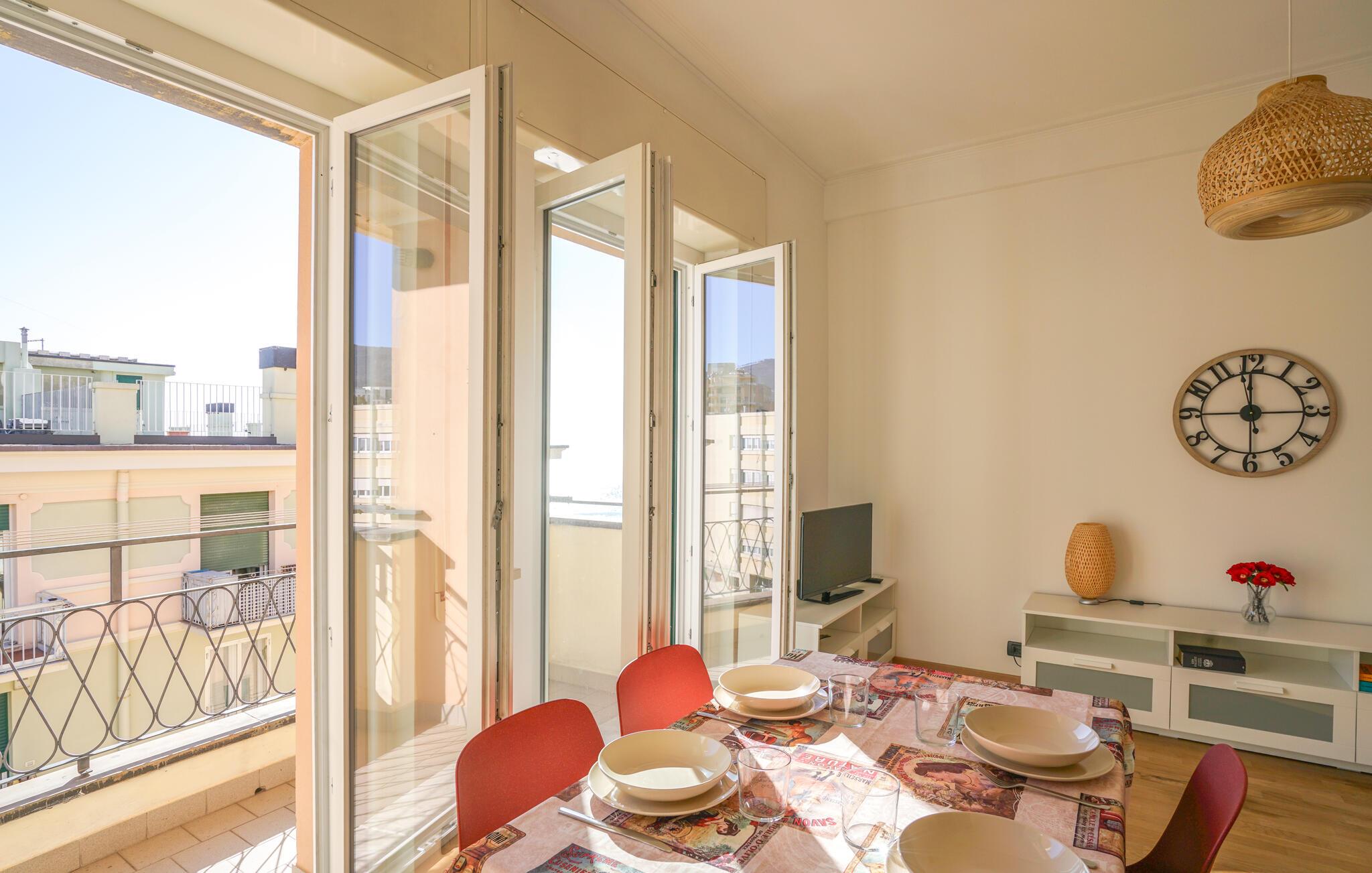 Denne lyse og smagfuldt indrettede ferielejlighed tilbyder jer det ideelle sted at kombinere Genovas rige kulturelle tilbud med en afslappende strandferie. Tilbered jeres måltider i det lyse køkken og nyd dem ved det indbydende spisebord. Afslut aftenen på sofaen, stream en film eller fordyb jer i en bog fra det interne bibliotek.